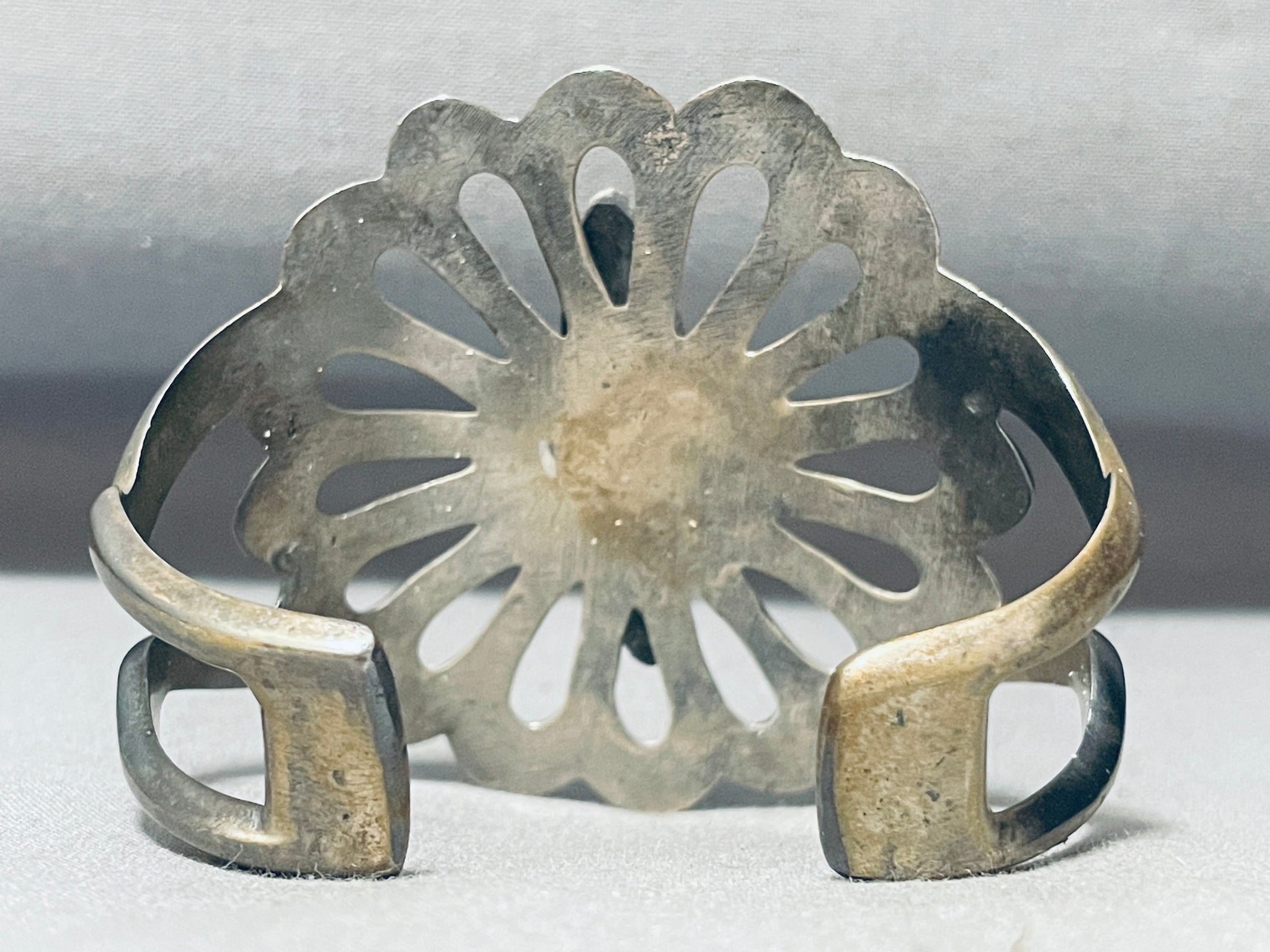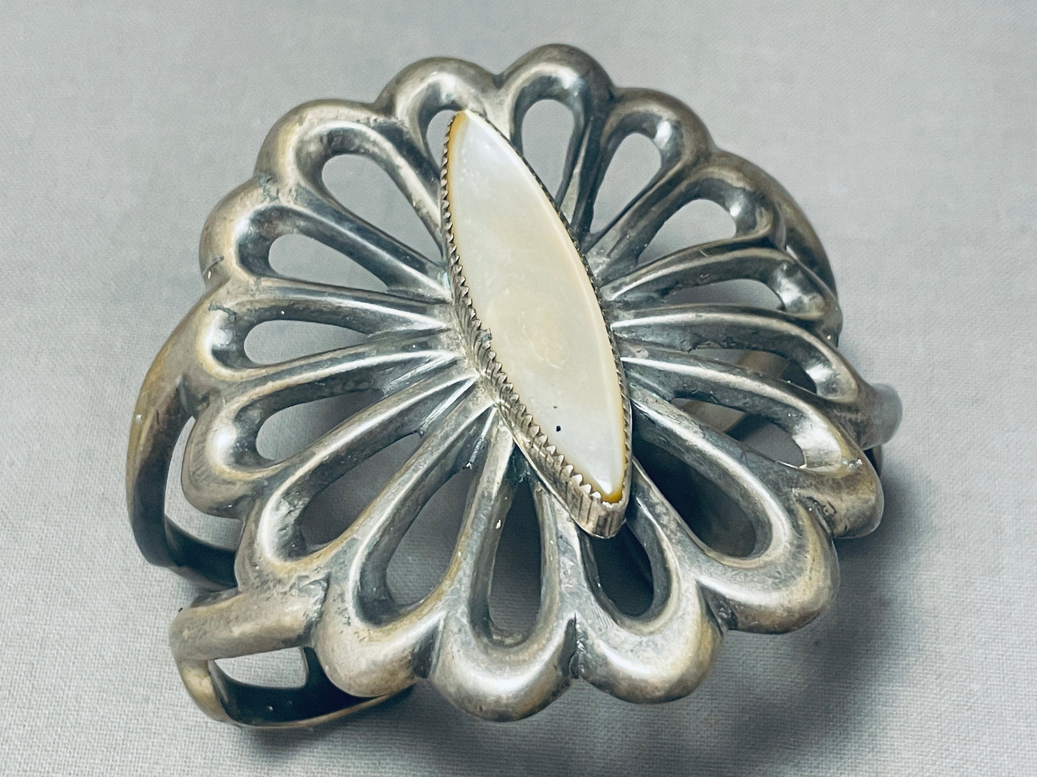 This is an astonishing Navajo very large and thick silver bracelet. This remarkable bracelet contains a completely hand casted silver cuff that is a beautiful flower shape in the center. The silver flower section of the bracelet hold a phenomenal large long mother of pearl shell. The bracelet turns into a wonderful double silver shank at both ends. I love how thick and sturdy this bracelet is. The center stone measures around 1-1/2" x 3/8". The width of the bracelet measures around 2-1/2". Sterling silver. Cir. 1980's+ . The inside end to end measures around 5-3/4" with an additional 1" gap. Sturdy 75 grams.