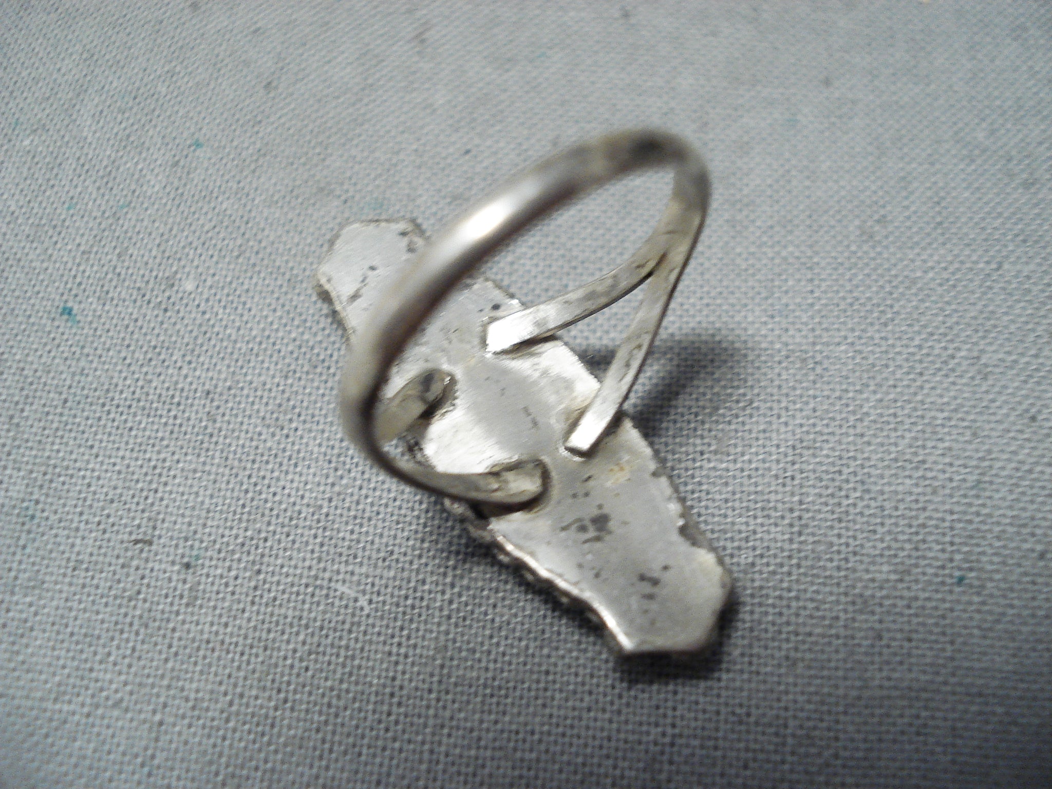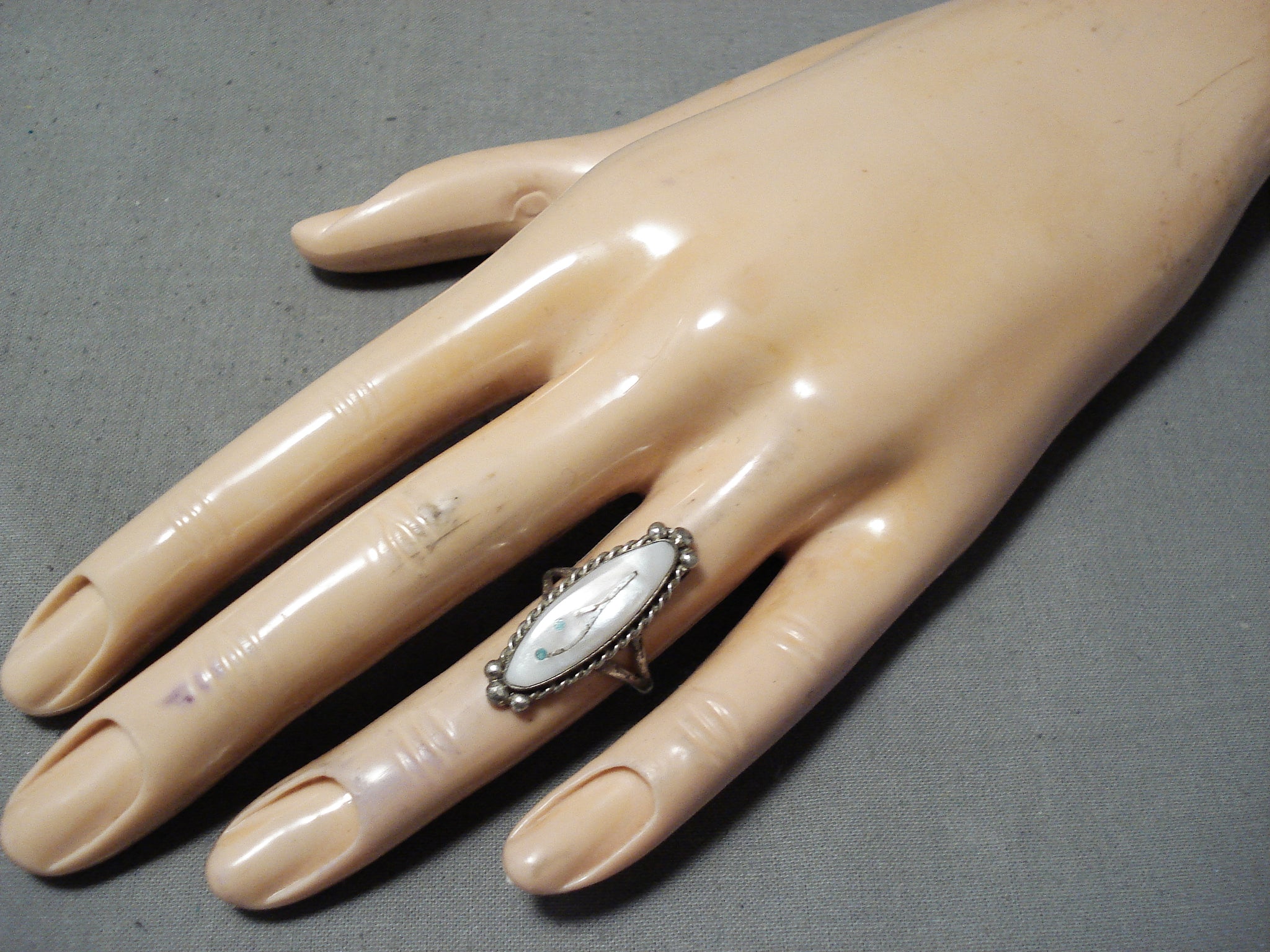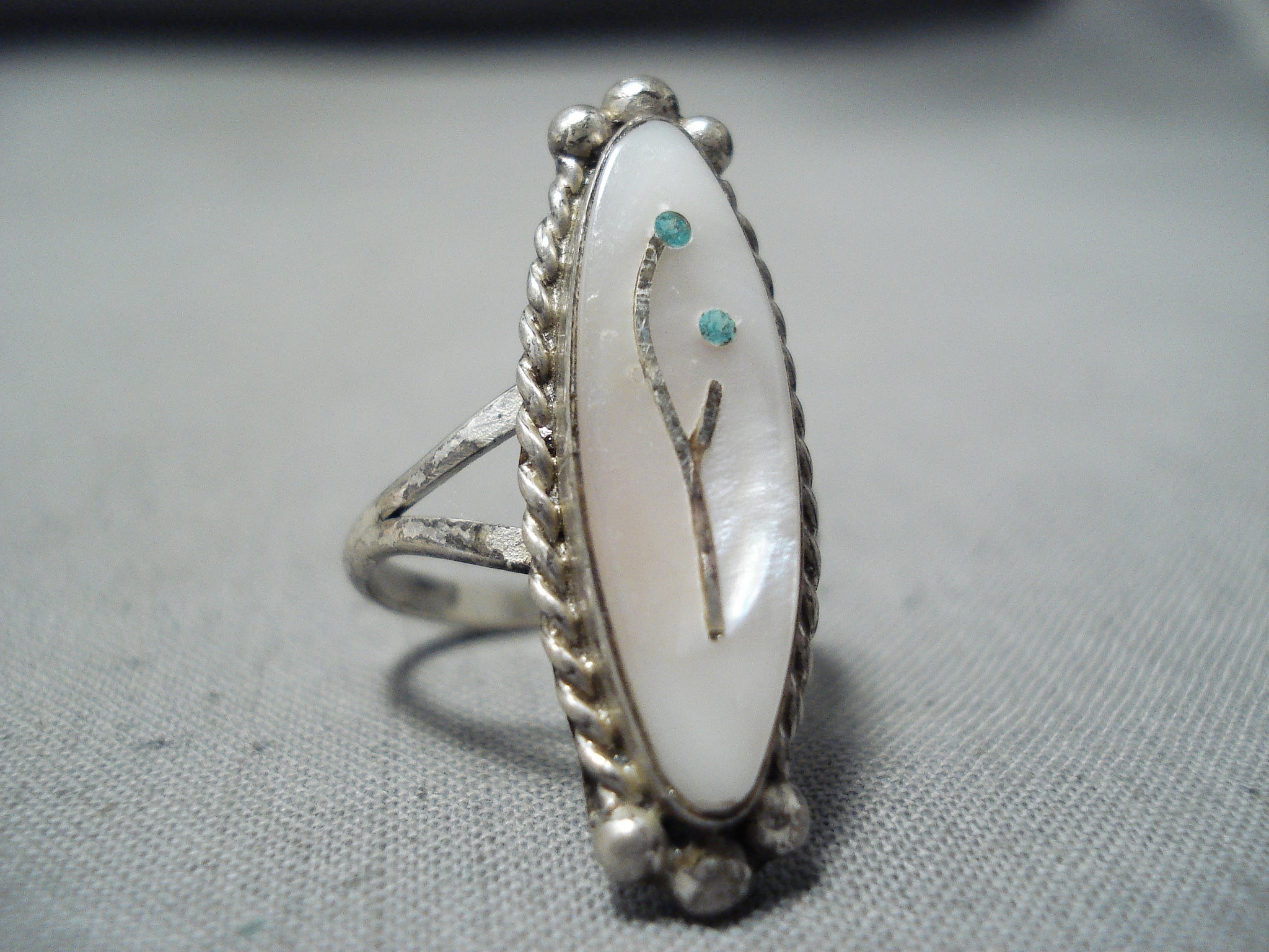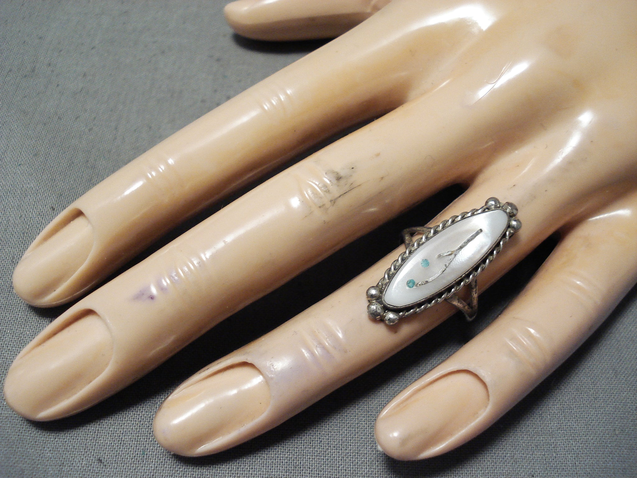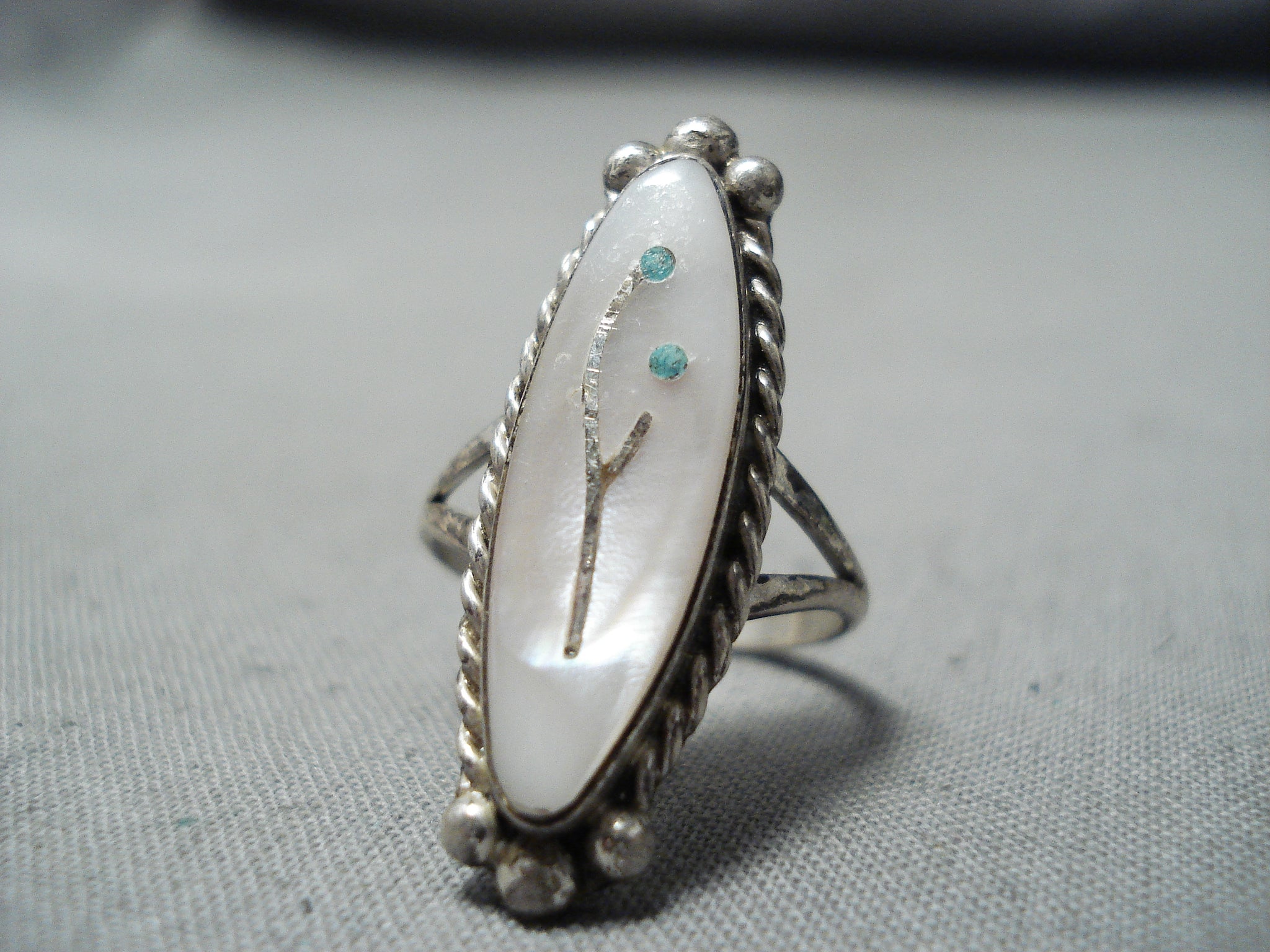 This is a superior vintage Navajo inlaid silver ring. This wonderful ring contains amazing inlay of mother of pearl and turquoise stones and are inlaid into a beautiful floral pattern. Surrounding the face of the ring is a beautiful silver rope with accenting raindrops. The ring face measures around 1-1/8" x 3/8". The ring size is around 5.5. Cir. Mid century . Sterling silver. Sturdy 3 grams.