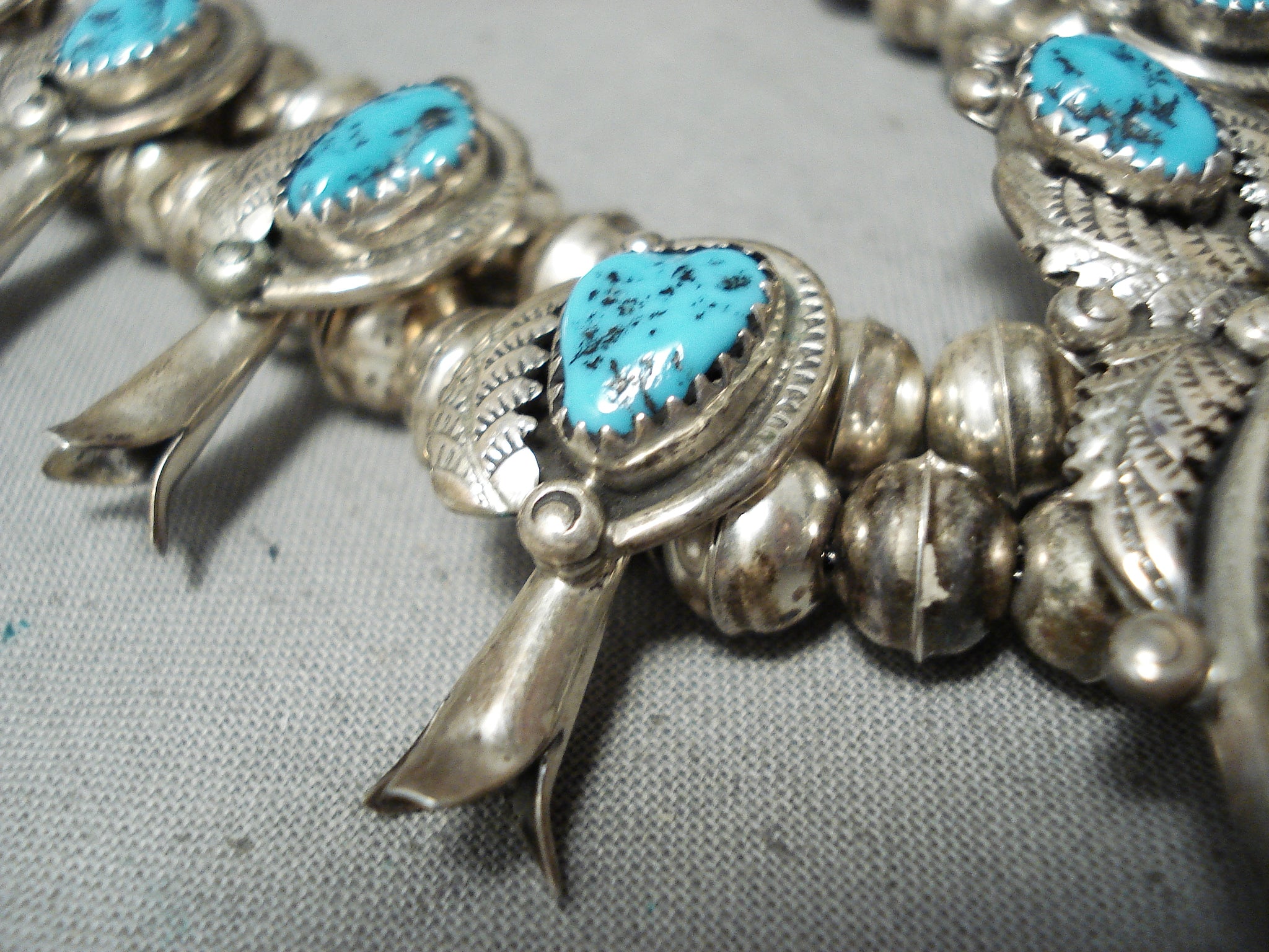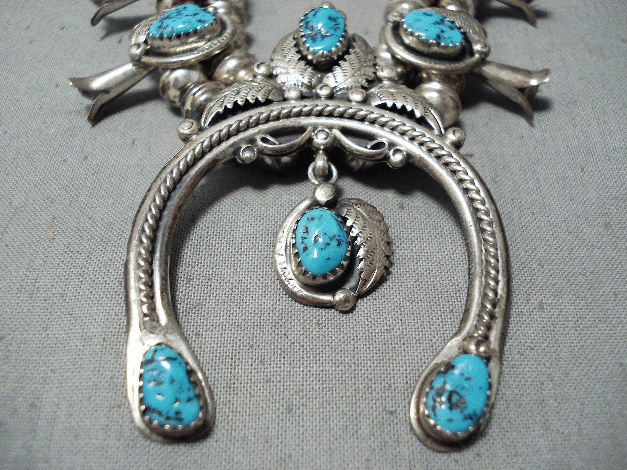 Beautiful Vintage Native American Navajo Turquoise Sterling Silver Squash Blossom Necklace