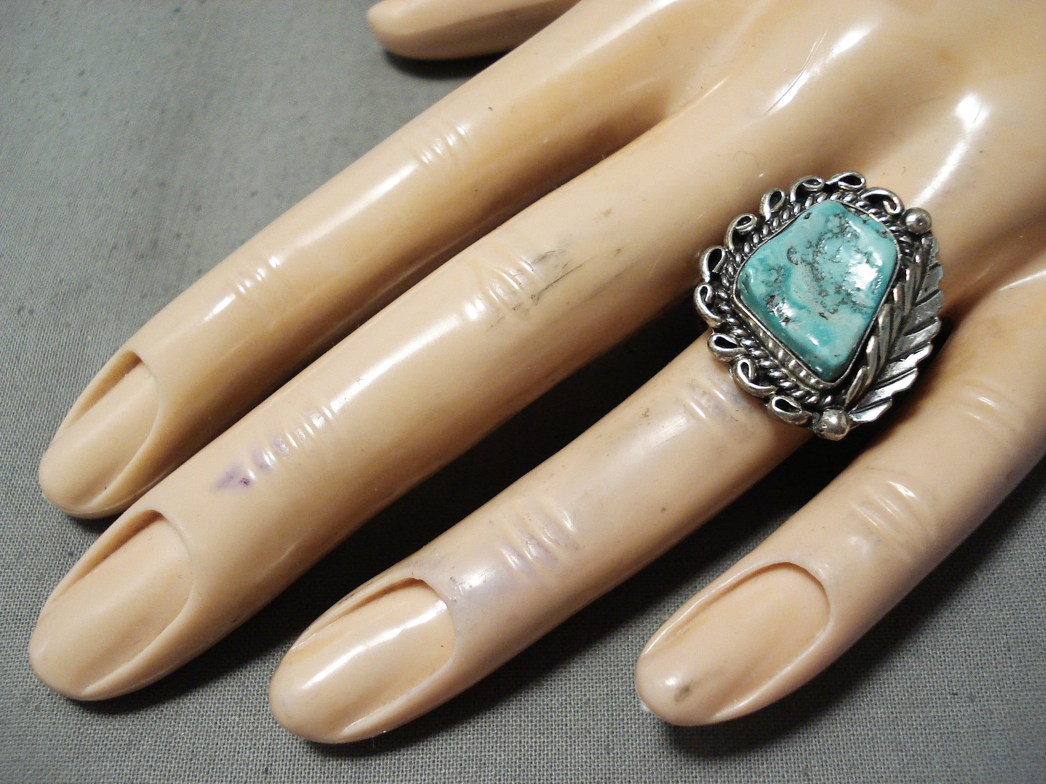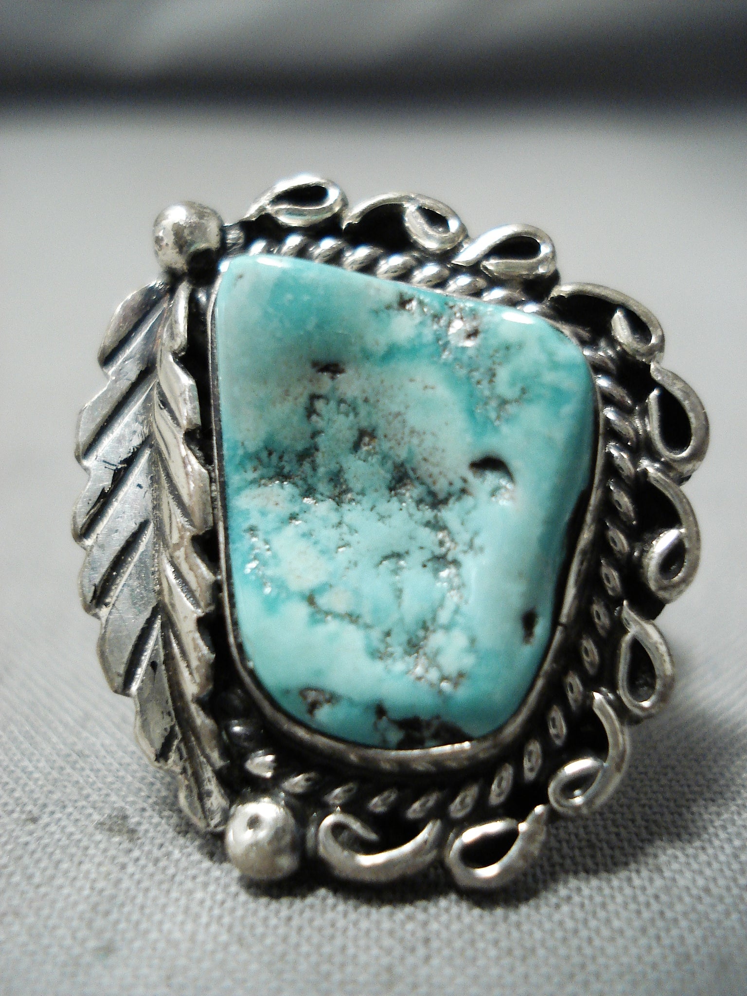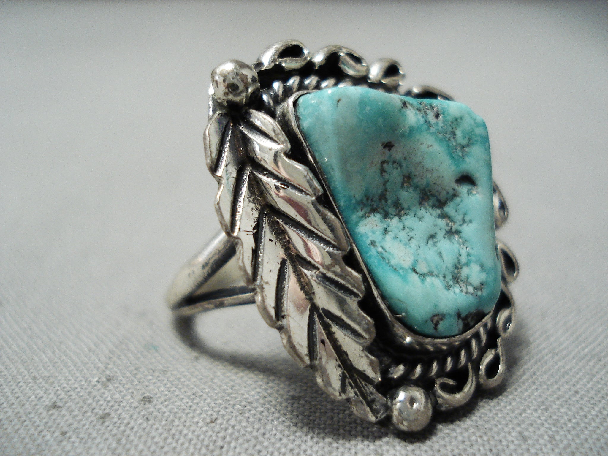 This is a striking vintage Navajo single stone silver ring. This piece contains a remarkable and unique shaped single turquoise stone that appears to be from the old Sleeping Beauty turquoise mine. Surrounding the stone are wonderful silver works that consist of stems, ropes, raindrops and a large accenting hand carved silver leaf. I just love the intricacy on this ring. The center stone measures around 5/8" x 3/8". The ring face measures around 1" x 7/8". The ring size is around 7.5. Cir. Mid century . Sterling silver. Sturdy 6 grams.