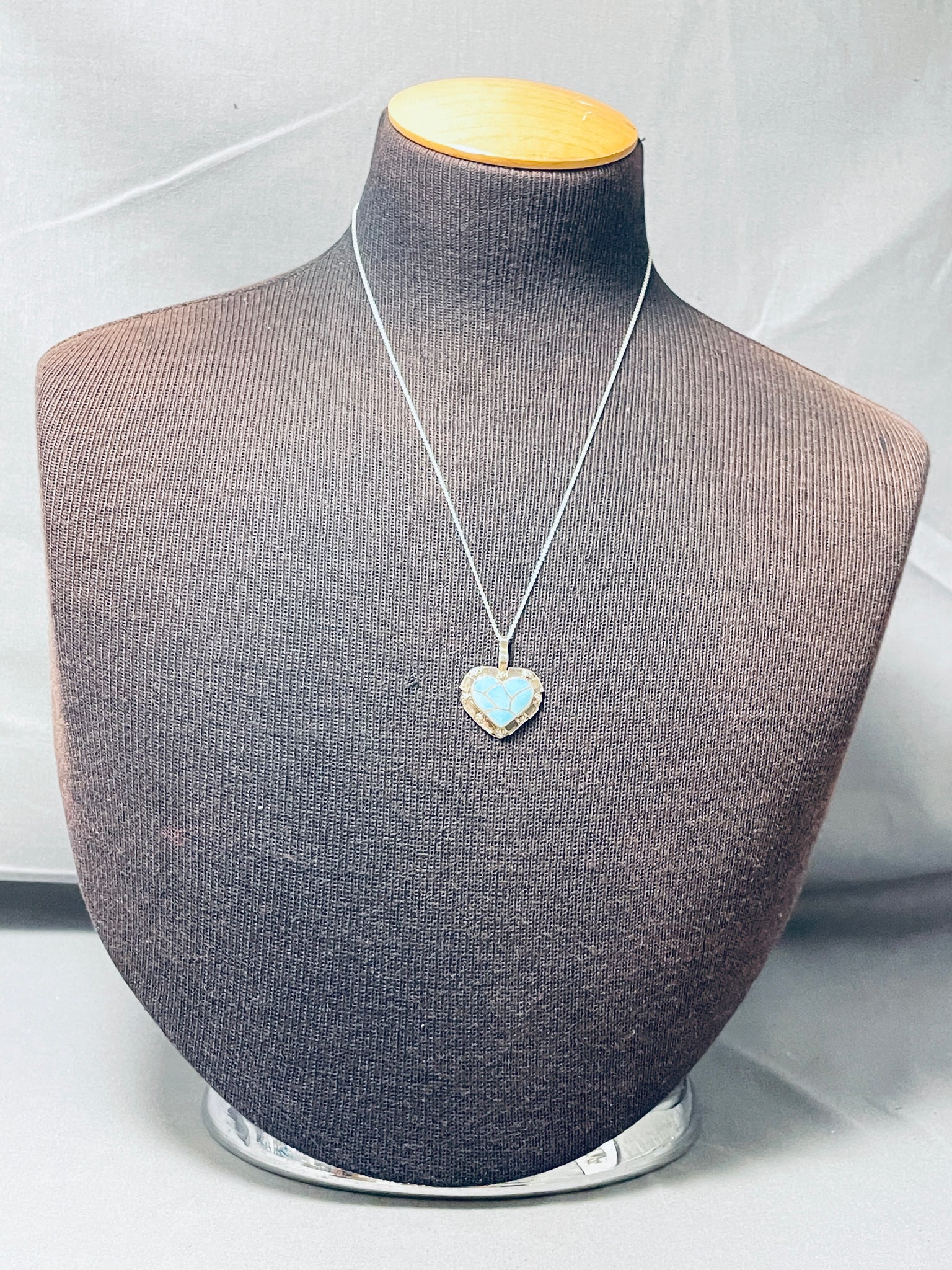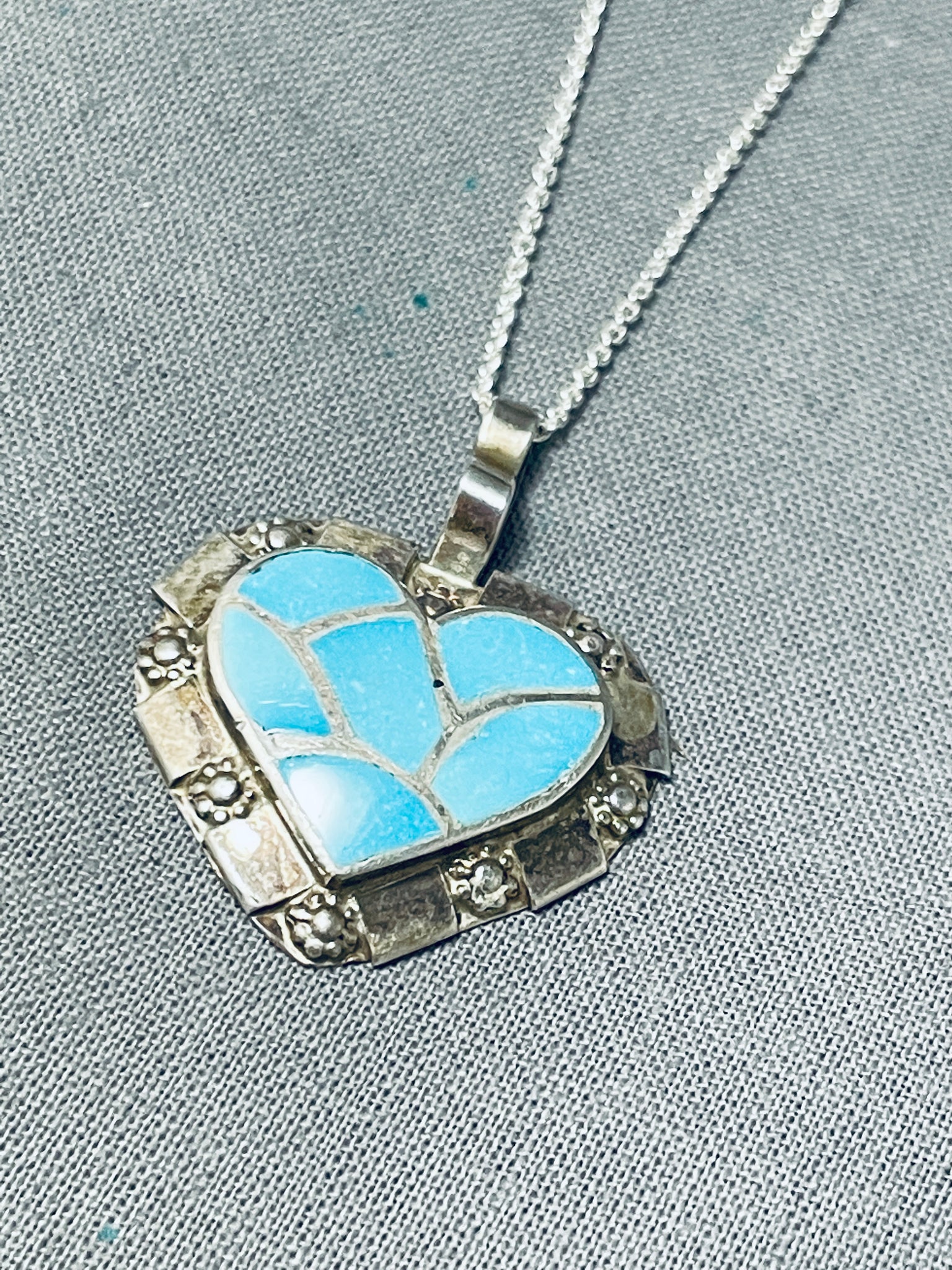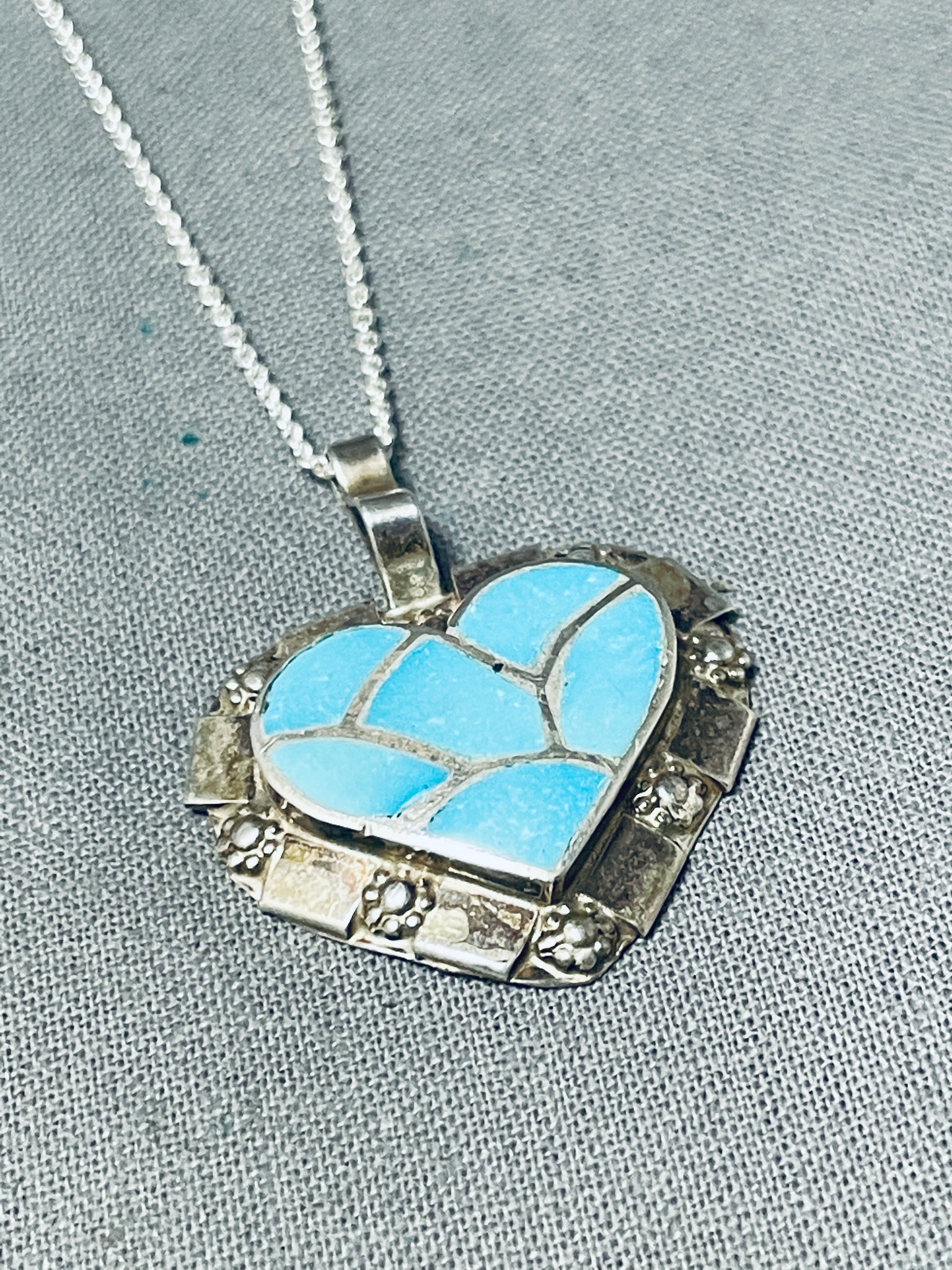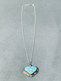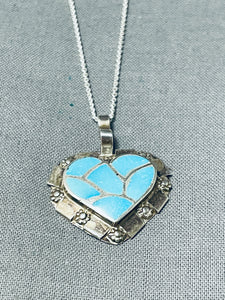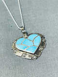 Beautiful Vintage Native American Zuni Blue Gem Turquoise Sterling Silver Heart Necklace