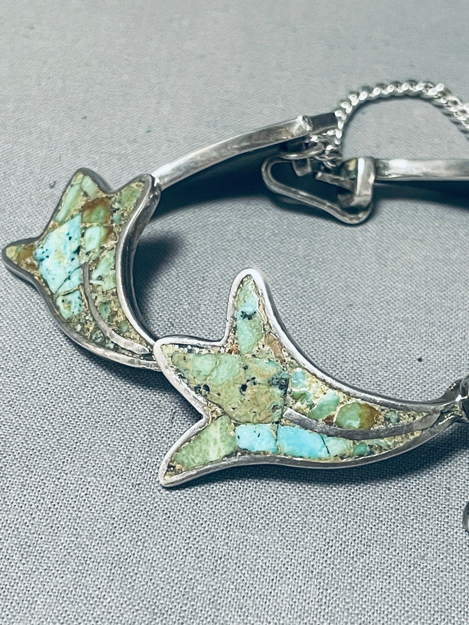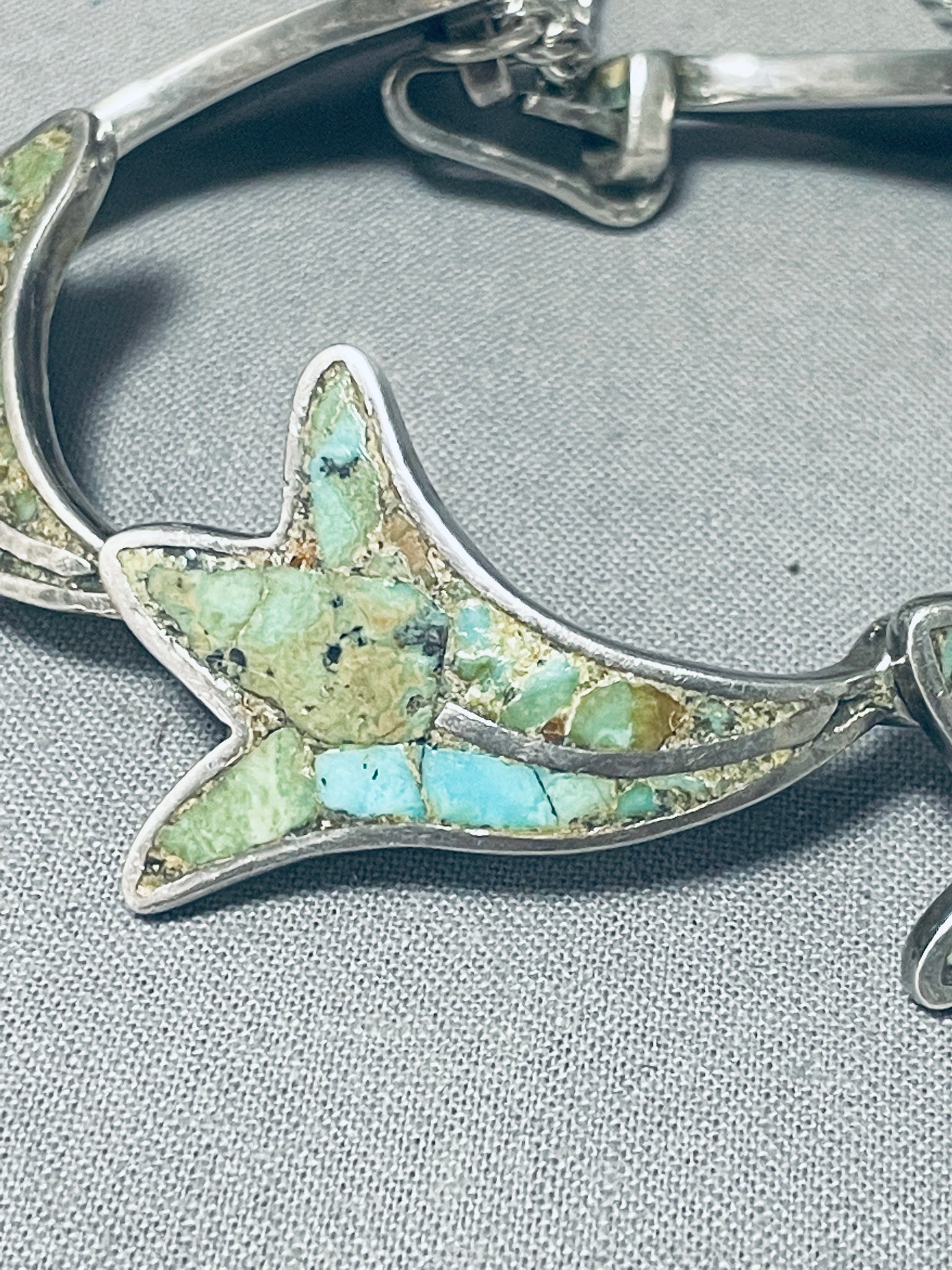 This is an amazing vintage Navajo inlaid thick and sturdy silver link bracelet. This remarkable bracelet contains 6 outstanding hand inlaid leaf pattern silver links that each measure around 1-1/4" X 7/8". The thickness of each inlaid silver link is just incredible. I love the additional added safety clasp this bracelet contains. This bracelet can fit a wrist size of about 7-1/2". Sterling silver. Cir. 1930's+. Sturdy 40 grams.
