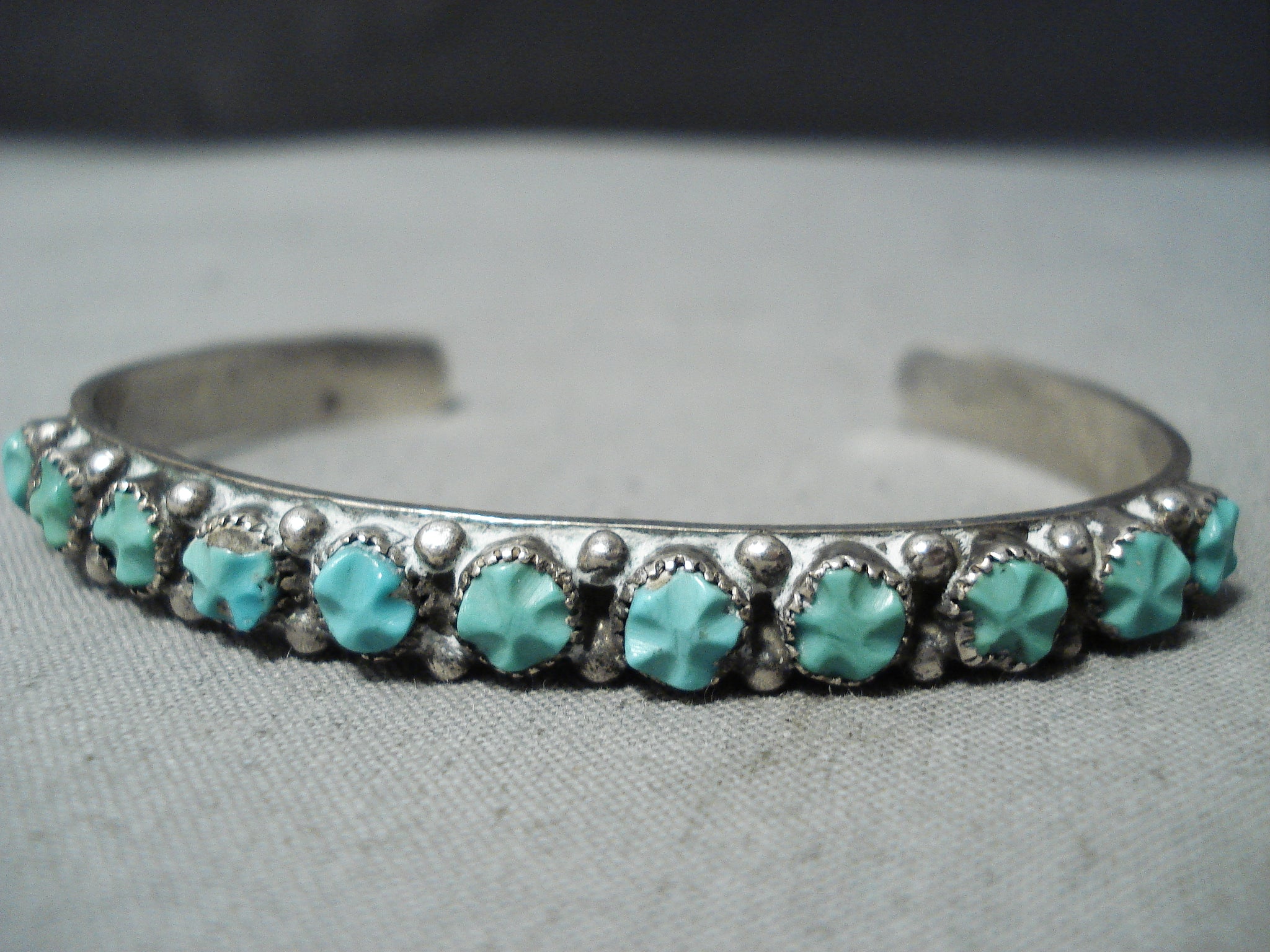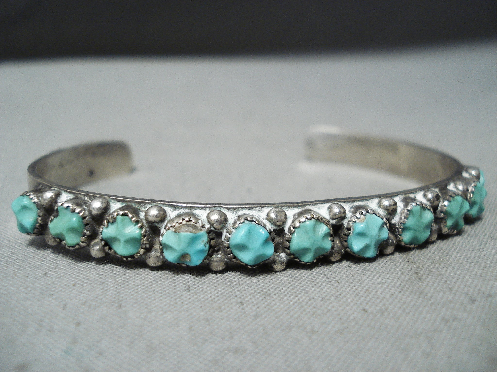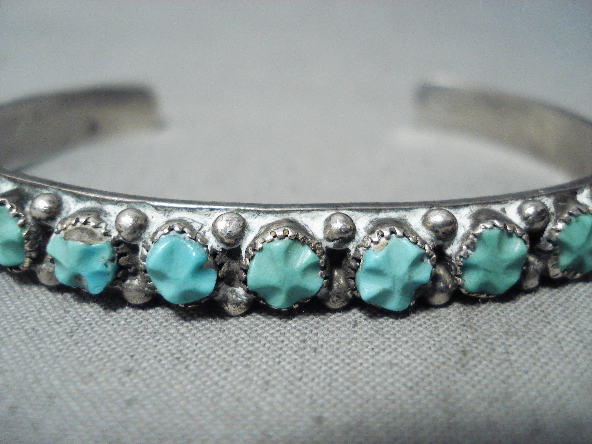 Here we have an exceptional vintage Zuni silver bracelet having 11 handcarved Blue Gem turquoise stones with dual silver beads all across the handcarved solid silver cuff! Absolutely Amazing! The stones measure around 1/4" x 1/4". The width of the bracelet measures around 1/4". Signed by Zuni artist, Ben Haley. Sterling silver. Cir. 1960's. The inside end to end measures around 5-1/4" with an additional 1-1/4" gap. Sturdy 15 grams.