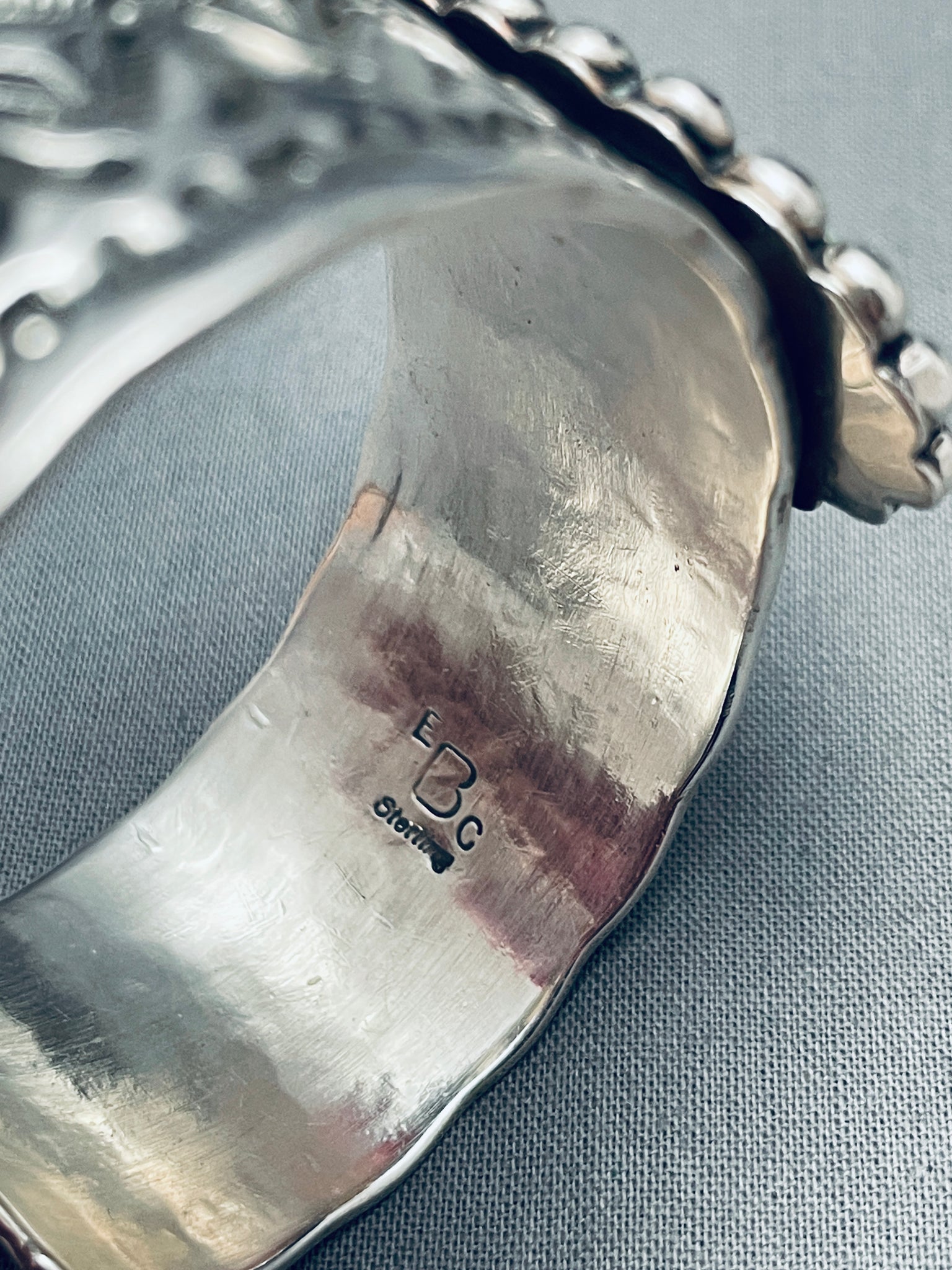 This is a superior vintage Southwestern large single stone silver cuff bracelet. This wonderful bracelet contains a stunning oval shaped spiderweb turquoise stone that appears to be from the Lone Mountain turquoise mine. Surrounding the stone are stunning large silver raindrops with an accenting silver rope. Running down the ends of the wide and thick silver cuff are outstanding stamp works. The stamp works consist of teepee patterns, plant patterns, dotted works, and sun stampings. The center stone measures around 7/8" x 1/2". The width of the bracelet measures around 1-1/2". Signed by artist, Elroy & Bern Chavez. Sterling silver, marked. The inside end to end measures around 5-1/2" with an additional 1" gap. Sturdy 64 grams.