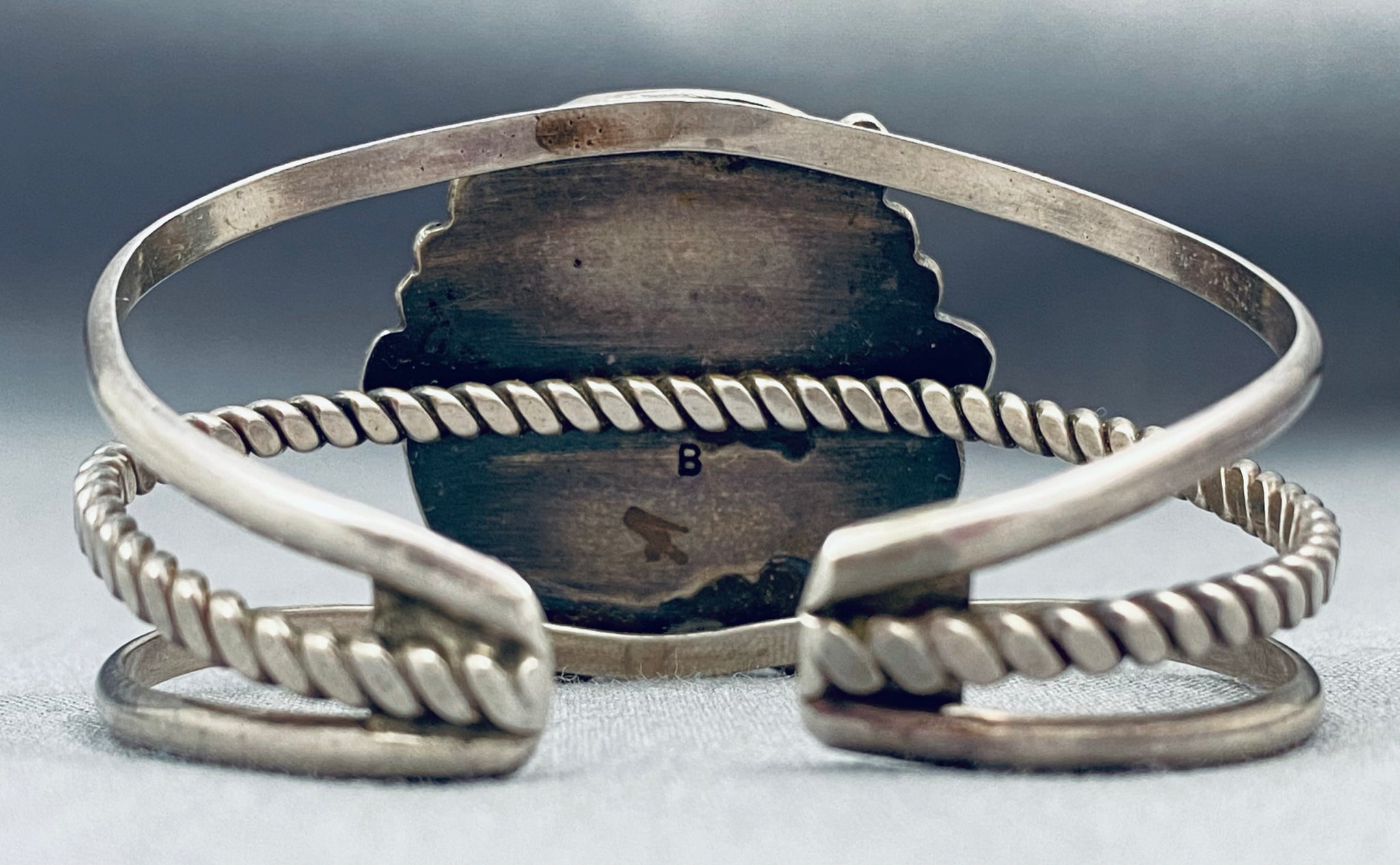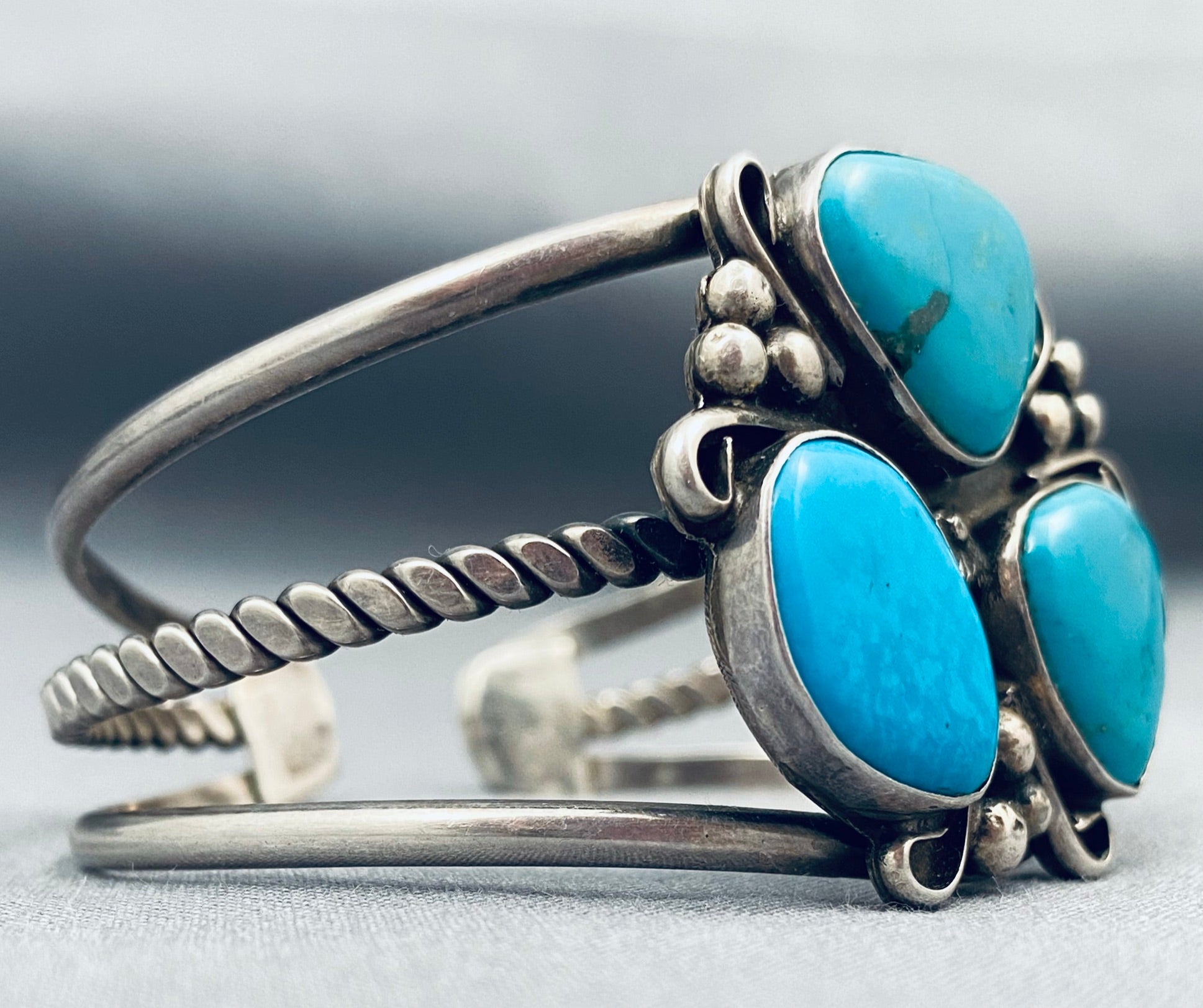 Here we have an astonishing vintage Navajo bracelet featuring 3 turquoise stones, a handcarved silver star, silver beads, and silver stems, on a graduated triple rail silver cuff with the middle rail being silver rope! So Noteworthy! The largest stone measures around 3/4" x 1/2". The width of the bracelet measures around 1-3/8". Signed by Navajo artist, Bertha Smith. Sterling silver. The inside end to end measures around 5-3/4" with an additional 1" gap. Sturdy 32 grams.