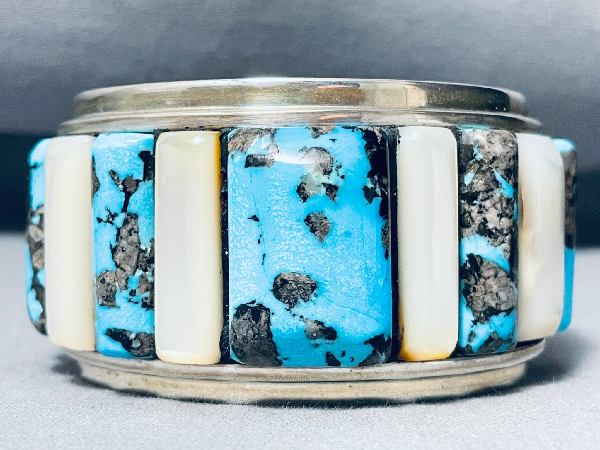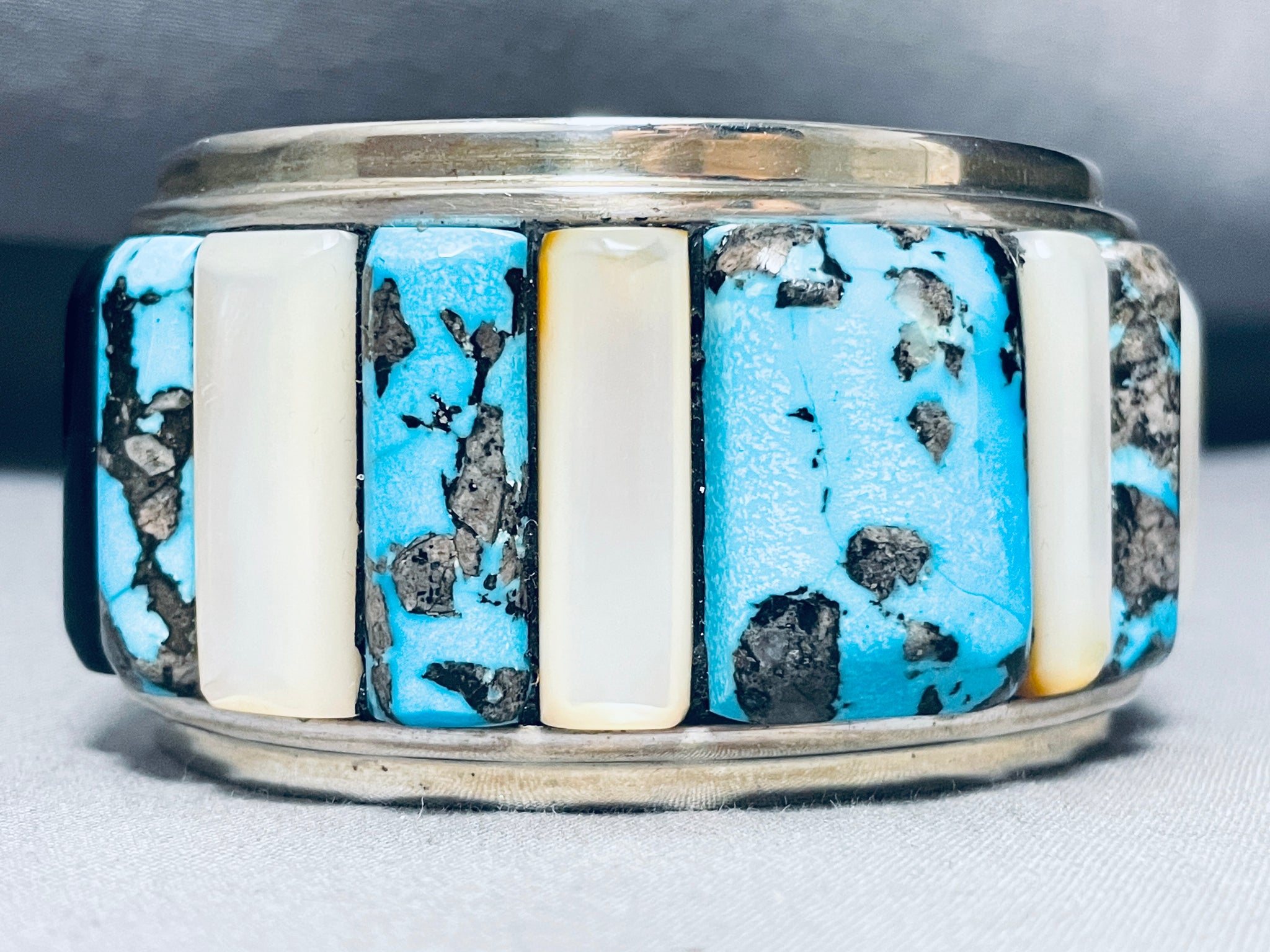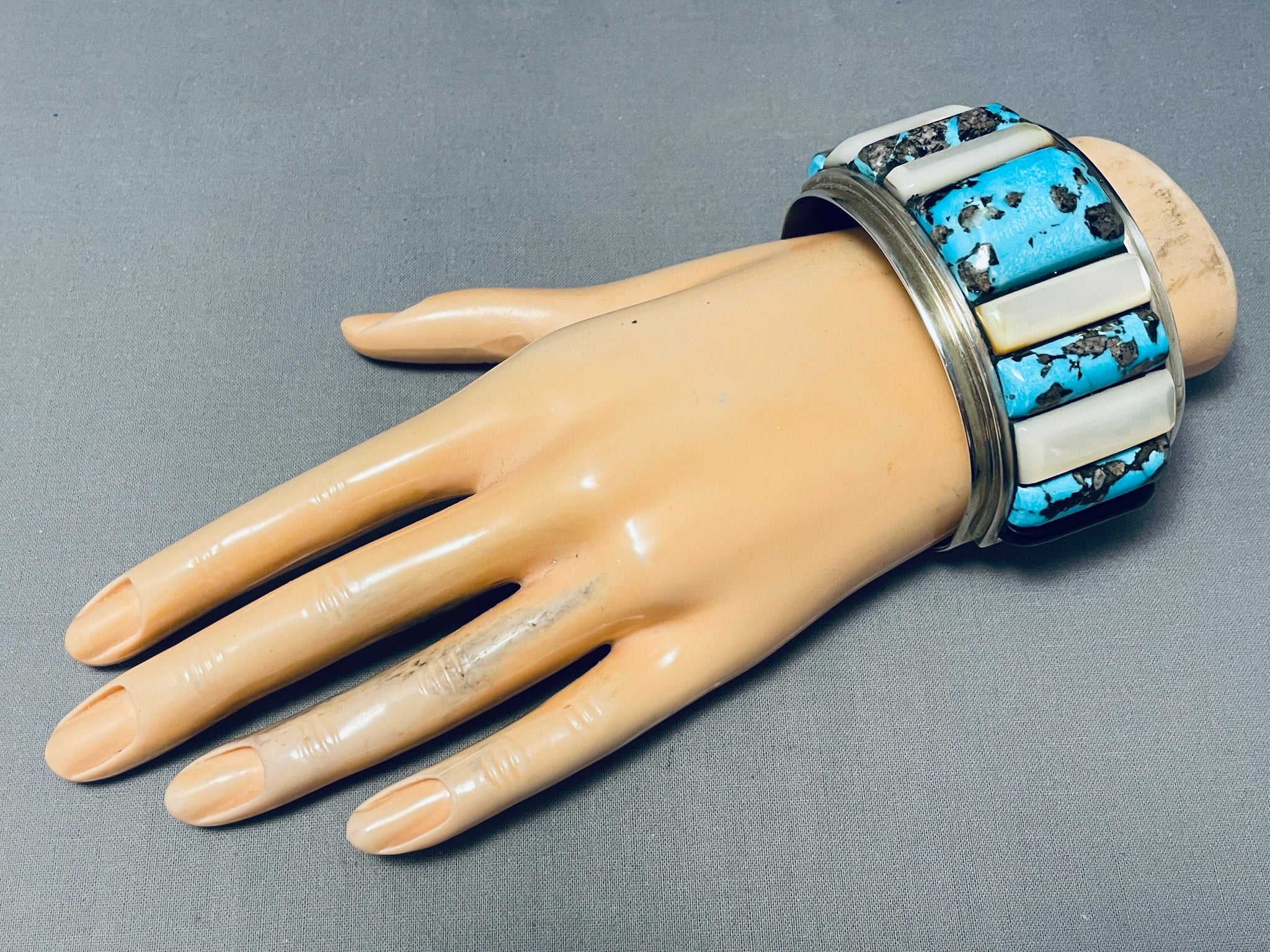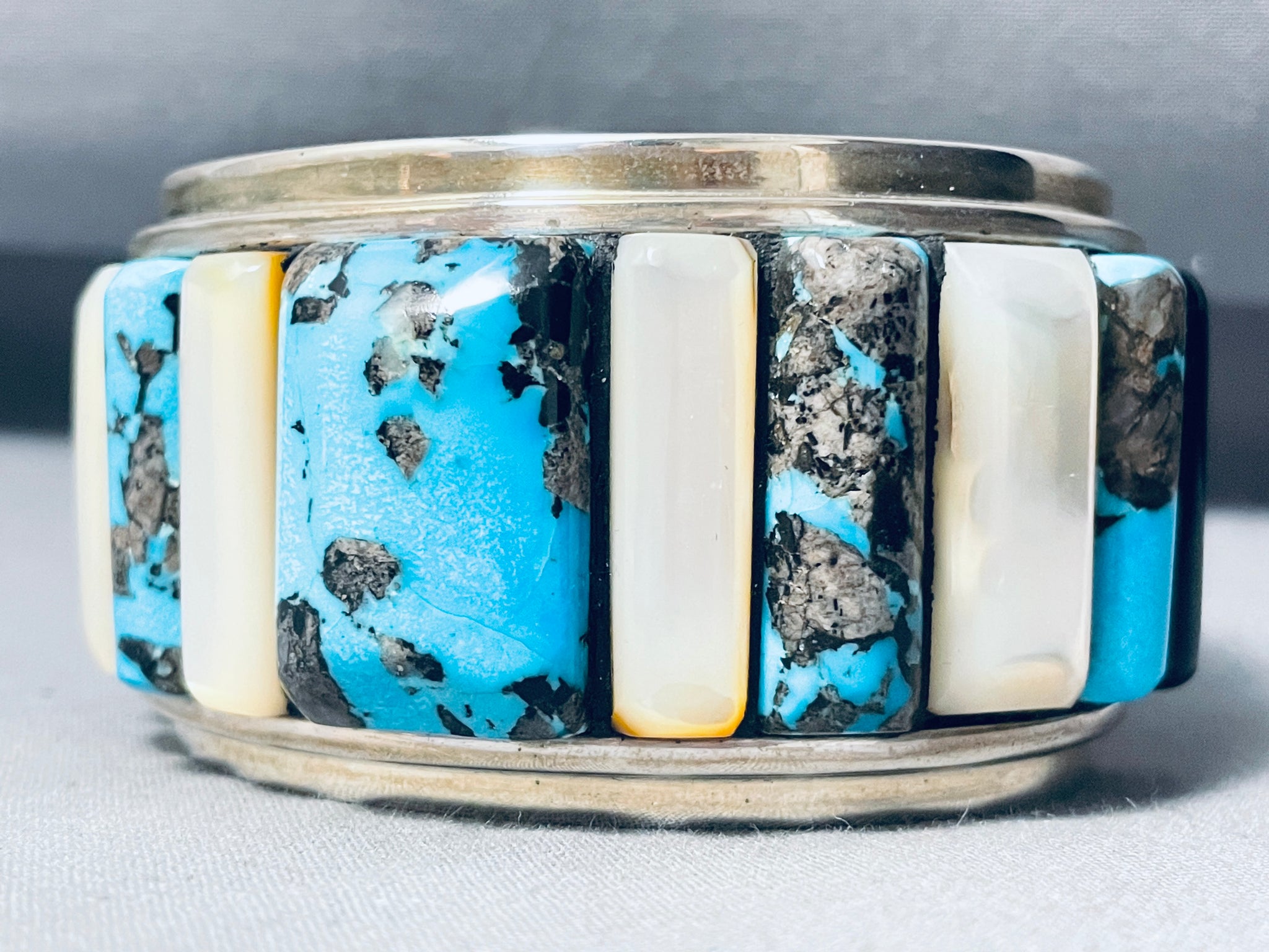 This is an astonishing vintage Navajo very large wide inlaid silver cuff bracelet. This impeccable bracelet contains an outstanding row of chunky large inlaid turquoise stones and mother of pearl shells with end accenting inlaid onyx stones. The turquoise is absolutely beautiful consisting of Gilbert turquoise, just incredible. I absolutely love the corn row inlay pattern and how large those stones and shells really are with the center measuring a whopping 1-1/8" X 3/4". The cuff bracelet is very wide and I love how sturdy it is. The width of the bracelet measures around 1-5/8". Sterling silver. Cir. Mid century . The inside end to end measures around 5-3/4" with an additional 1-1/2" gap. Sturdy 121 grams.