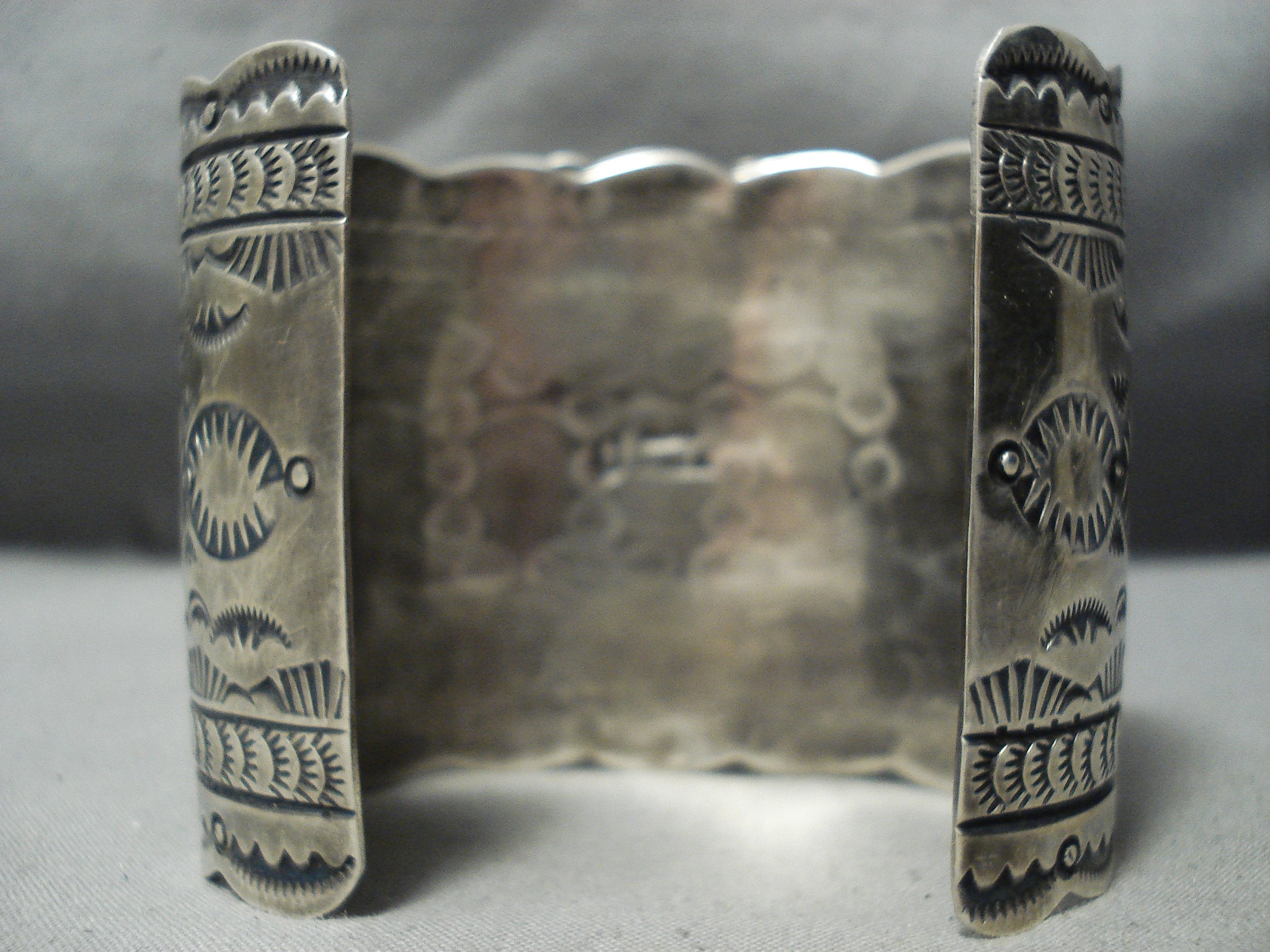 This is a tremendous vintage Navajo turquoise silver cross bracelet. This is one of the biggest and best cross bracelets we have ever collected. The bracelet contains five remarkable huge Birds Eye Kingman turquoise stones that are square shaped and situated in a beautiful cross formation within a phenomenal hand carved silver cross. Accenting the silver cross are amazing silver works that consist of sun stampings, teepees and line segments. This bracelet is very thick, sturdy and wide with absolutely remarkable silver works that run down both ends of the entire cuff. The silver works consist of cloud patterns, mountains, dotted works, and bordering sun stampings. The edges of the cuff wonderfully wave from one end to the other. The stones measure around 1/2" x 3/8". The width of the bracelet measures around 2-3/8". Signed by Navajo artist, G. James . Sterling silver, marked. Cir. 1970's+. The inside end to end measures around 6" with an additional 1-1/2" gap. Sturdy 138 grams.