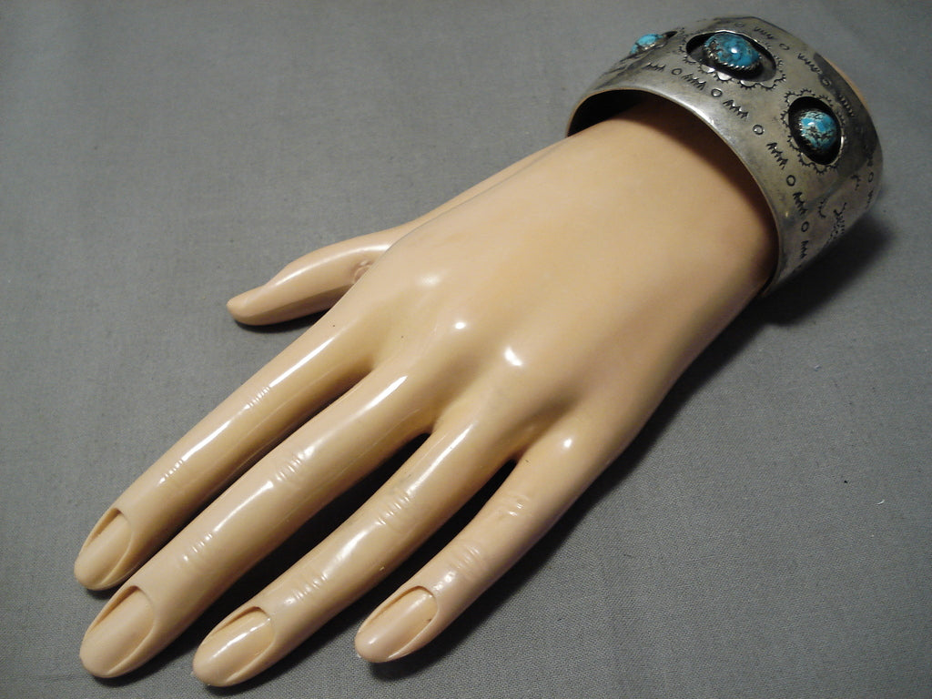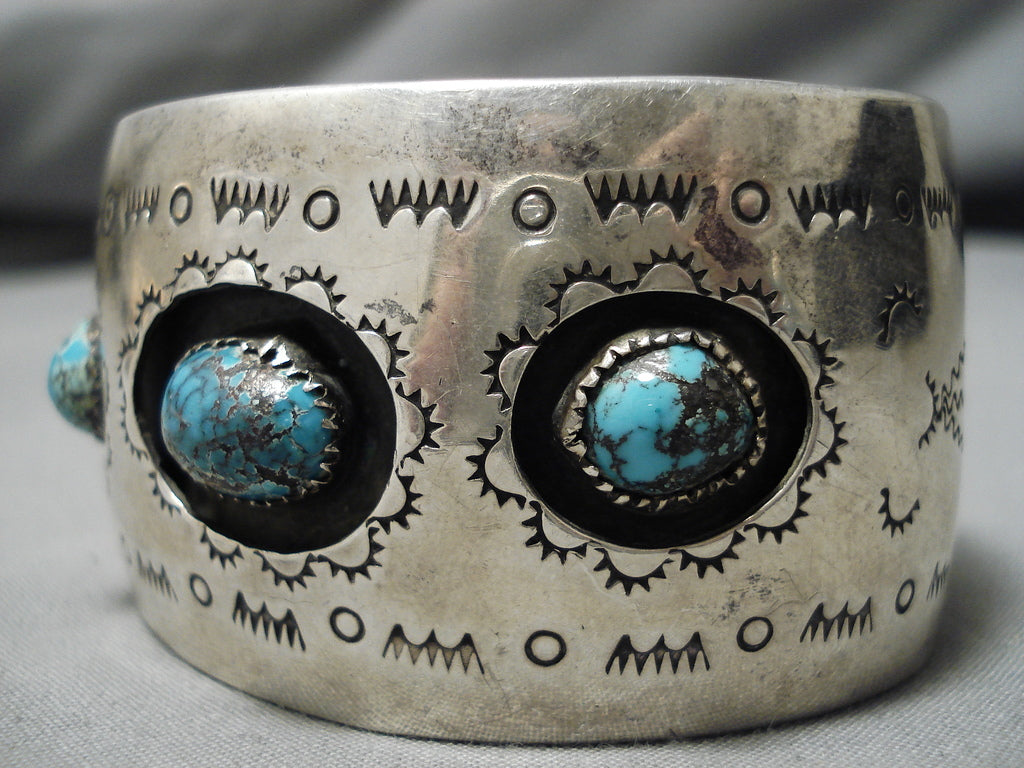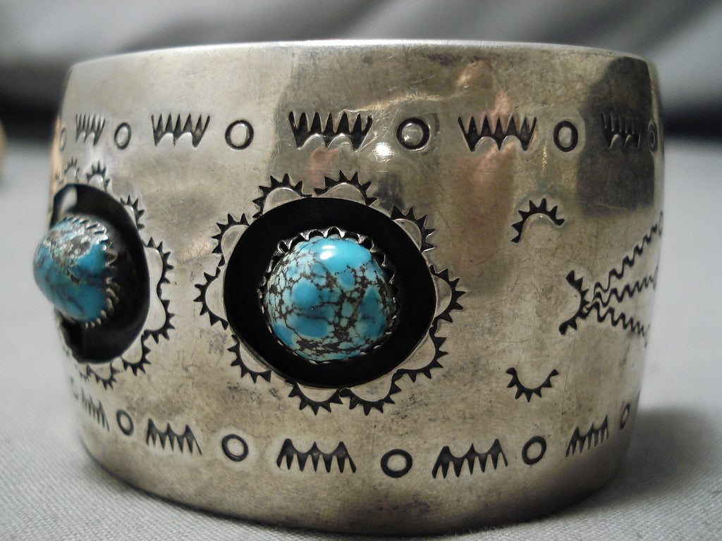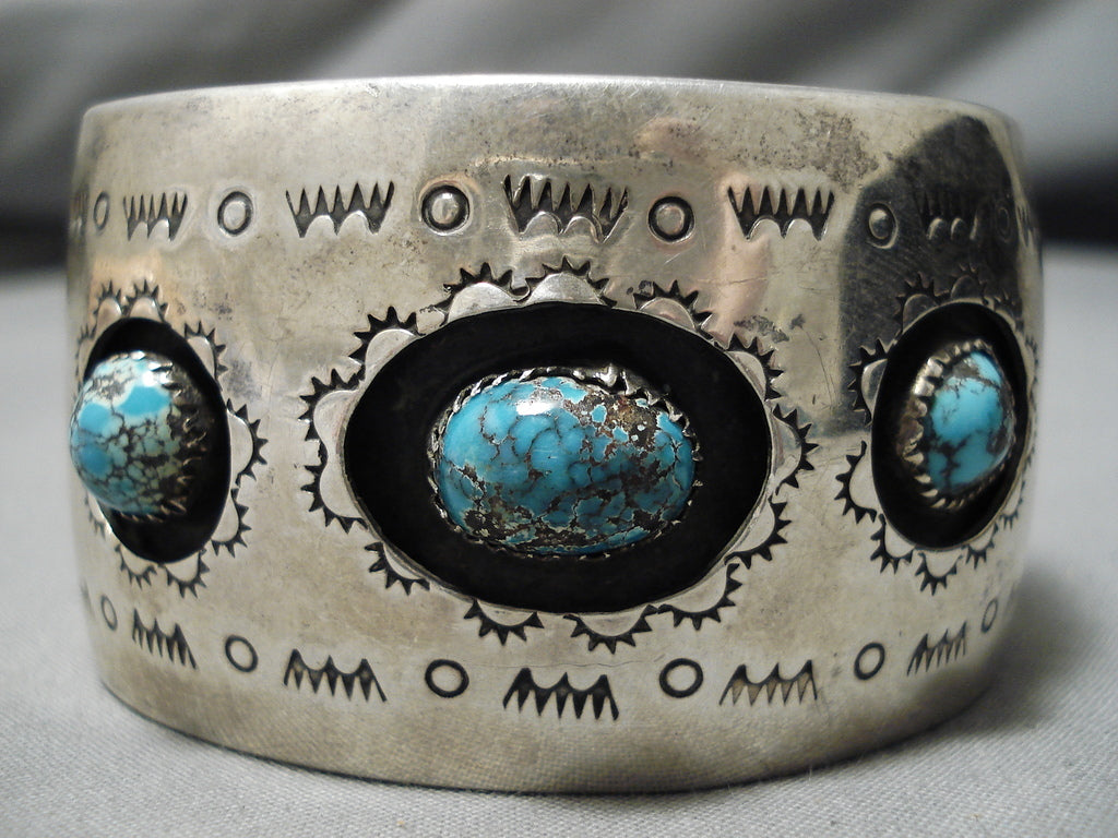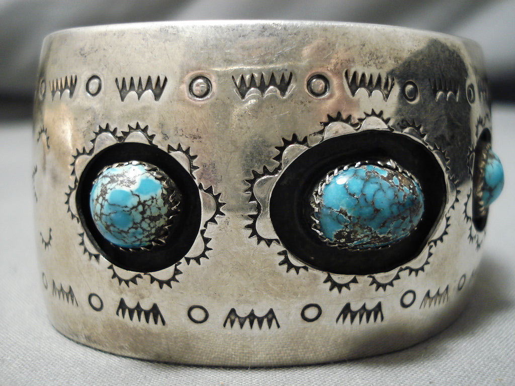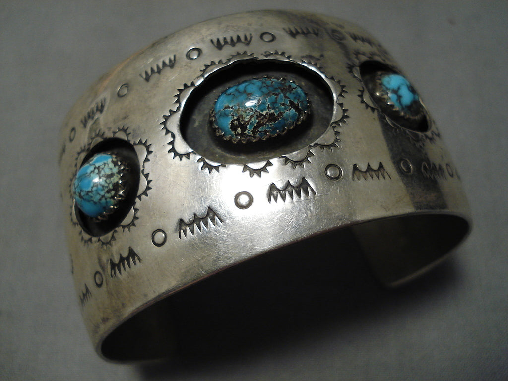 This is an impressive Navajo three stone silver bracelet being one of the finest natural Bisbee stone shadowbox bracelets we have collected this year. This bracelet consists of three outstanding Bisbee turquoise stones that are beautifully situated in shadowbox settings. Bordering the stones and edges of the cuff are remarkable sun and circular patterns. The center stone measures around 1/2" x 3/8". The width of the bracelet measures around 1-1/2". Sterling silver. Cir. Mid century . The inside end to end measures around 5-1/2" with an additional 1-1/2" gap. Sturdy 68 grams.