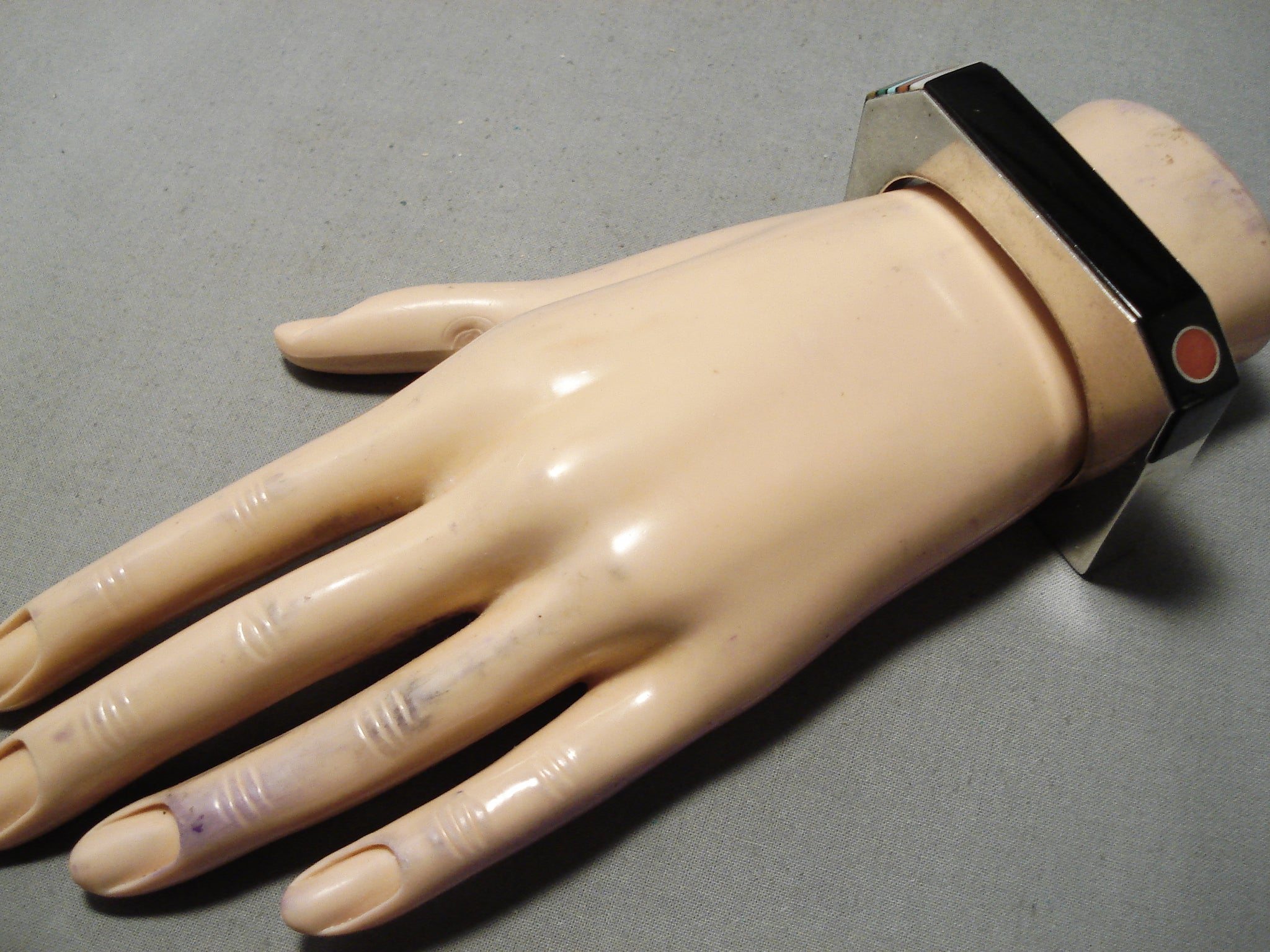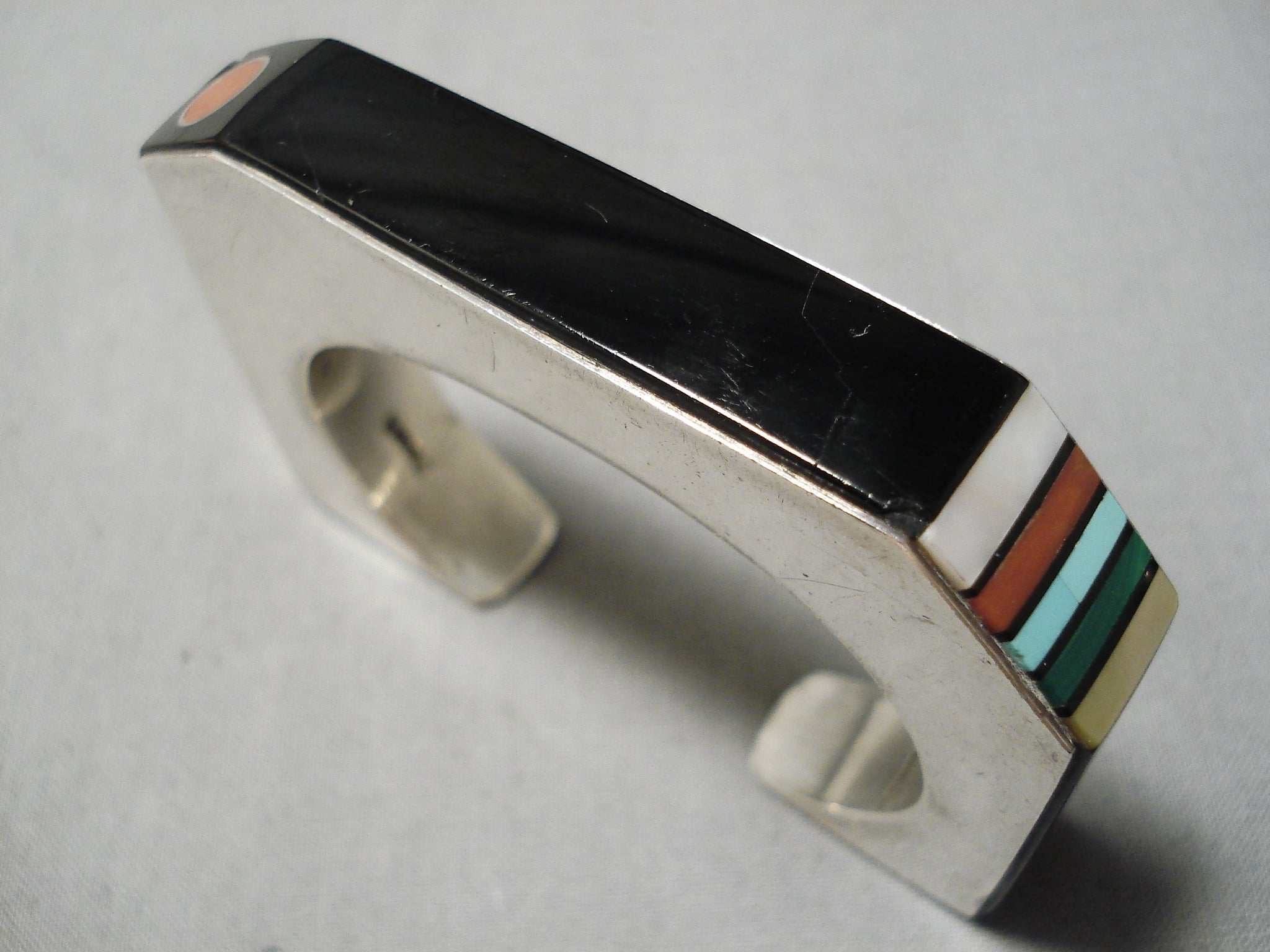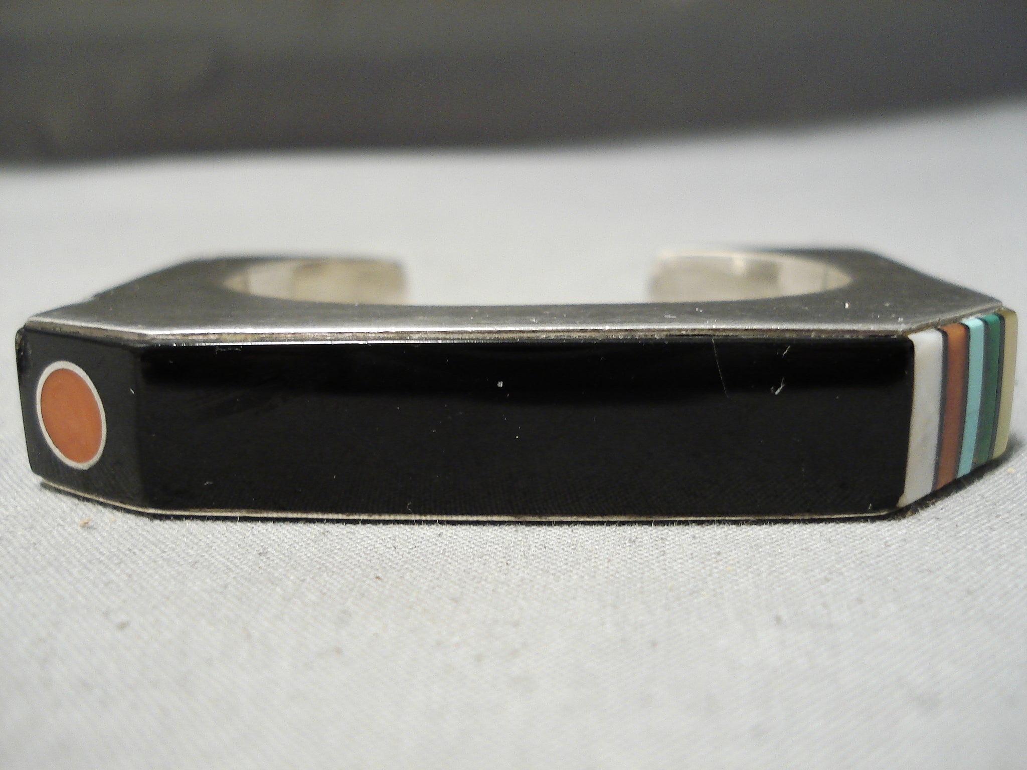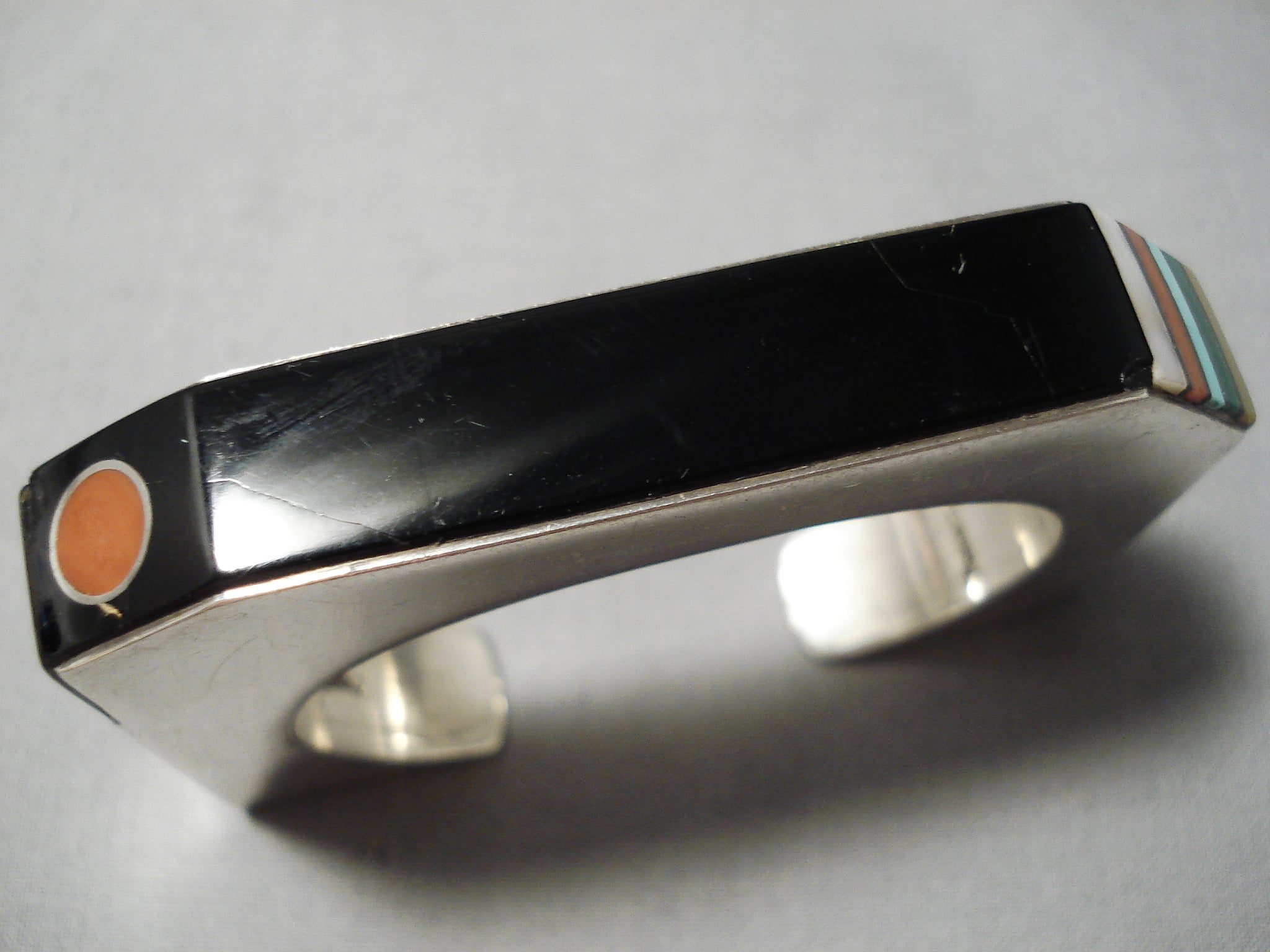 This is a museum quality vintage Hopi inlaid silver bracelet handmade by one of the most famous Hopi artists alive today, Jesse Monongye. Jesse is incredibly skilled and his inlay works are the best. This piece is just incredible as it includes natural turquoise, coral and shells. Check out the fabulous accenting eye coral stone. The silver works are top notch and are very thick and sturdy. Jesse is Preston Monongyes son and is the number 1 Hopi artist. The width of the bracelet measures around 1/2". Signed by Hopi artist, Jesse Monongye. Sterling silver. Cir. 1970's+. The inside end to end measures around 5" with an additional 1" gap. Sturdy 62 grams.