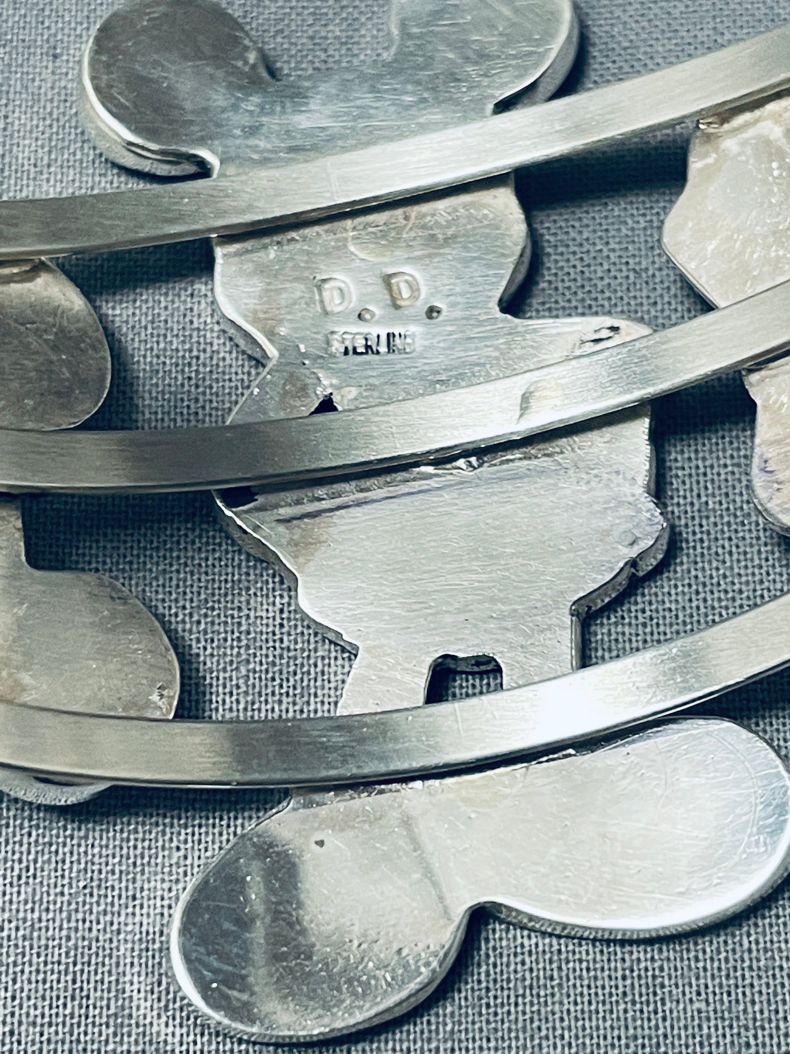 This is an exceptional Navajo inlaid Mickey and Minnie silver bracelet. This remarkable bracelet contains a center inlaid Mickey Mouse with Minnie Mouse accenting one side and another Mickey Mouse accenting the other side. The inlay is absolutely impeccable and so intricate and consists of coral, mother of pearl, yellow shell, turquoise and onyx. This bracelet contains a superior sturdy triple silver shank cuff. I absolutely love the detailing on this amazing bracelet. The center Mickey measures around 2-1/8" X 1". The width of the bracelet measures around 2-1/4". Signed by Navajo artist, Donny Dewa.. Sterling silver, marked. Cir. 1980's+. The inside end to end measures around 5-1/4" with an additional 1-1/4" gap. Sturdy 44 grams.