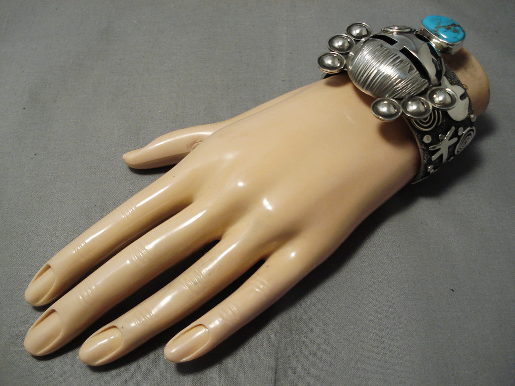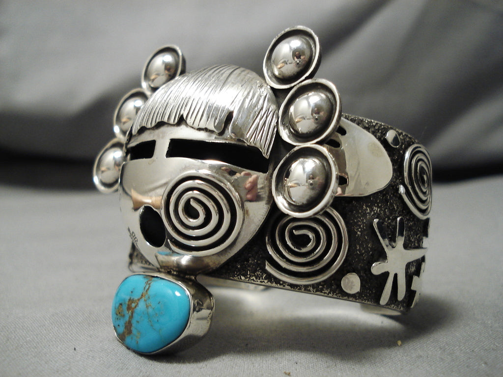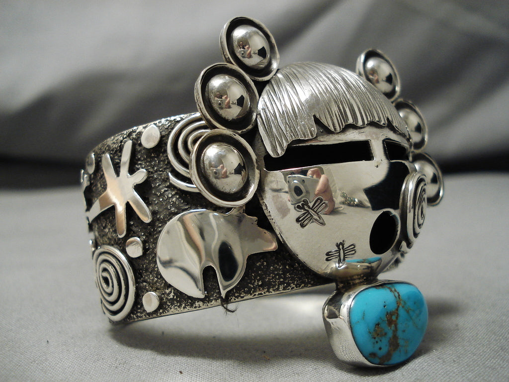 Best Native American Navajo Alex Sanchez Turquoise Sterling Silver Kachina Bracelet