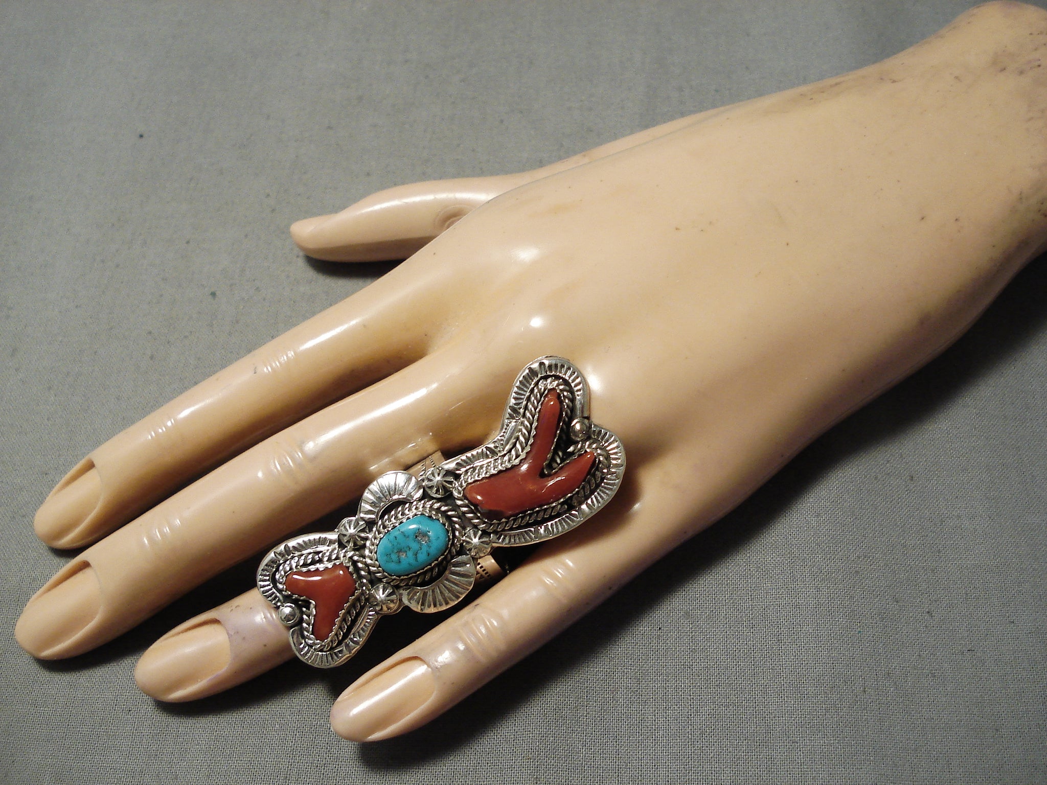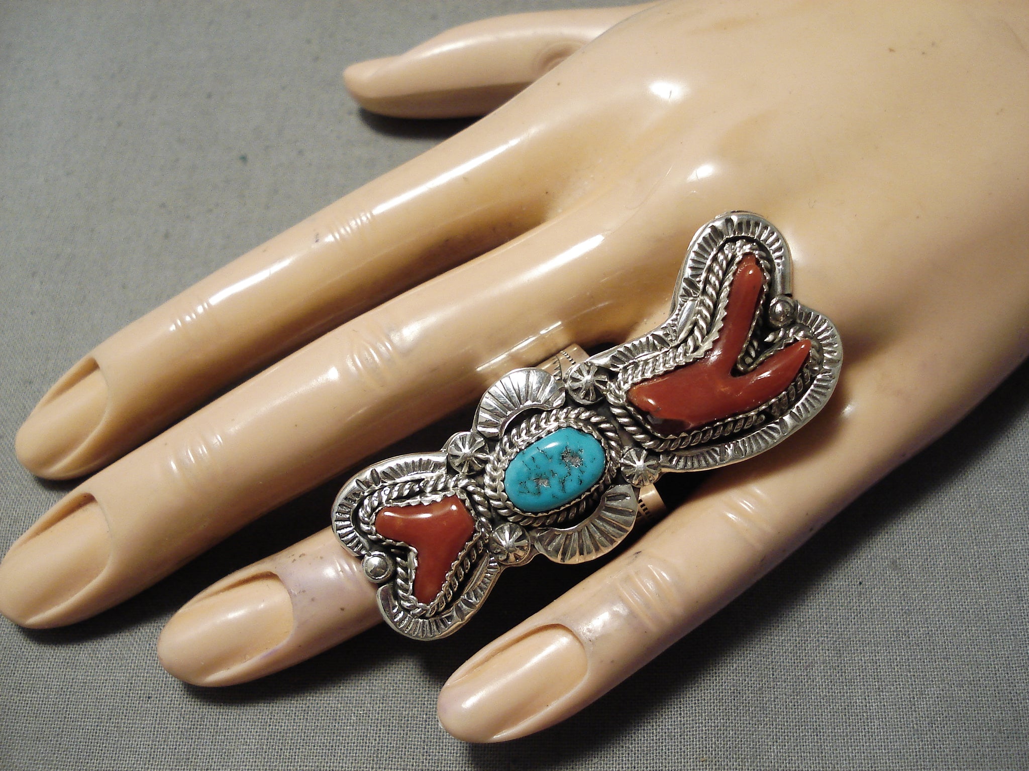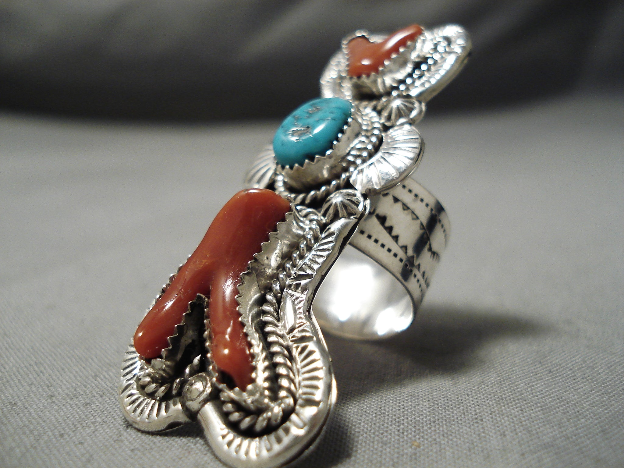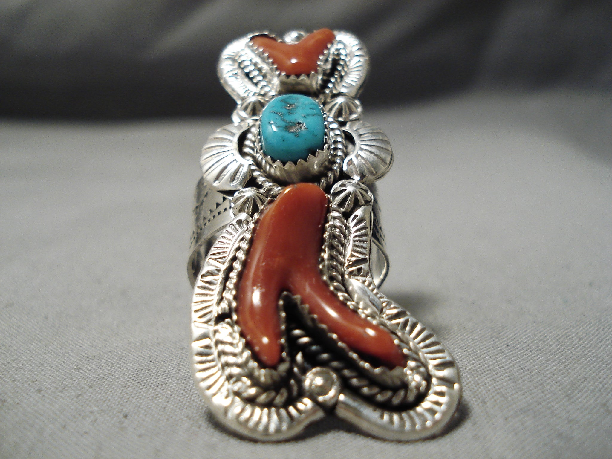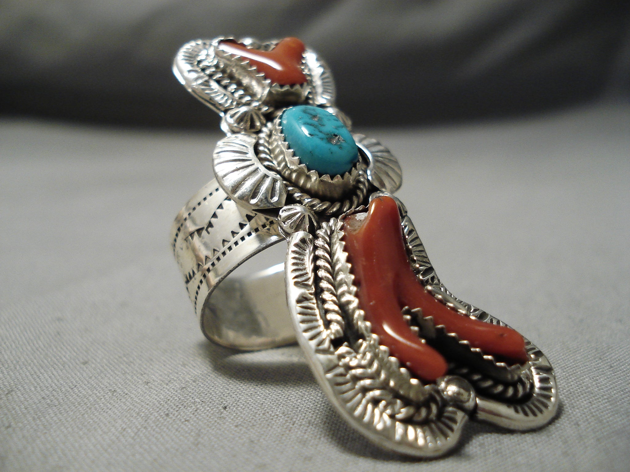 Best Towering Huge Native American Navajo Coral Sterling Silver Turquoise Ring