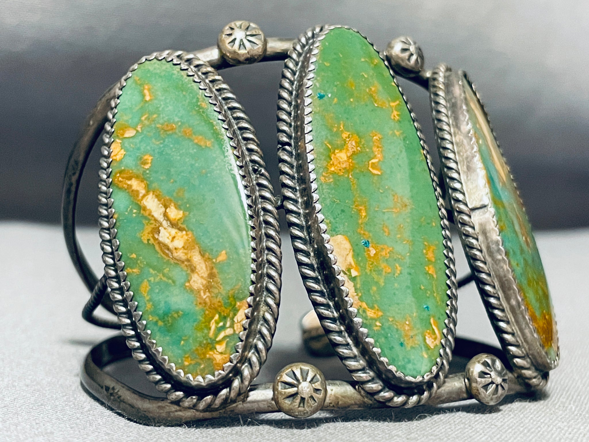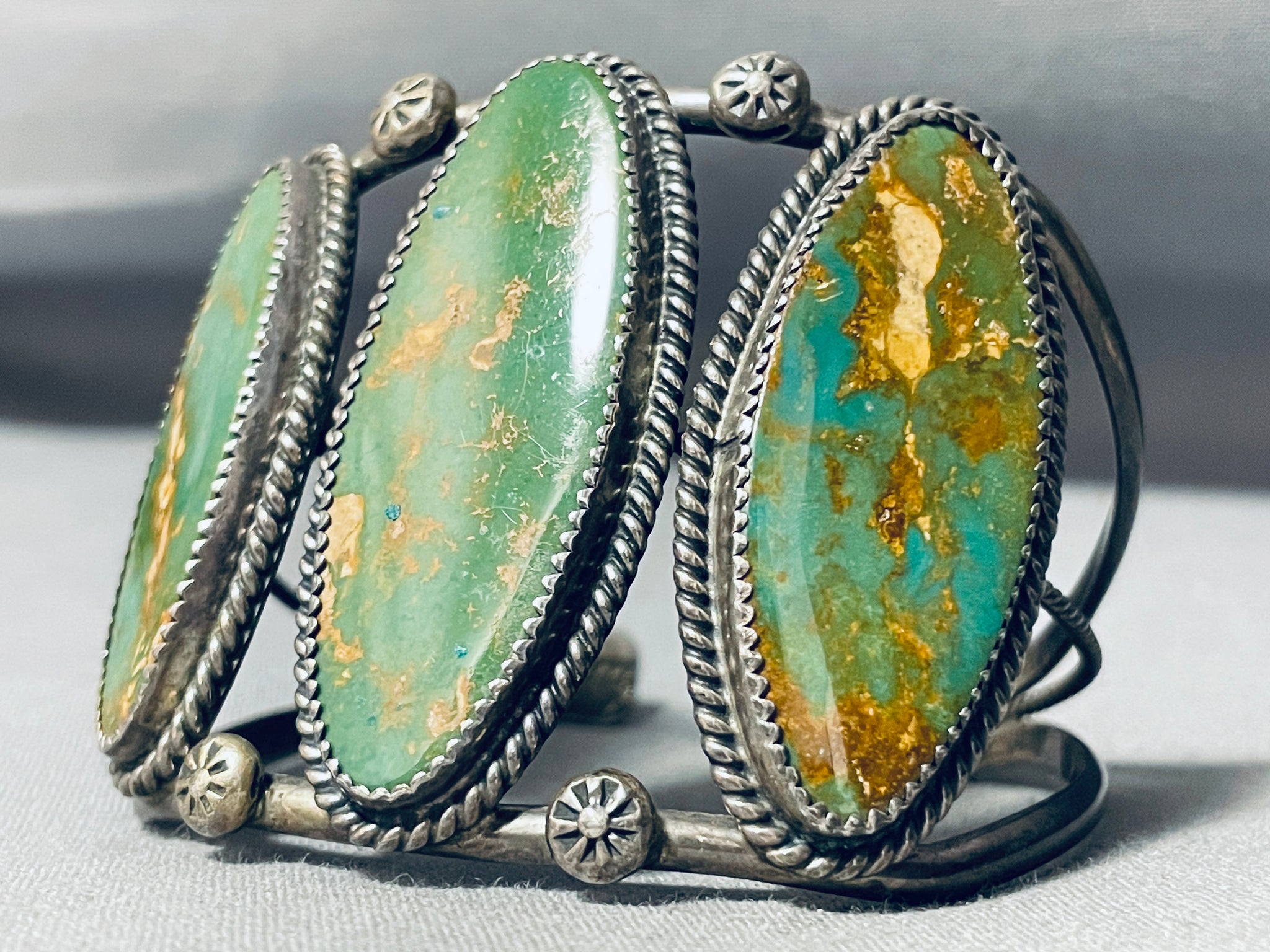 Best Triple Long Green Turquoise Vintage Native American Navajo Sterling Silver Bracelet