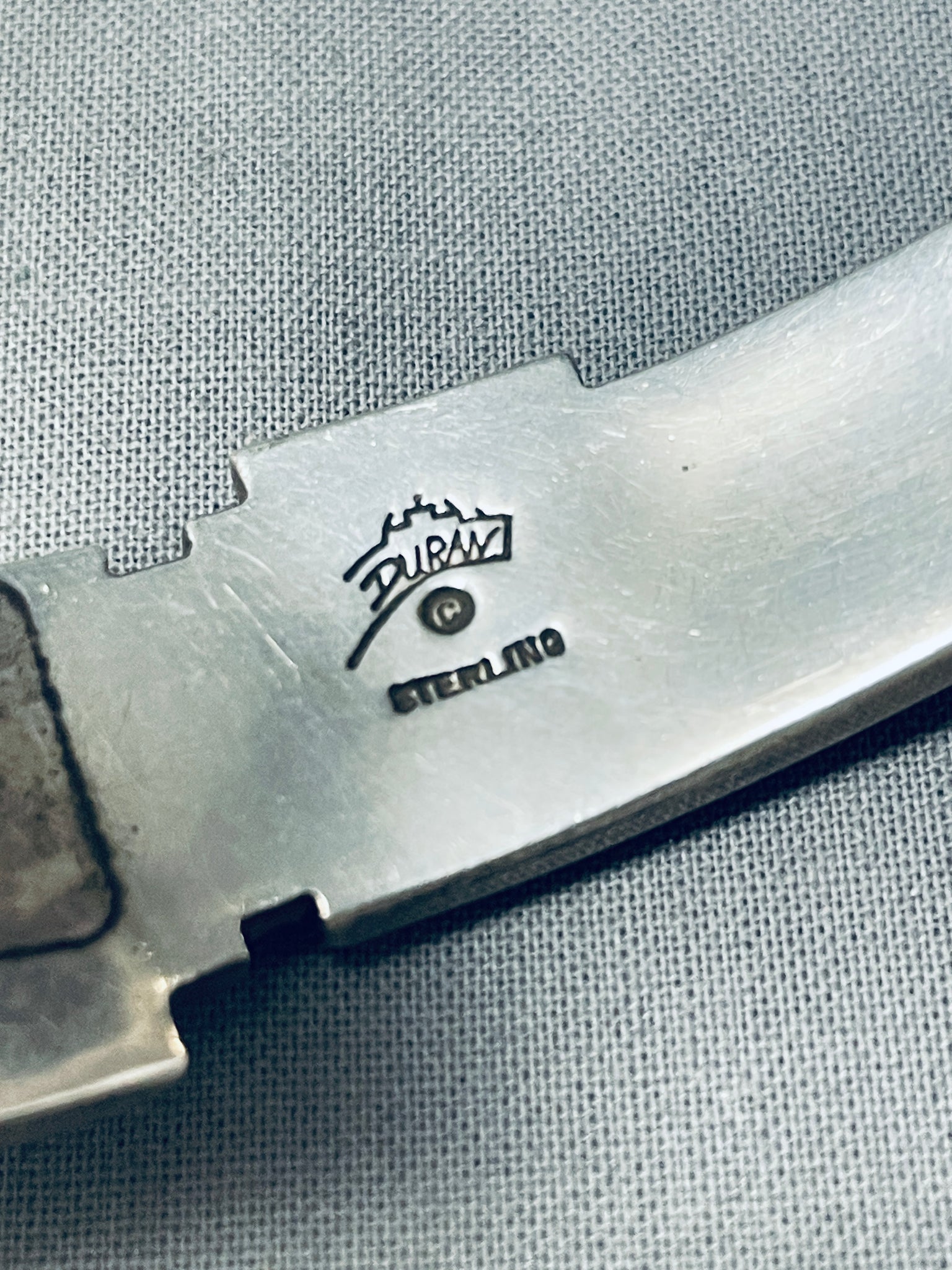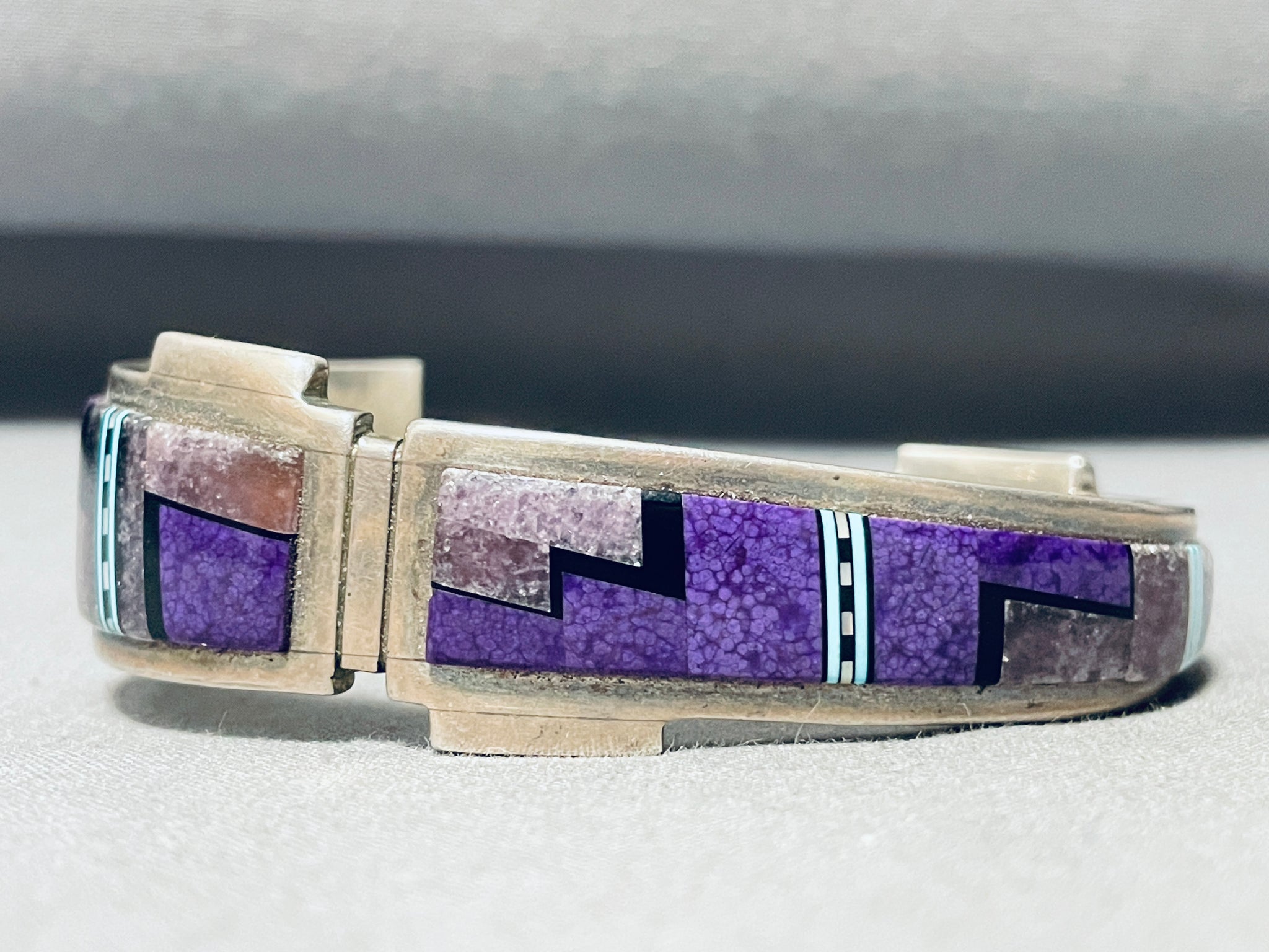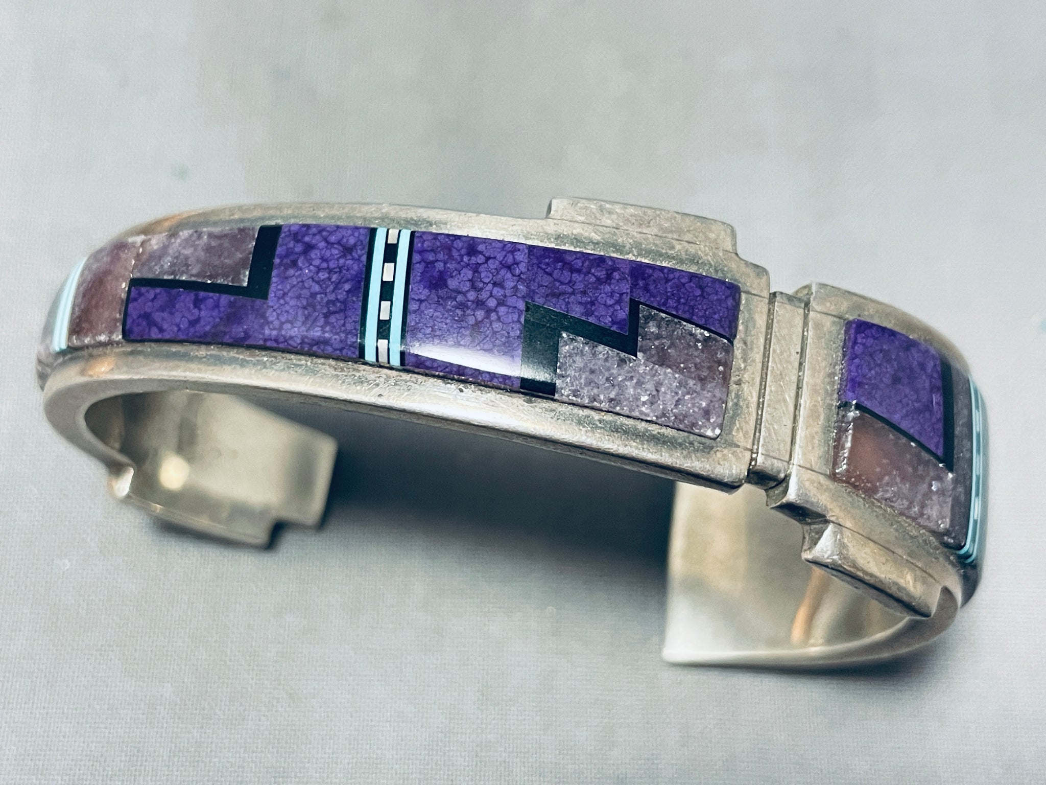 This is an amazing Navajo inalid silver cuff bracelet. This fascinating bracelet contains such intricate and beautiful inlaid workmanship that wraps from one end of the cuff to the other. The way the thick cuff wonderfully graduates in width along with the width of the inlaid patterns is just astonishing. The inlay consists of sugulite, onyx, turquiose, and mother of pearl, so remarkable! The accenting bordering patterns that are situated on this bracelet is also stunning. I just love the detailing and beauty of this entire cuff bracelet. The width of the bracelet measures around 5/8". Signed by Navajo artist, Duran with a Mesa. Sterling silver, marked. Cir. 1980's+. The inside end to end measures around 5-1/2" with an additional 1-1/4" gap. Sturdy 53 grams.