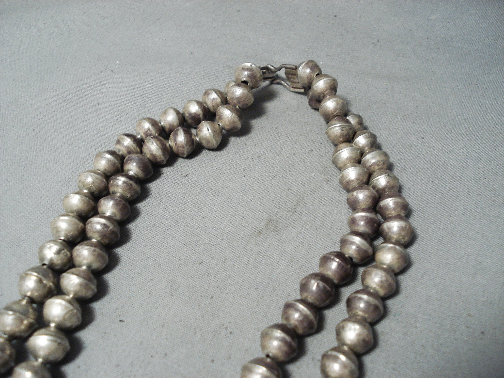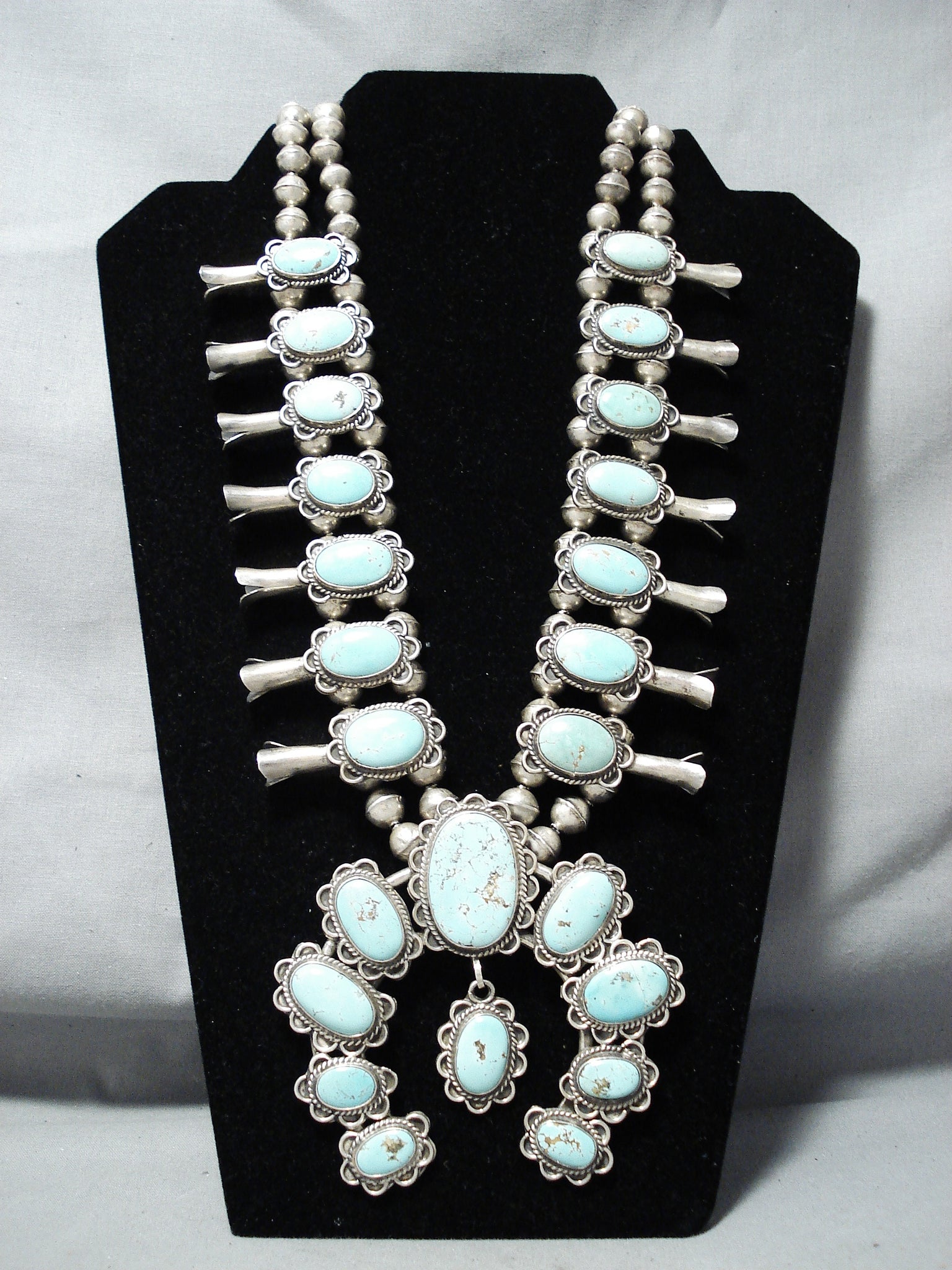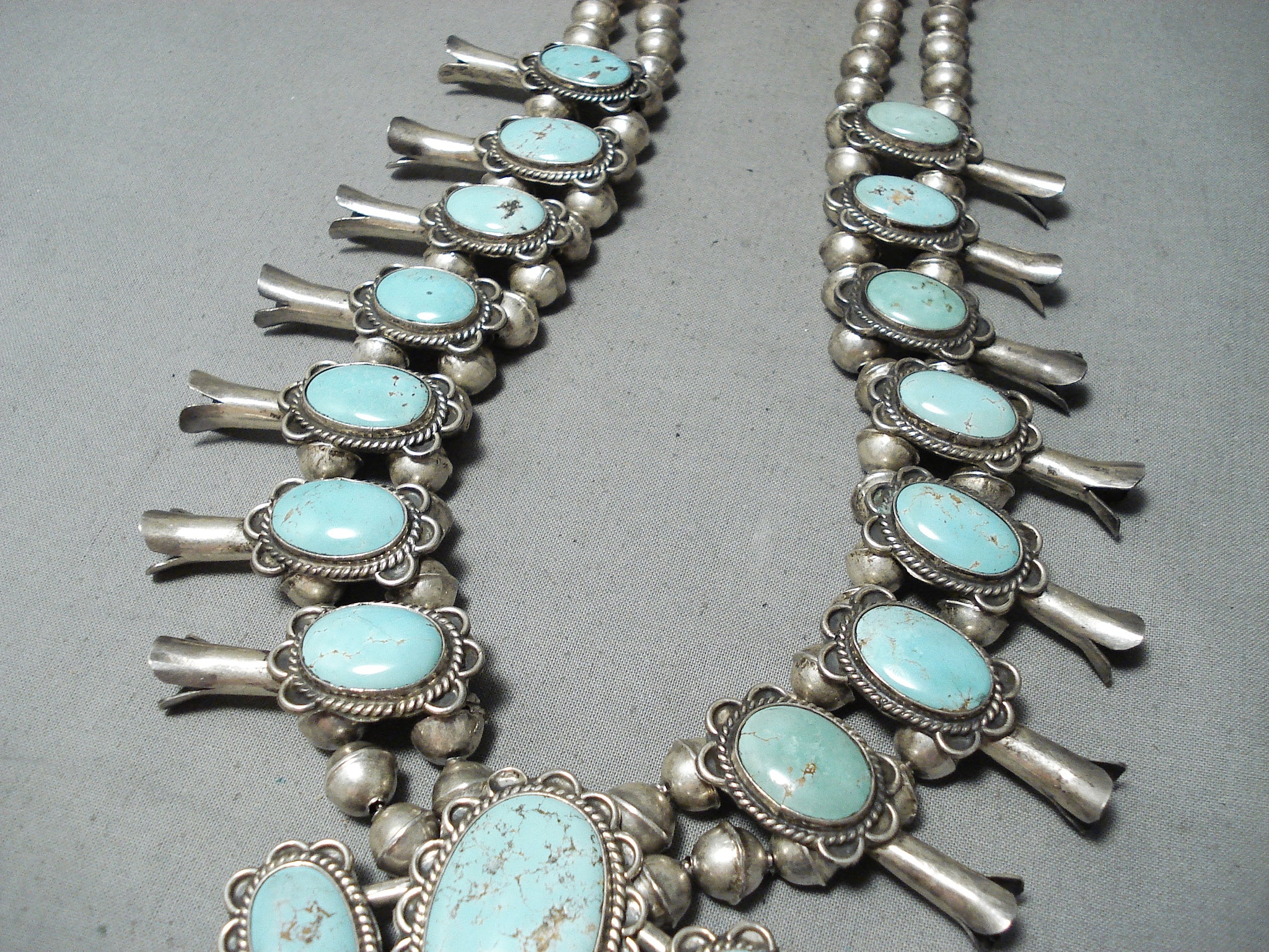 This is a tremendous vintage Navajo turquoise and silver squash blossom necklace. This outstanding piece contains 24 extremely rare turquoise stones that appear to be from the old Number 8 turquoise mine. It is rare to find the vintage squash blossoms with Number 8 and this necklace is HUGE! The largest turquoise stone measures around 1-1/8" X 3/4". Surrounding each stone are marvelous silver wave patterns with accenting silver ropes. The large double silver shank naja pendant measures around 3-1/2" X 3-1/2". Check out how large those handmade silver beads are that rest throughout the entire necklace with a traditional silver clasp. This is one of the best squash blossom necklaces we have collected. Sterling silver. Cir. Mid century . The length of the necklace measures around 34". Sturdy 263 grams.