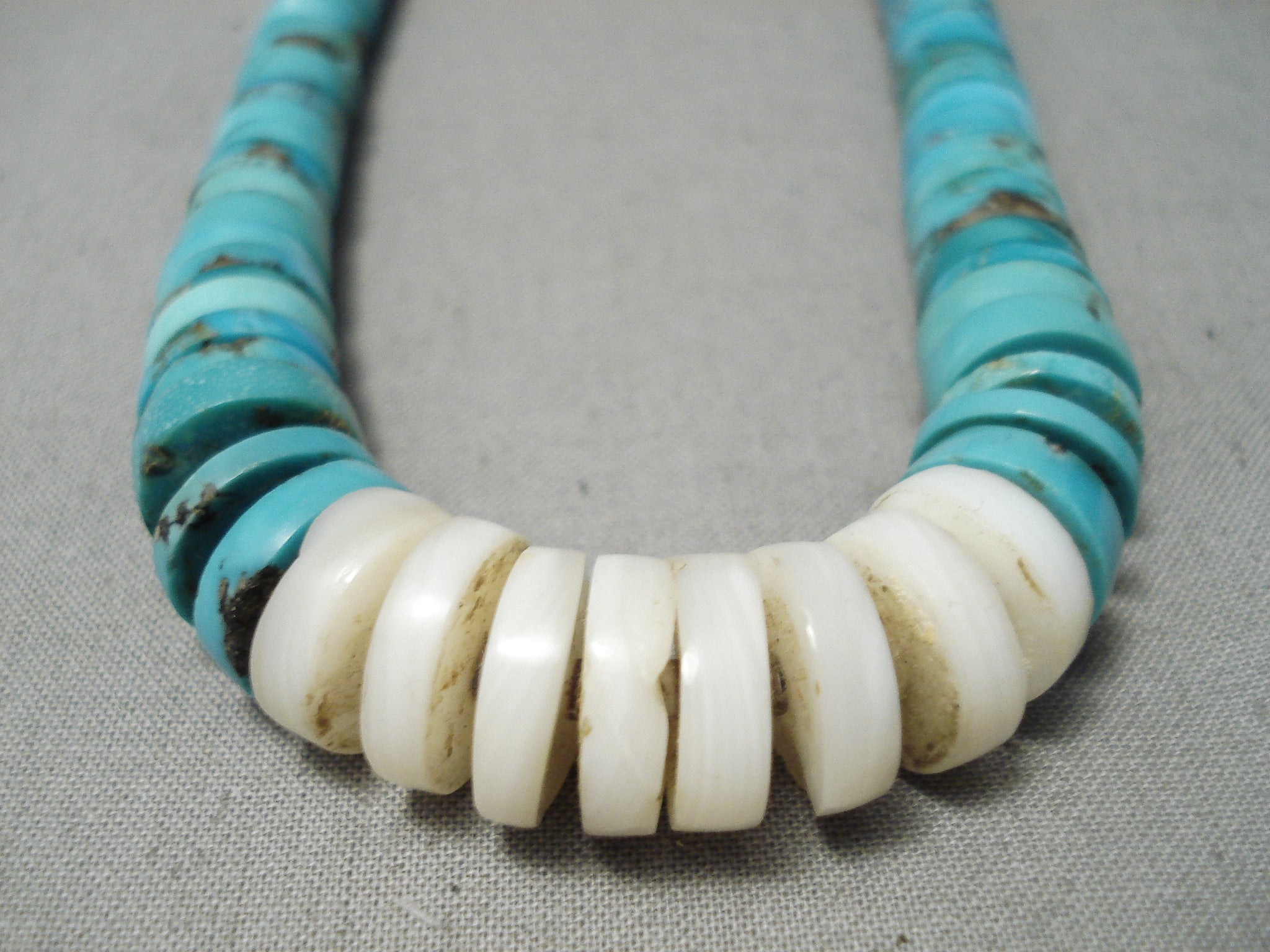 This is a striking vintage Navajo turquoise heishi necklace. This incredible necklace is one of the finest heishi necklaces we have recently collected. The old Bisbee turquoise heishi graduates in size towards the bottom with the largest measuring around 5/8" in diameter. Resting at the bottom are beautiful white shell heishi with accenting tan shell heishi to seperate them giving the necklace more detail and character. Situated at the ends are fabulous silver beads with accenting silver cones and traditional silver clasp. Sterling silver. Cir. Mid century . The length of the necklace measures around 25". Sturdy 80 grams.