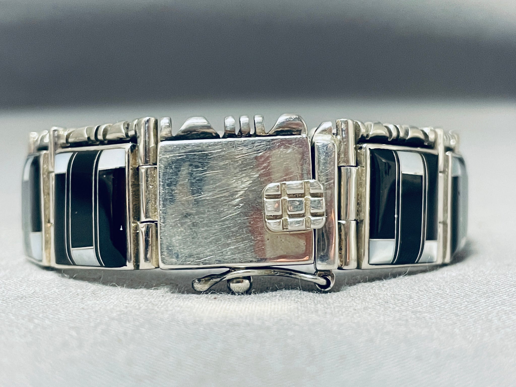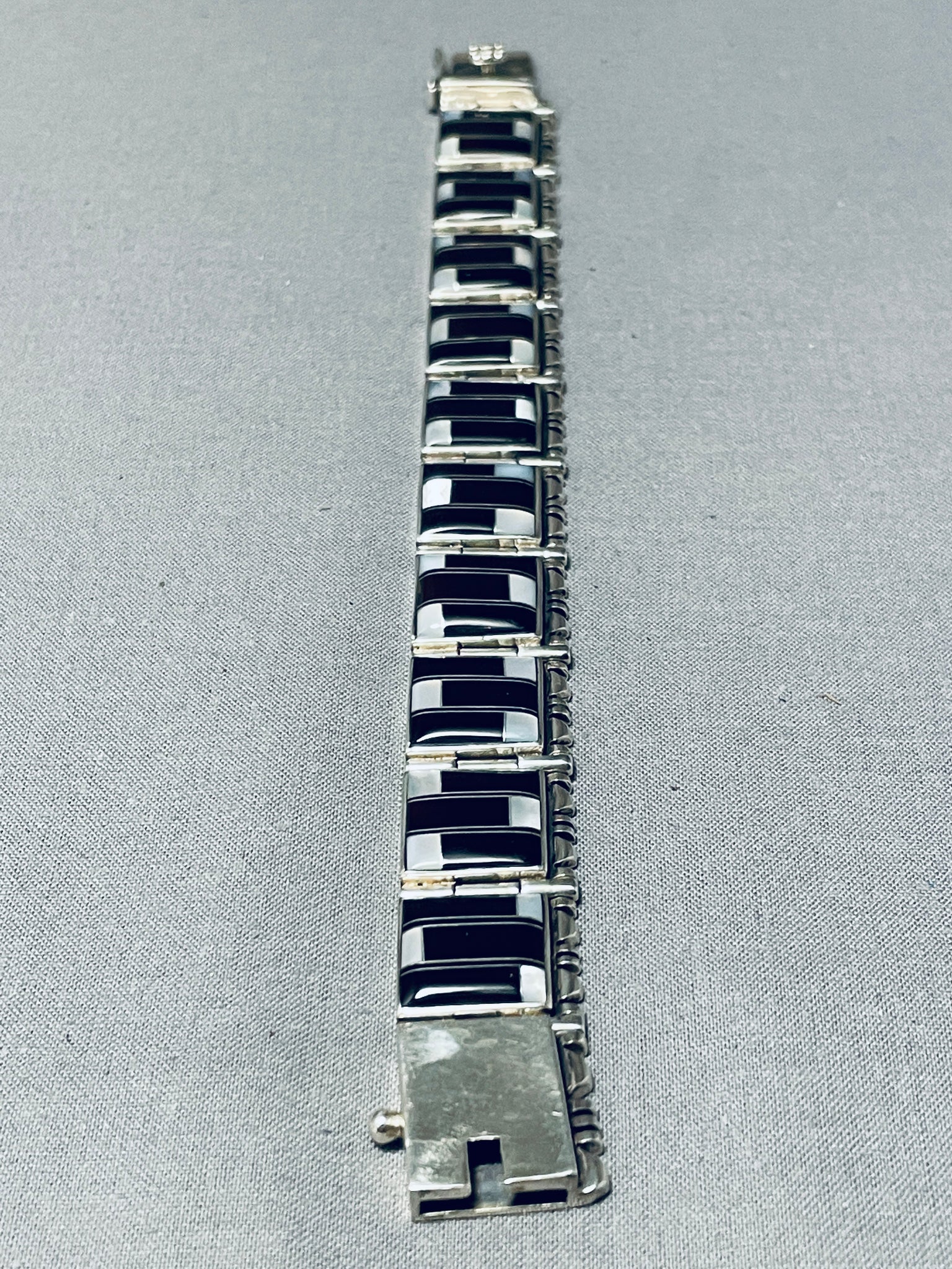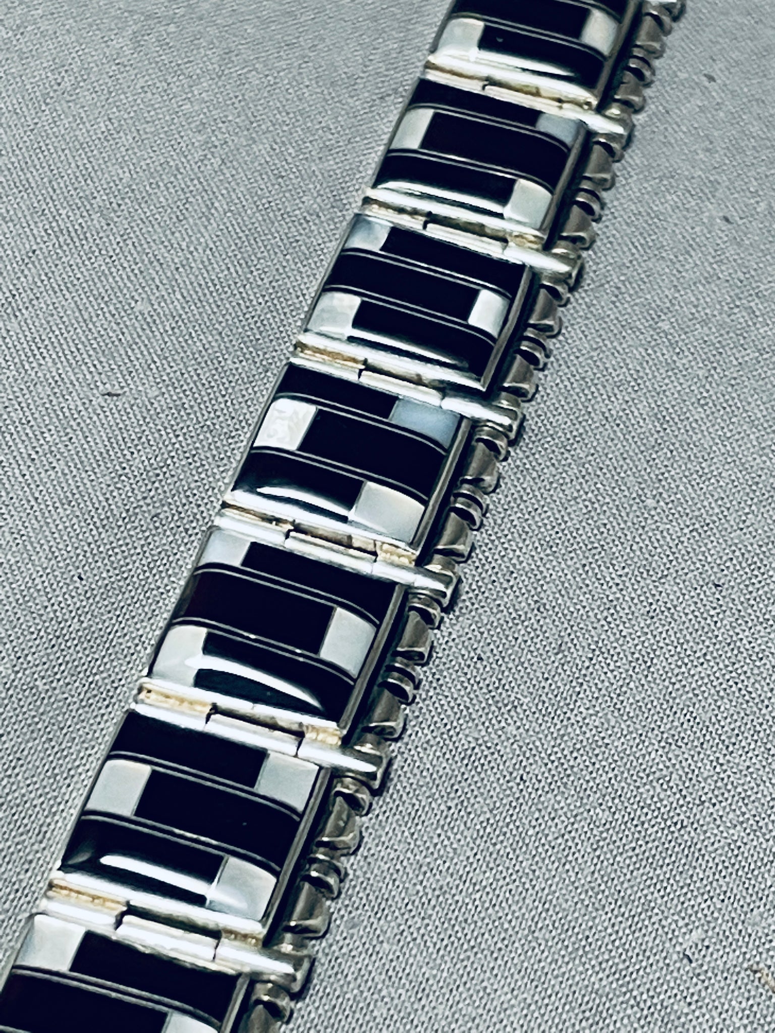Best Vintage Native American Navajo Black Stone Sterling Silver Link Clasp Bracelet