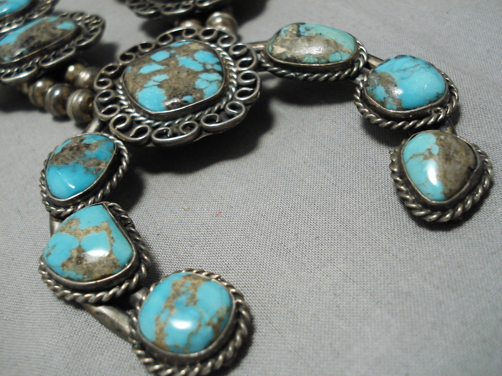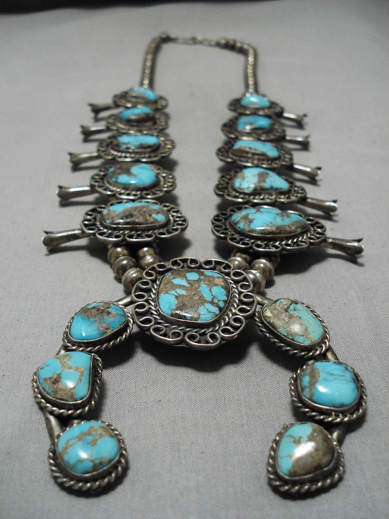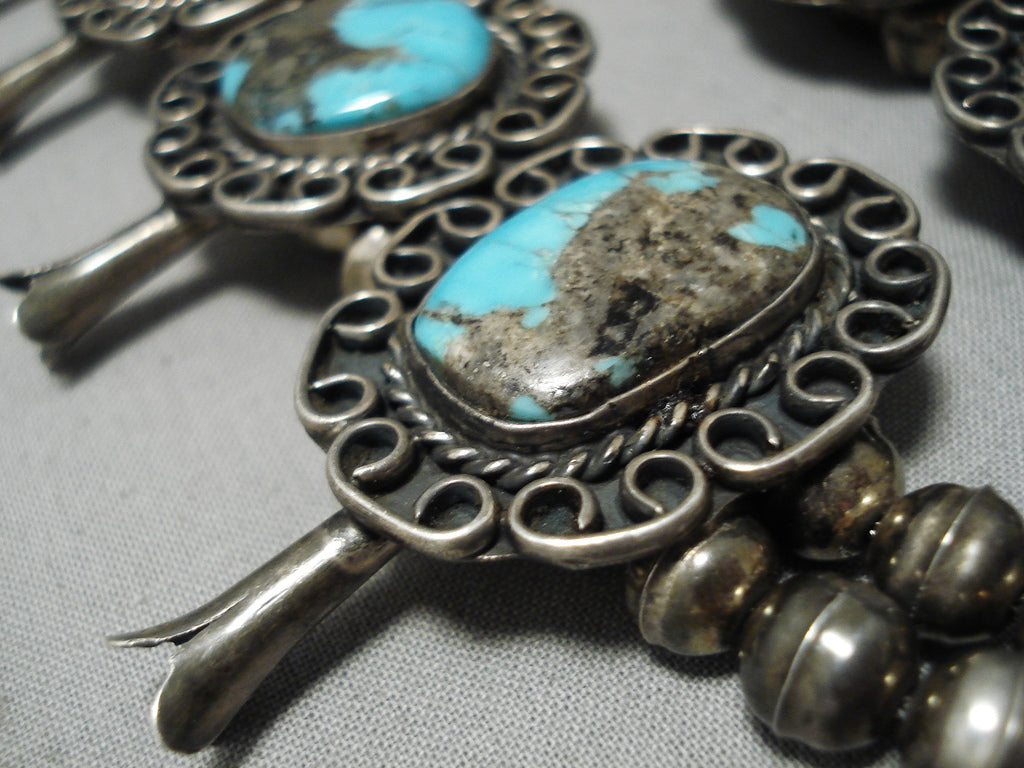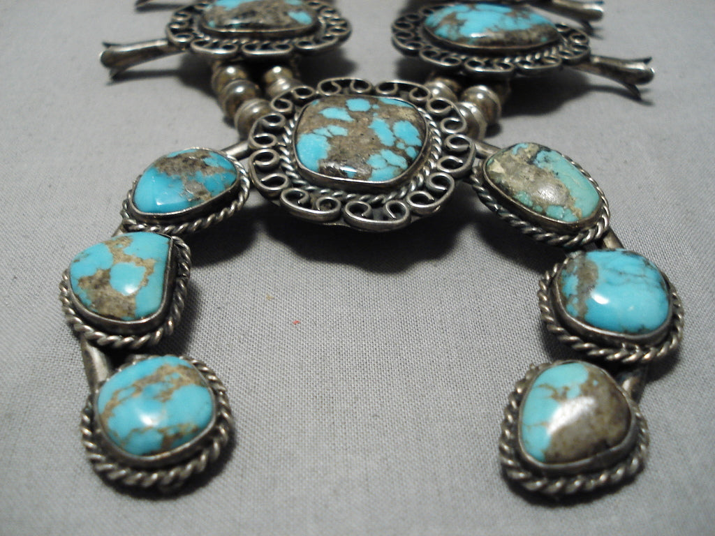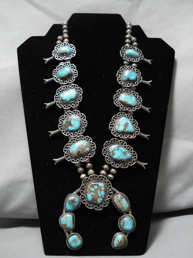 Best Vintage Native American Navajo Blue Dia Turquoise Sterling Silver Squash Blossom Necklace
