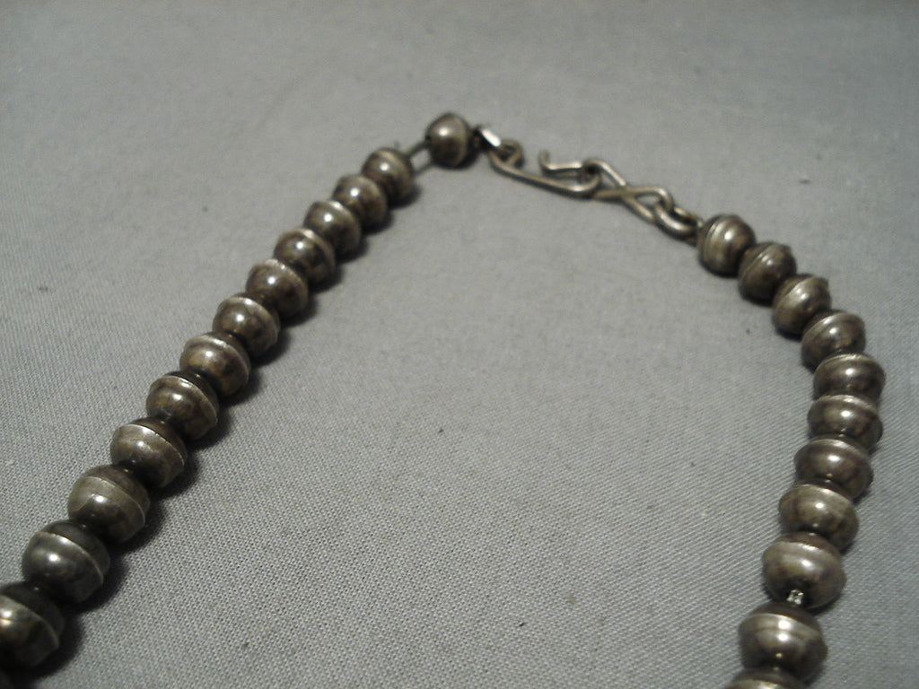 This is a remarkable vintage Navajo huge turquoise and silver squash blossom necklace. This museum quality squash is one of the finest we have collected this year. This necklace contains 17 fabulous old Blue Diamond turquoise stones with the largest measuring around 7/8" X 3/4". Surrounding the stones are phenomenal silver works that consist of swirling stems and ropes. The thick silver naja pendant measures around 3" X 3-1/8". Resting throughout the entire necklace are amazing hand wrought round silver beads with a thick traditional silver clasp. This piece is authentic, please be careful with all the fakes out there which is really sad to see. Sterling silver. Cir. Mid century . The length of the necklace measures around 32". Sturdy 235 grams.