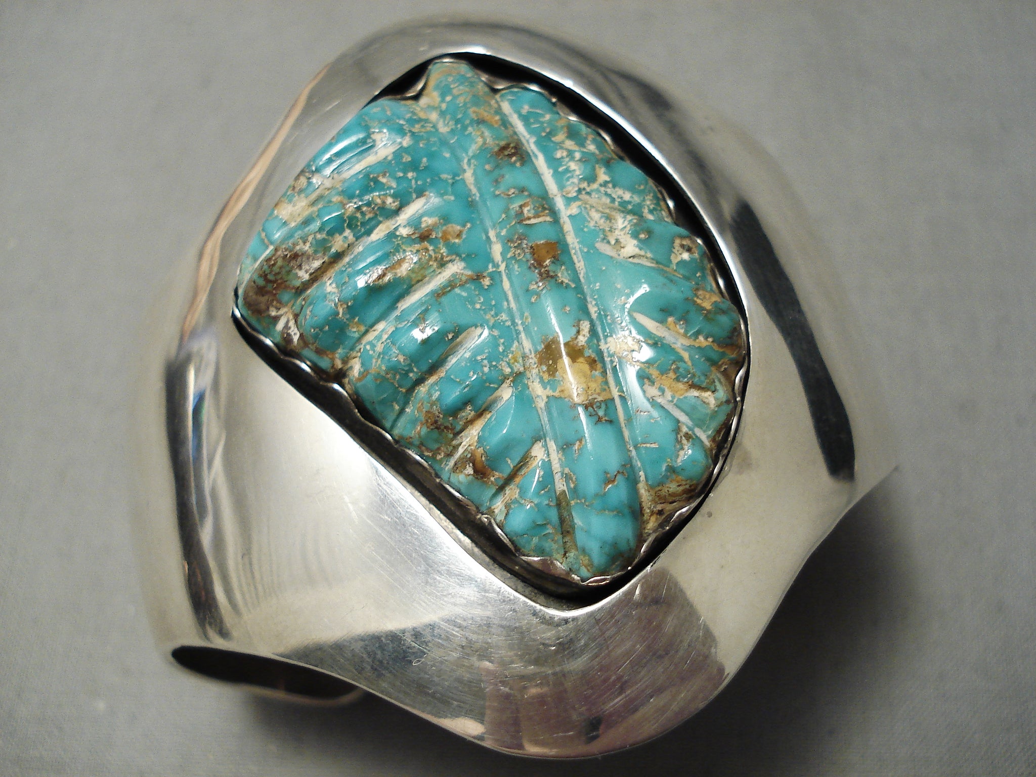 Best Vintage Native American Navajo Hand Carved Leaf Turquoise Sterling Silver Bracelet Old