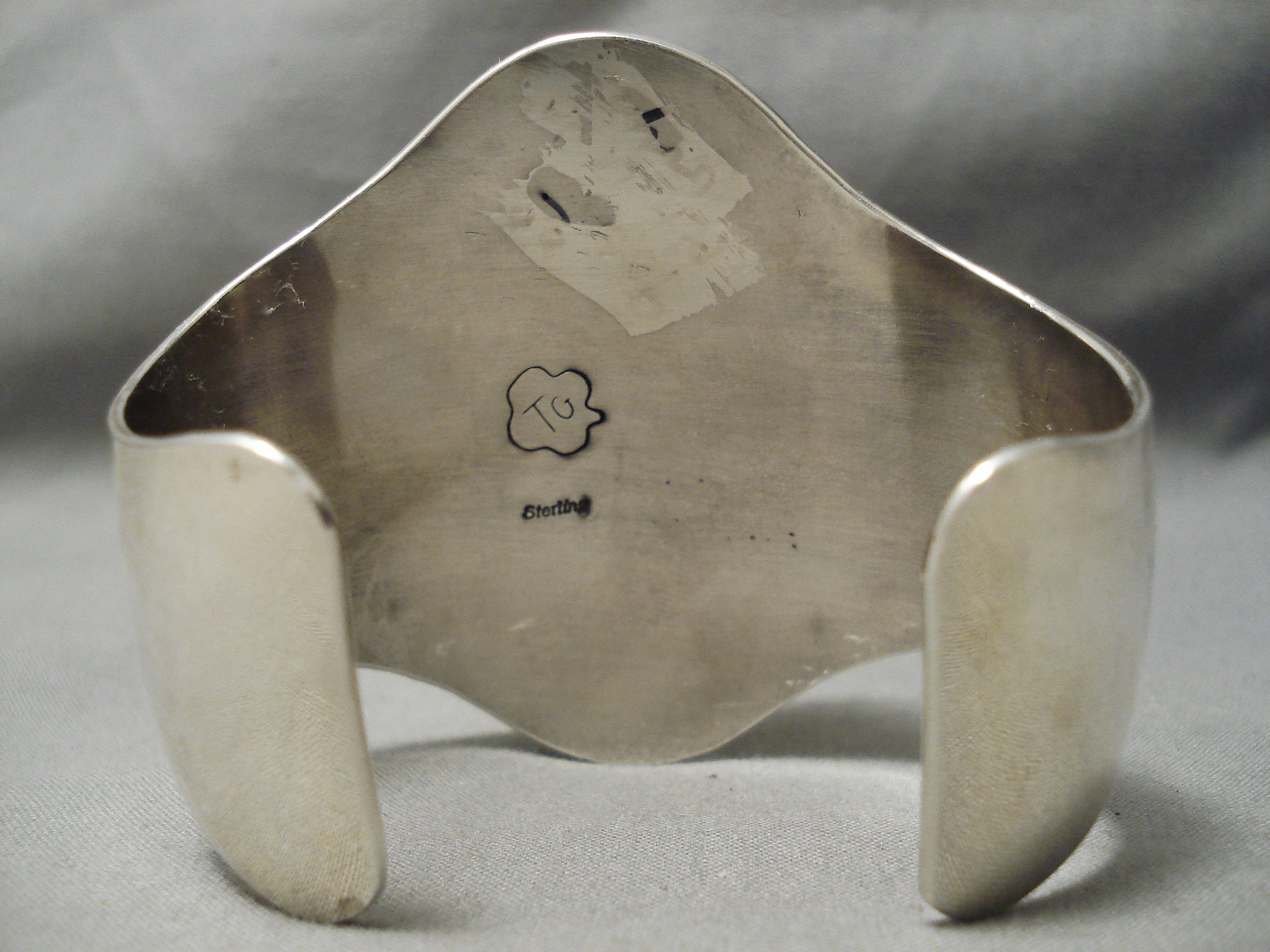 This is an astonishing vintage Navajo huge single stone silver bracelet. This outstanding piece contains a large hand carved turquoise leaf. The turquoise appears to be from the fabulous old Royston turquoise mine. This is an absolutely remarkable piece as you can tell that the artist made the entire focus be on the center hand carved stone. The center stone measures around 1-3/4" x 1-1/2". The width of the bracelet measures around 2-1/2". Signed by Navajo artist, Ted Goodla. Sterling silver, marked. Cir. 1970's+. The inside end to end measures around 5-1/2" with an additional 1-1/4" gap. Sturdy 73 grams.