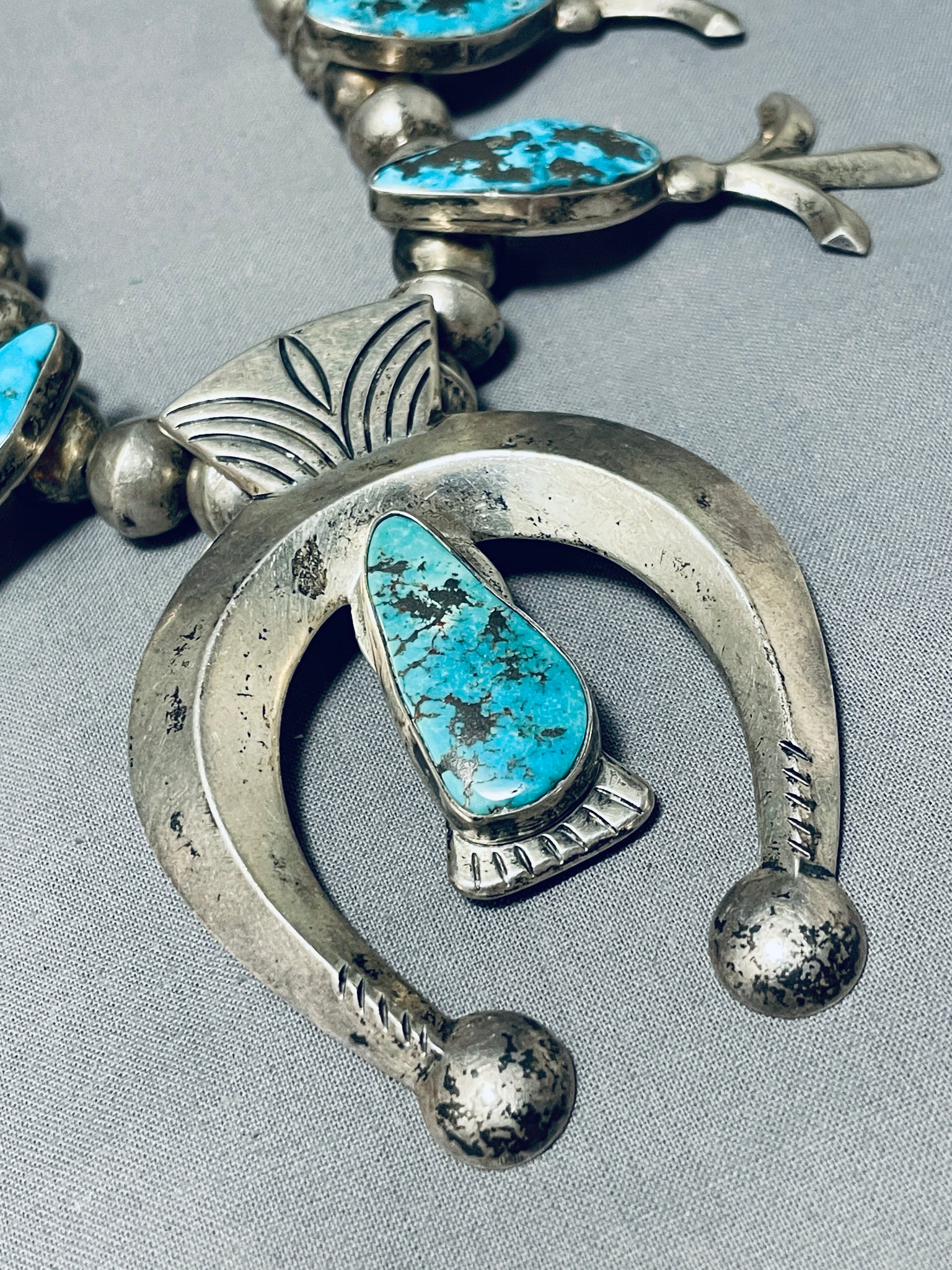 Best Vintage Native American Navajo Morenci Turquoise Sterling Silver Squash Blossom Necklace