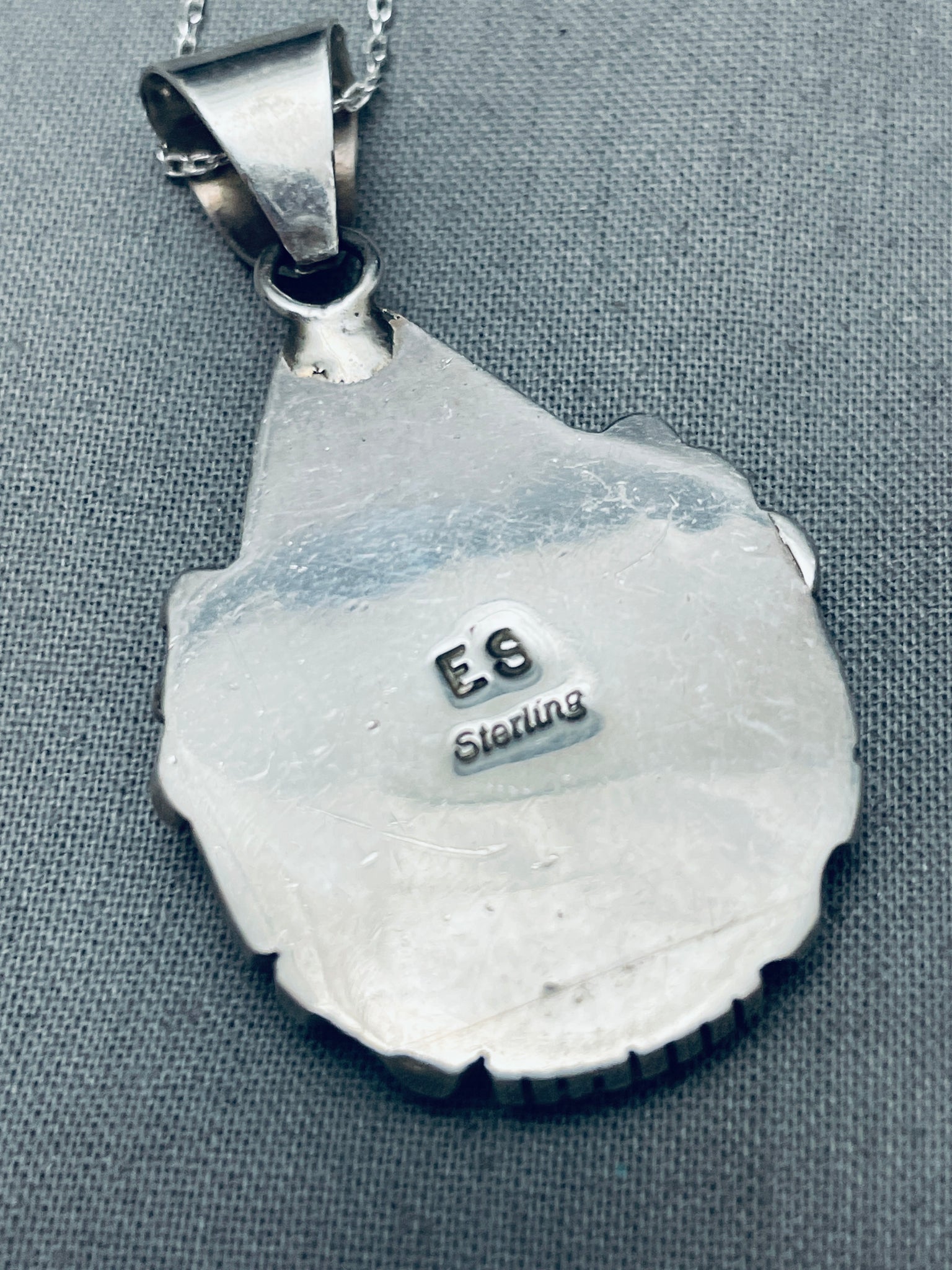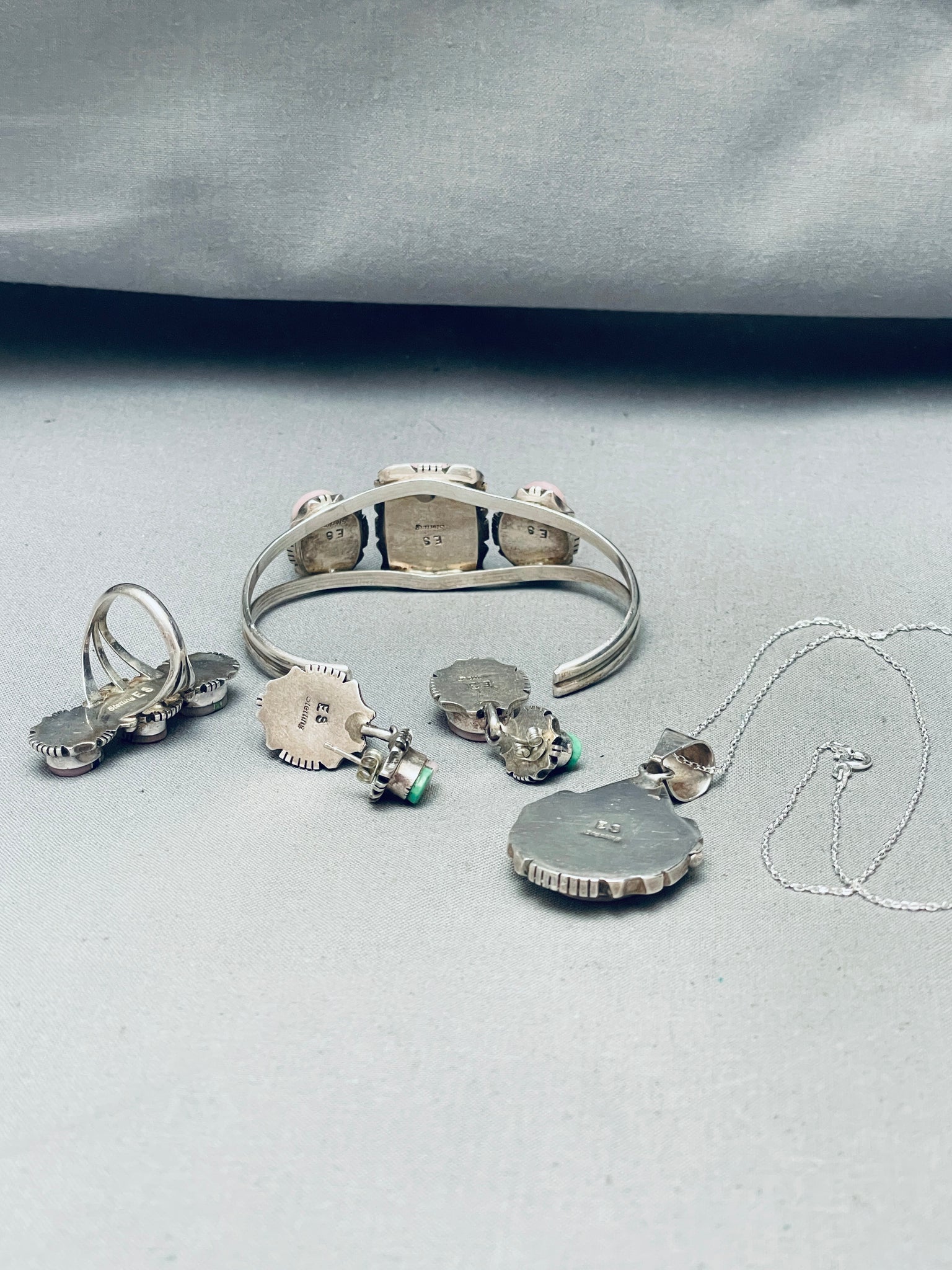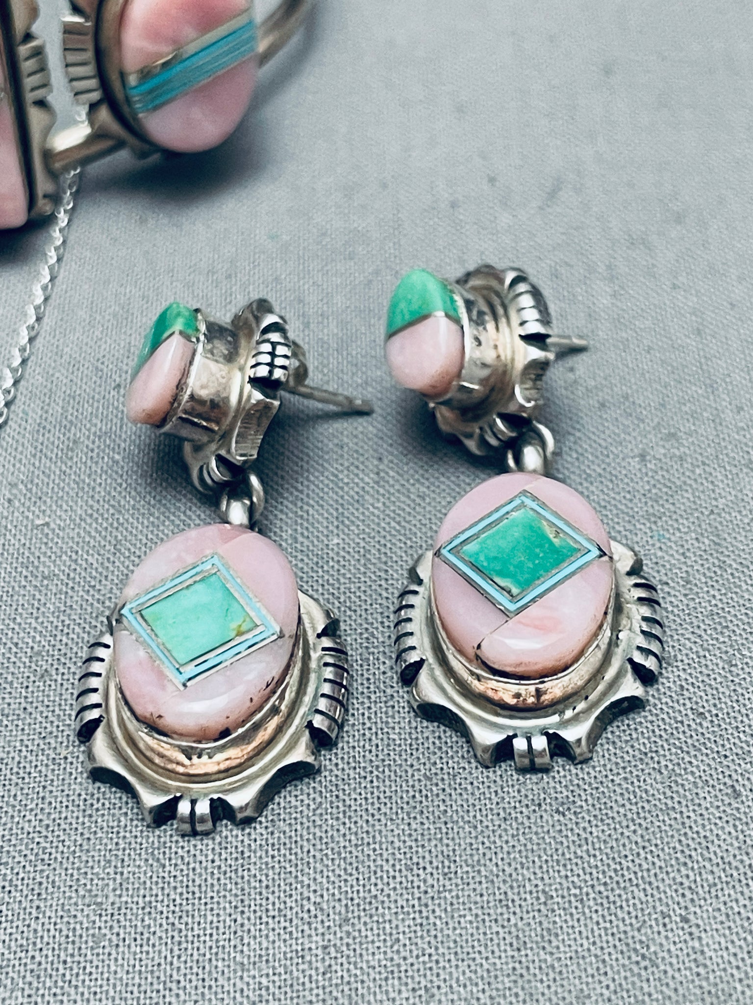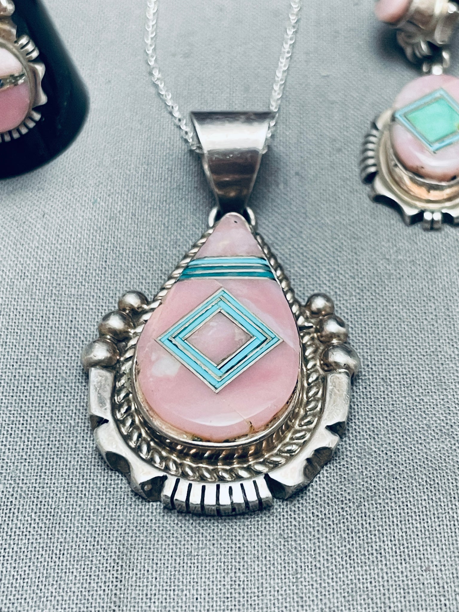 This is a marvelous vintage Navajo inlaid necklace set. This phenomenal necklace comes with a matching bracelet, ring and earrings. Each piece consists of outstanding inlay that includes rose quartz with accenting Sleeping Beuty turquoise. The way the artist inlaid the stones is absolutely beautiful. Located on the necklace is a fascinating teardrop shaped silver pendant with a large silver bail. The pendant consists of raindrops, ropes, wave patterns and channel works and measures a stunning 2" X 1" inluding the large silver bail. The bracelet contains three beautiful inlaid sections with the two outer sections being oval shaped and the center being rectangular shaped. Surrounding each inlaid section are marvelous silver works that consist of wave works and channel patterns. The bracelet contains a fascinating double silver shank cuff that graduates in width towards the center. The height at the center of the bracelet measures around 1-1/8". The bracelet measures to fit a wrist size of about 7". Each earring contains two inlaid sections with beautiful surrounding silver works that also consist of wave works and channel patterns. Each earring measures around 1-1/2" X 3/4". The ring contains three stunning inlaid sections that all consist of matching surrounding silver works. The ring face measures a stunning 1-5/8" X 1/2" and the ring measures to be a size 7.5. Sterling silver, marked. Cir. 1970's+. Signed by Navajo artist, Eddie Secatero. The length of the necklace measures around 21". Sturdy 73 grams.