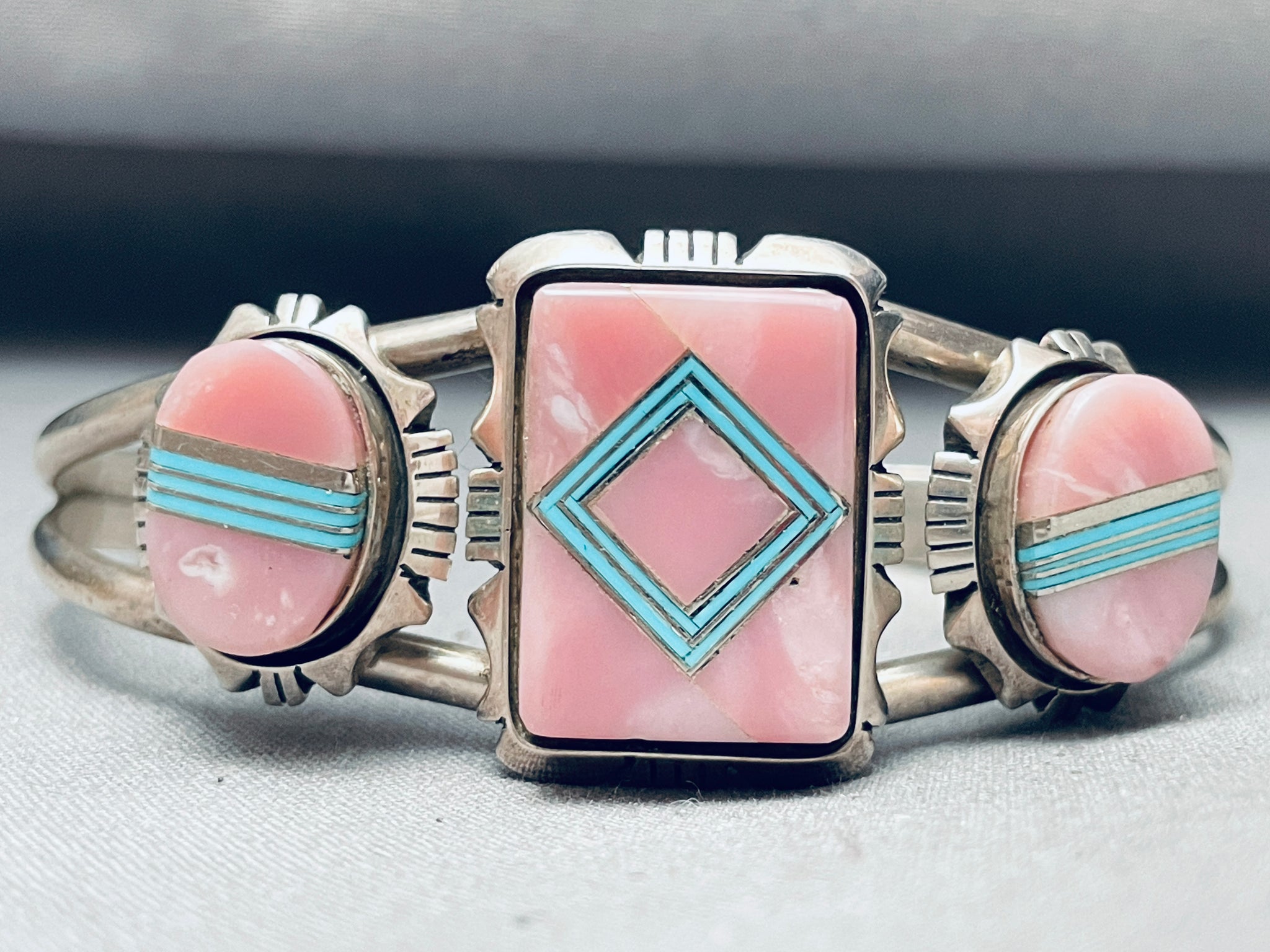 Best Vintage Native American Navajo Rose Quartz Turquoise Inlay Sterling Silver Bracelet