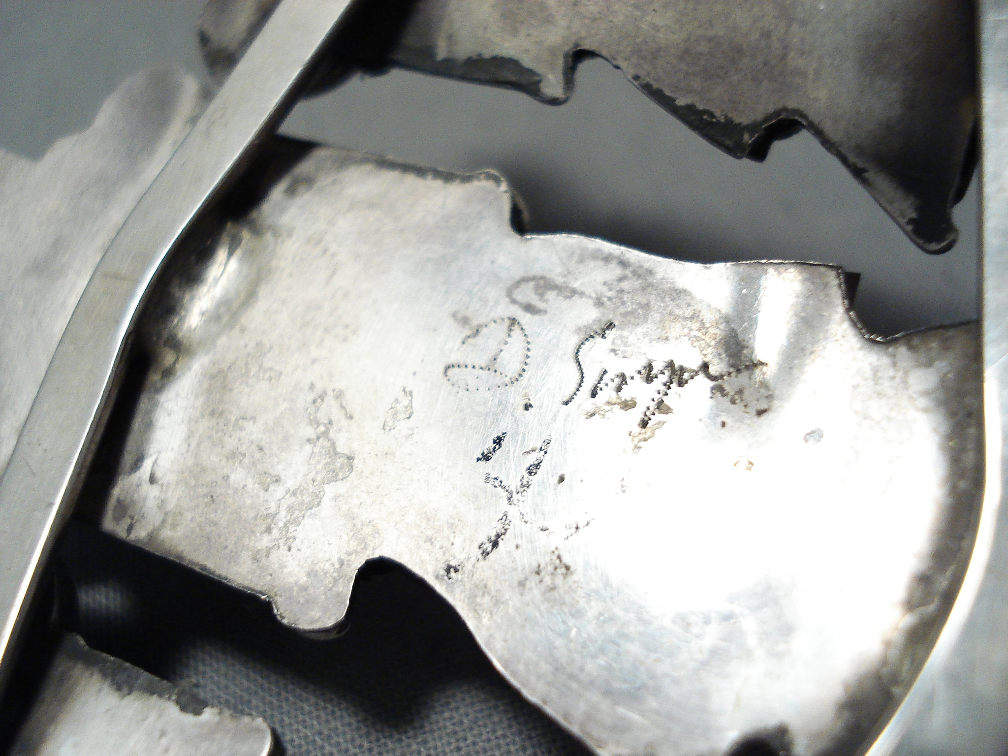 This is an astonishing vintage Navajo three hand carved silver kachina bracelet. This is one of the finest kachina bracelets we have ever collected as the kachinas are just so intricate and detailed. The largest center kachina measures around 3-1/8" X 1-1/8". What makes this kachina bracelet even more unique is that it was handmade by the Singer family. Located throughout the silver kachinas are wonderful old Sleeping Beauty turquoise stones. Resting at the sides of the incredible double silver shank cuff are amazing silver fan flanks. The largest stone measures around 5/8" x 3/8". The width of the bracelet measures around 3-1/8". Signed by Navajo artist, D. Singer. Sterling silver. Cir. 1970's+. The inside end to end measures around 5-3/4" with an additional 1-1/4" gap. Sturdy 68 grams.