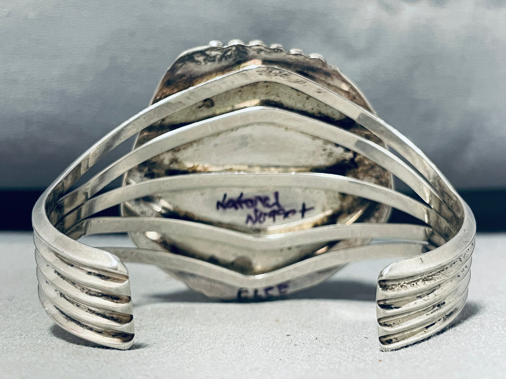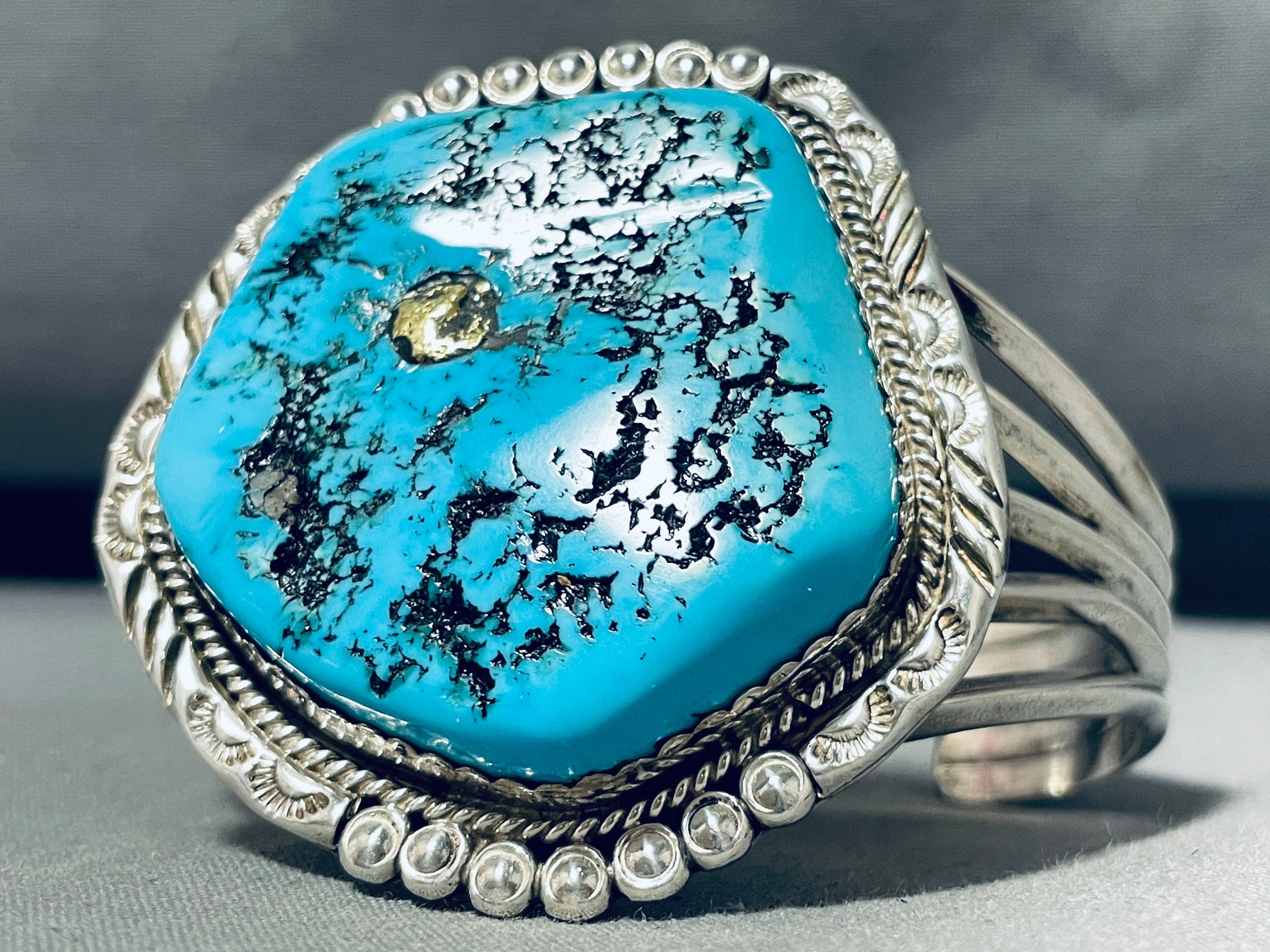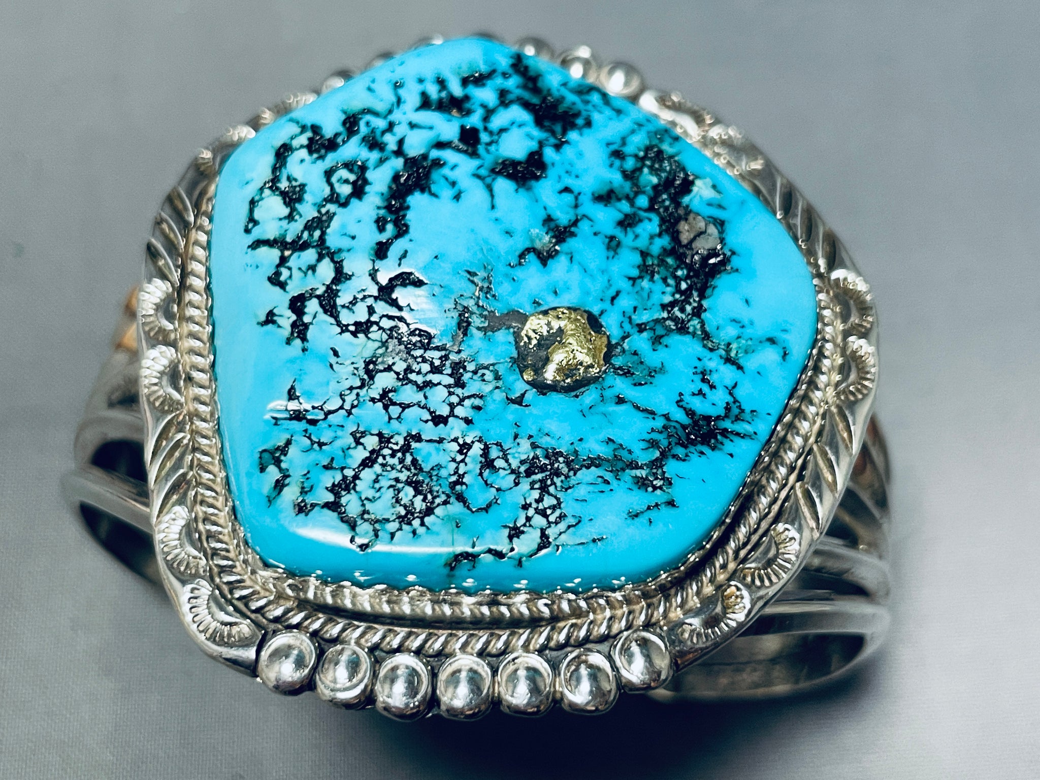 Best Vintage Native American Navajo Sleeping Beauty Turquoise Gold Nugget Silver Bracelet