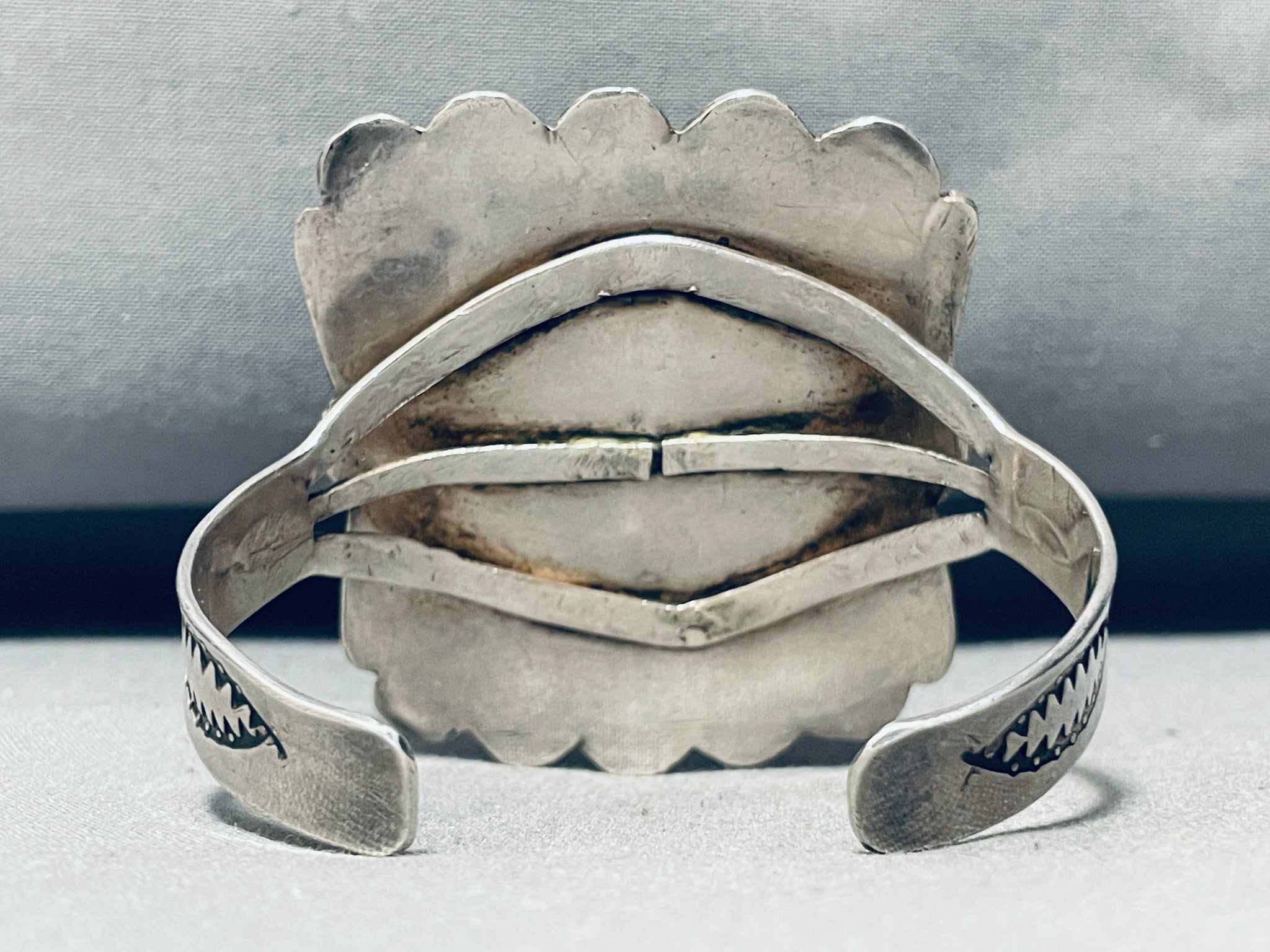 This is a tremendous vintage Navajo large single stone silver bracelet. This bracelet contains such a large square shaped grey to brown colored petrified wood stone that measures a whopping 1-7/8" X 1-7/8". Surrounding the beautiful stone are impeccable silver works that consist of wave works, ropes, stems, and raindrops. This bracelet contains a superior triple silver shank cuff that graduates into one shank towards the ends. Running down the ends are striking silver stampings. The width of the bracelet measures around 2-3/8". Sterling silver. Cir. Mid century . The inside end to end measures around 5-1/2" with an additional 1" gap. Sturdy 59 grams.
