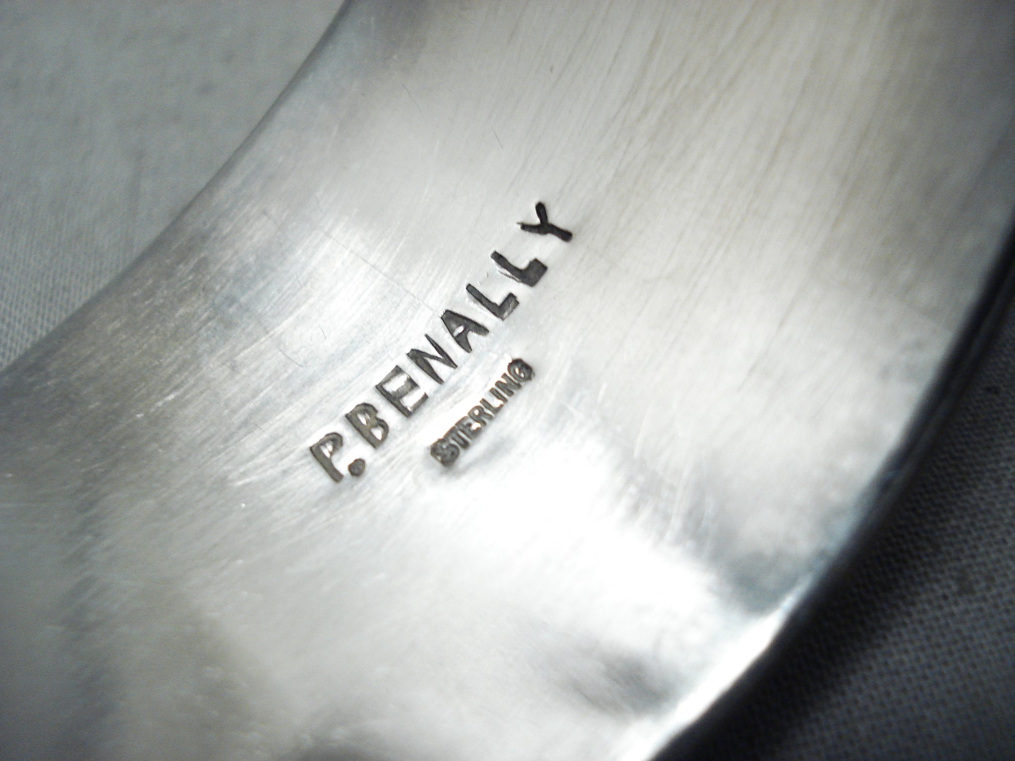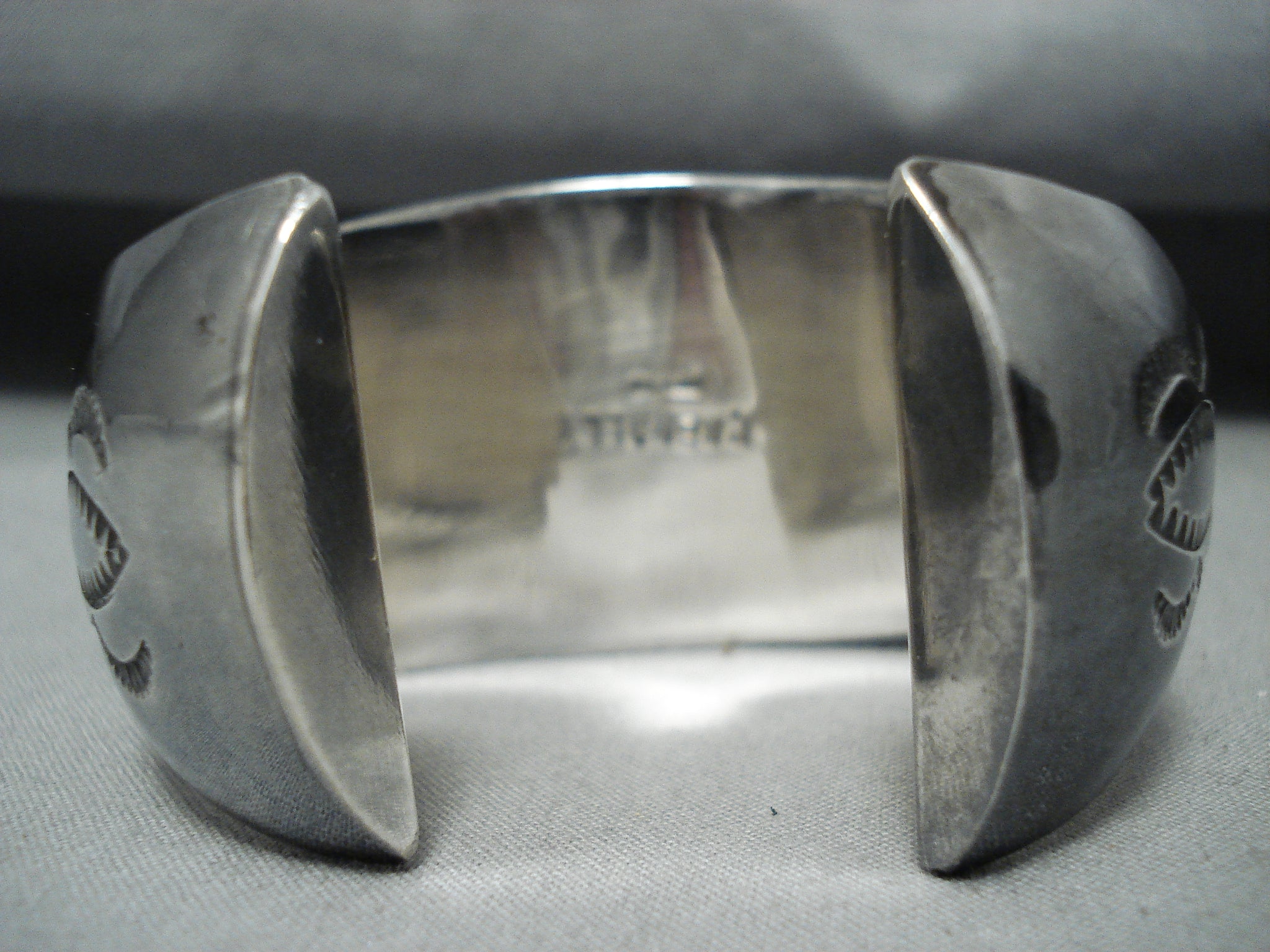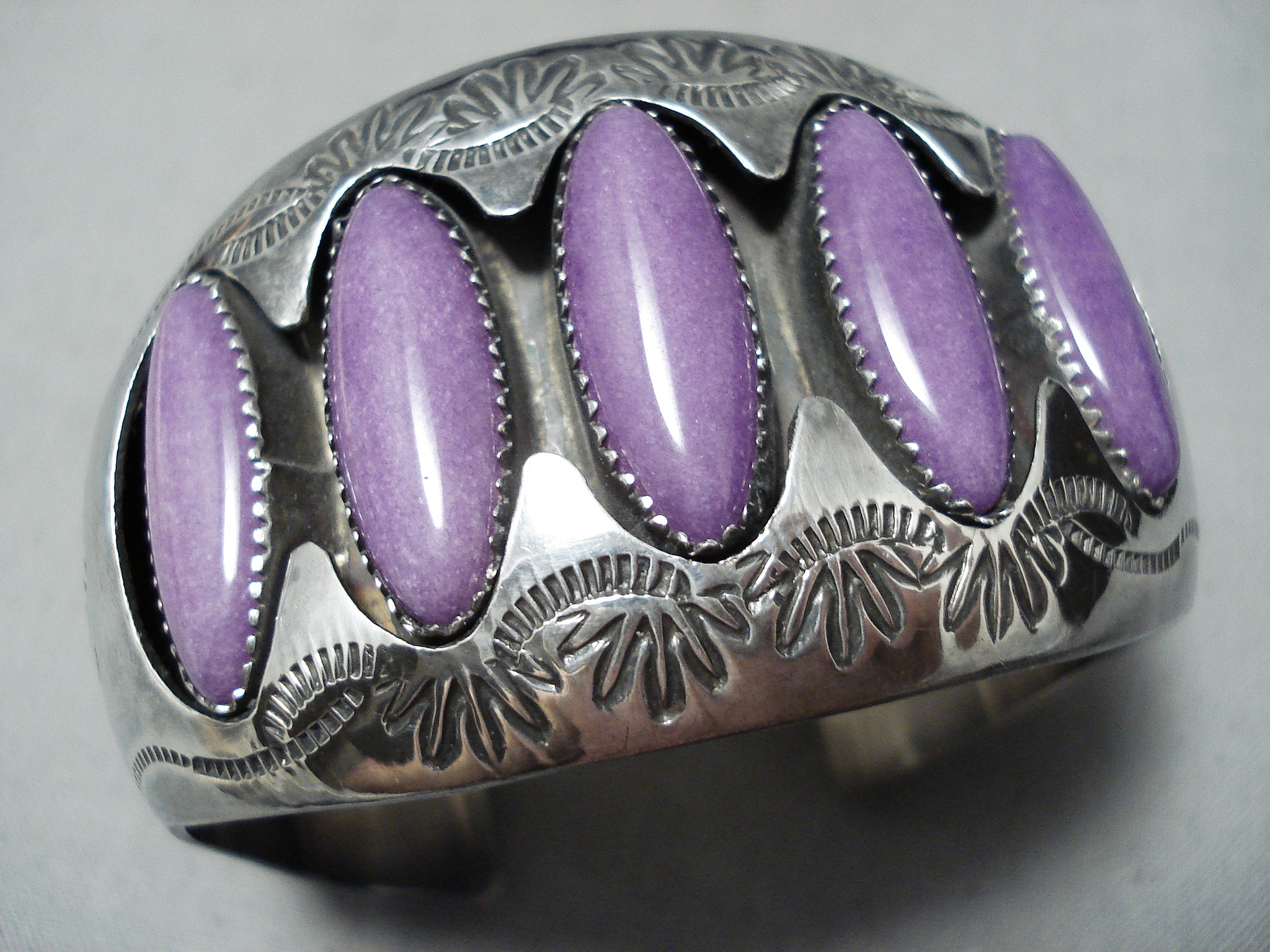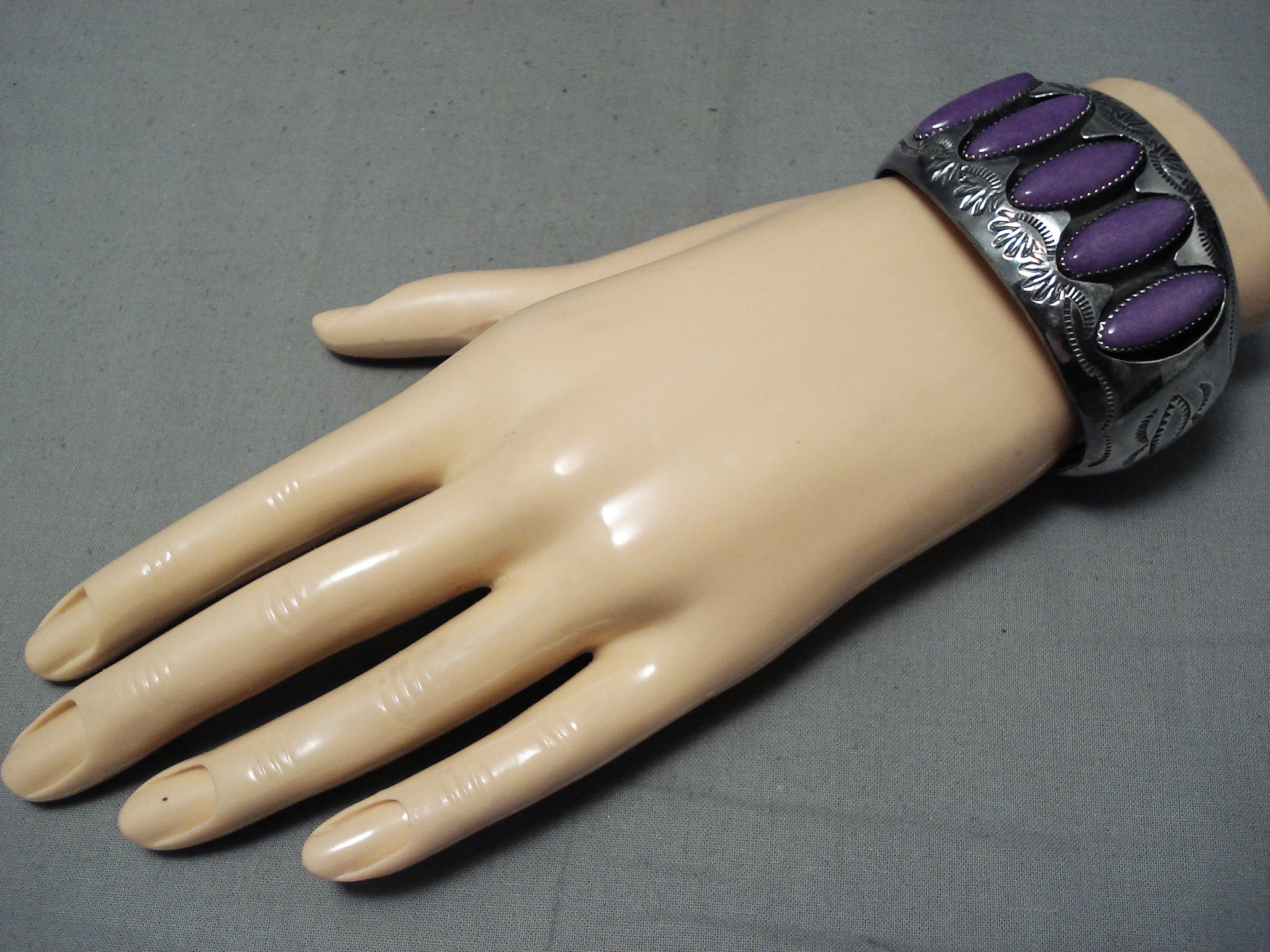 This is an impressive vintage Navajo five stone very large and wide silver bracelet. This remarkable piece contains five beautiful dome shaped purple stones that are placed in a wonderful cloud shaped shadow box setting. Bordering the edges of the very thick cuff are stunning plant and sun stampings. Running down the ends of the cuff are superior cloud stampings. The stones measure around 7/8" x 1/4". The width of the bracelet measures around 1-1/2". Signed by Navajo artist, Pam Benally . Sterling silver, marked. Cir. 1970's+. The inside end to end measures around 5-1/2" with an additional 1" gap. Sturdy 54 grams.