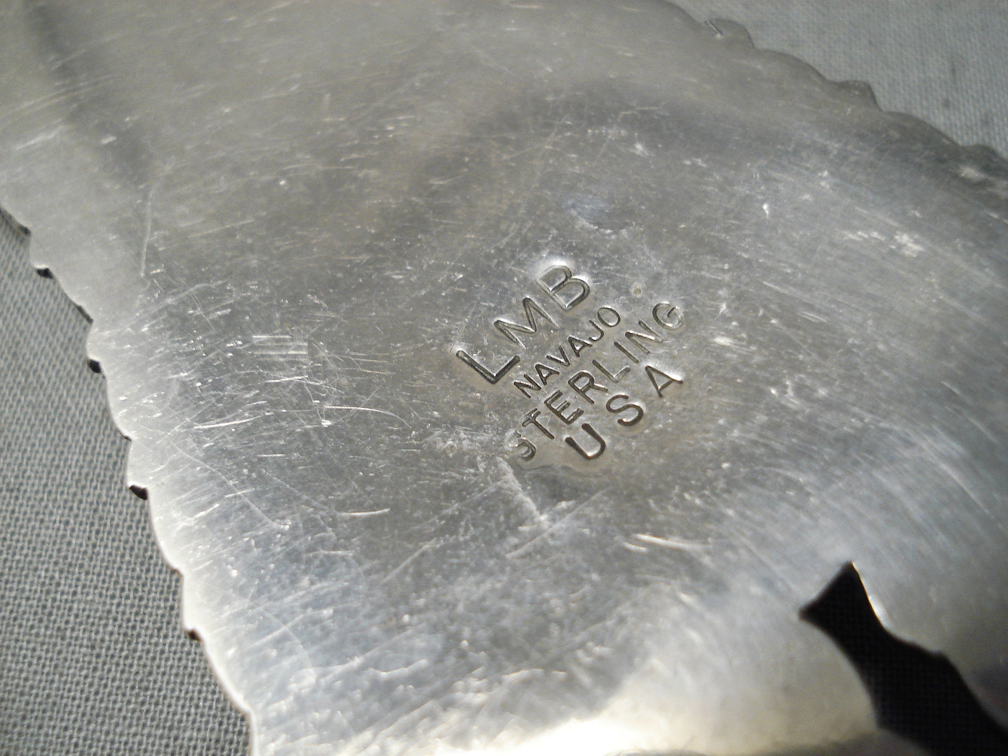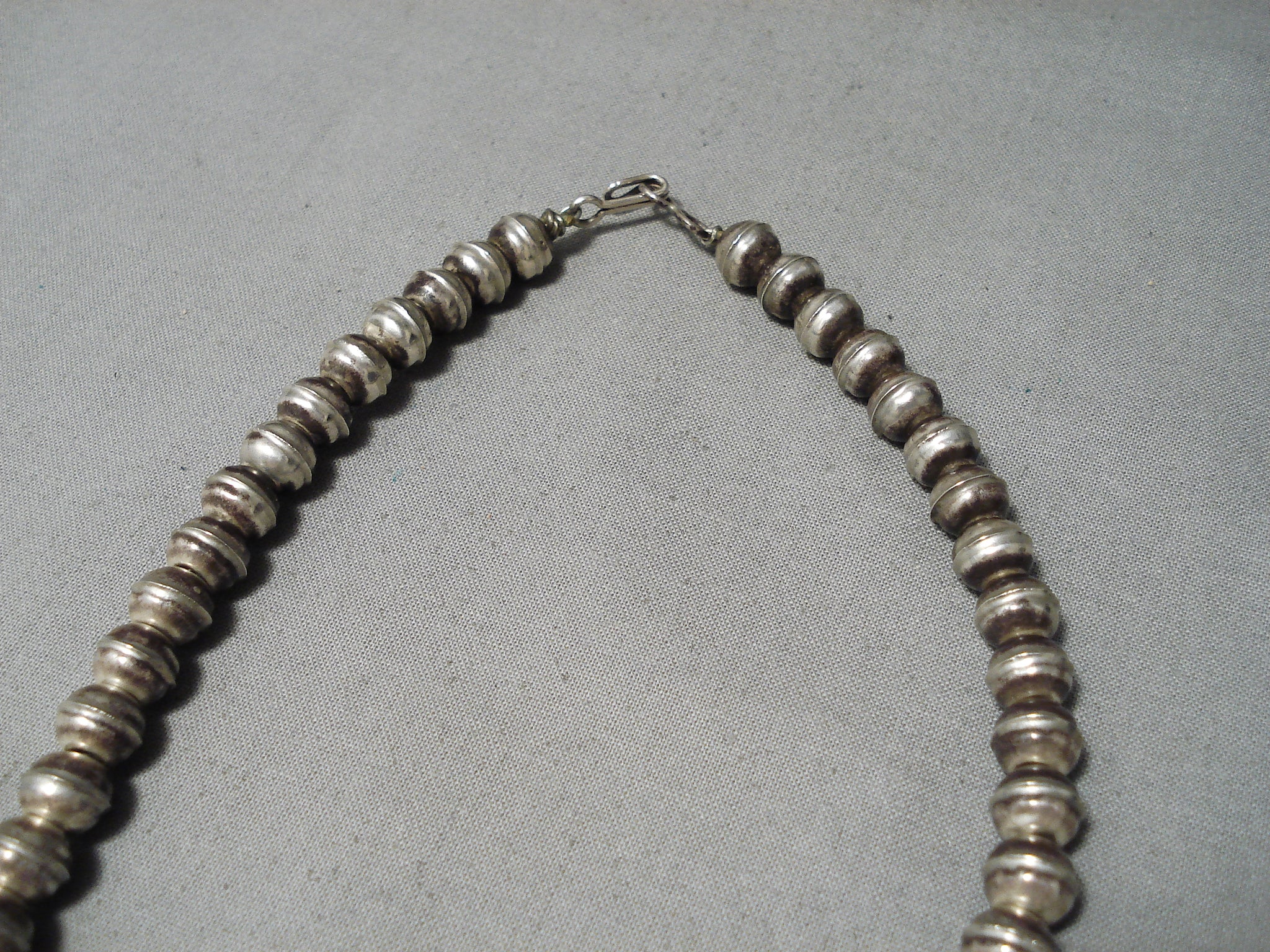 This is a magnificent vintage Navajo turquoise and silver squash blossom kachina necklace. This museum qualtiy and incredibly important squash blossom necklace is one of the finest we have collected this year as it was handmade by the famous artist, Larry Moses Begay. This necklace is authentic, please be aware and careful of the fakes out there. Resting at the bottom is a gigantic 5-1/2" X 2-1/2" turquoise silver kachina naja pendant. The naja alone consists of 94 beautiful turquoise stones. Running up the necklace are four huge rounded sun face squashes that consist of more remarkable turquoise stones. This necklace contains large round silver beads with a traditional silver clasp. Sterling silver, marked. Cir. 1970's+. Signed by Navajo artist, Larry Moses Begay . The length of the necklace measures around 32". Sturdy 245 grams.