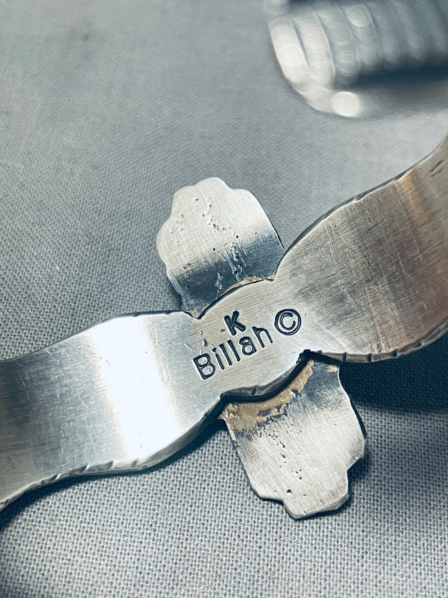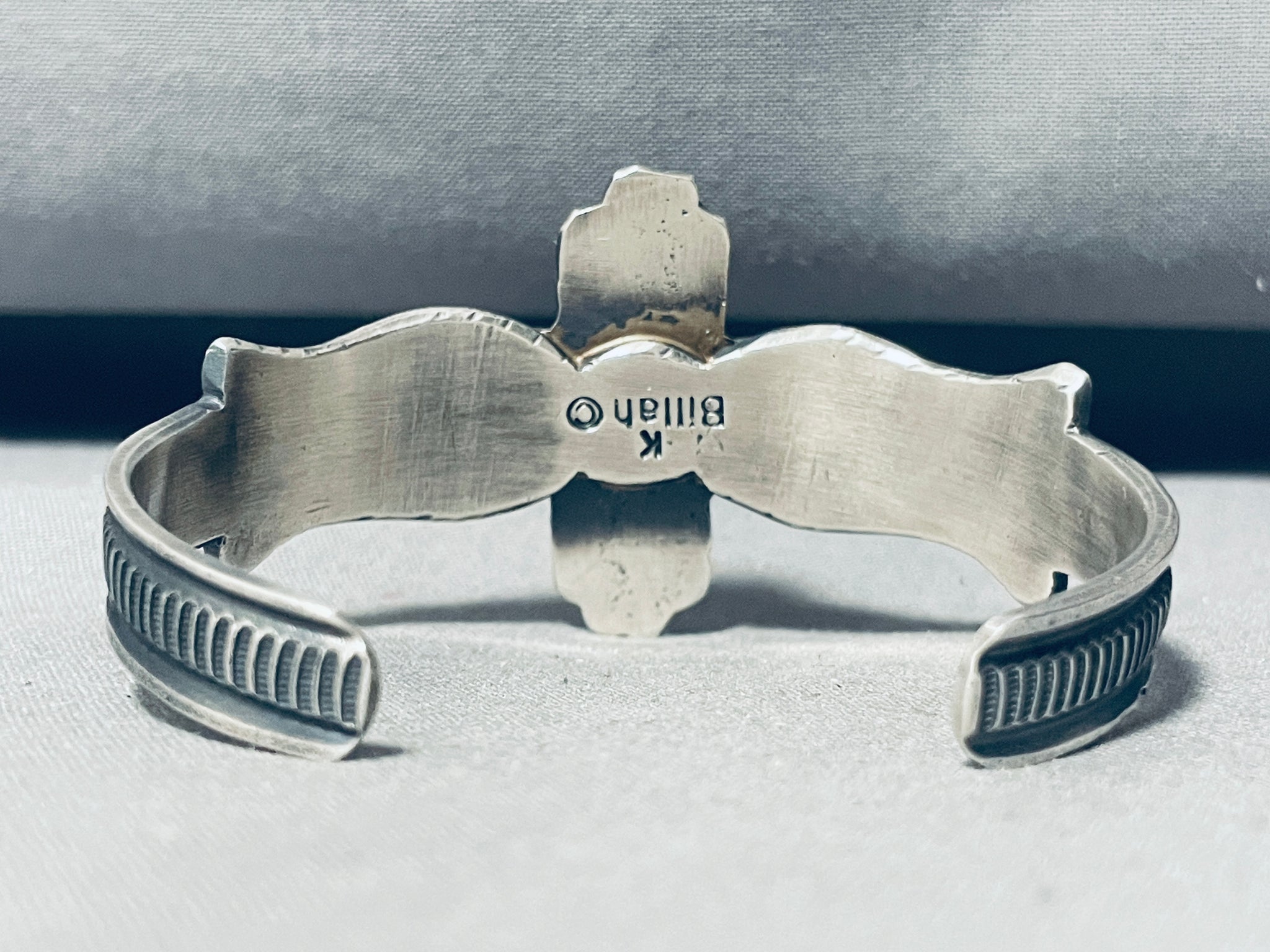This is an incredible vintage Navajo single stone silver Zia symbol cuff bracelet. This outstanding bracelet contains a center remarkable hand carved silver Zia symbol which is the state of New Mexicos symbol. Located in the center of the symbol is a marvelous chunky Blue Gem turquoise stone. Runnign down the ends of the bracelet are fascinating silver works that include diamond shaped patterns, shells, sun stampings, and channel works. This bracelet is such a wonderful piece of art. The center stone measures around 3/8" x 3/8". The width of the bracelet measures around 1-3/8". Signed by Navajo artist, Kev Billah. Sterling silver. Cir. 1970's+. The inside end to end measures around 5-1/4" with an additional 1-1/4" gap. Sturdy 36 grams.