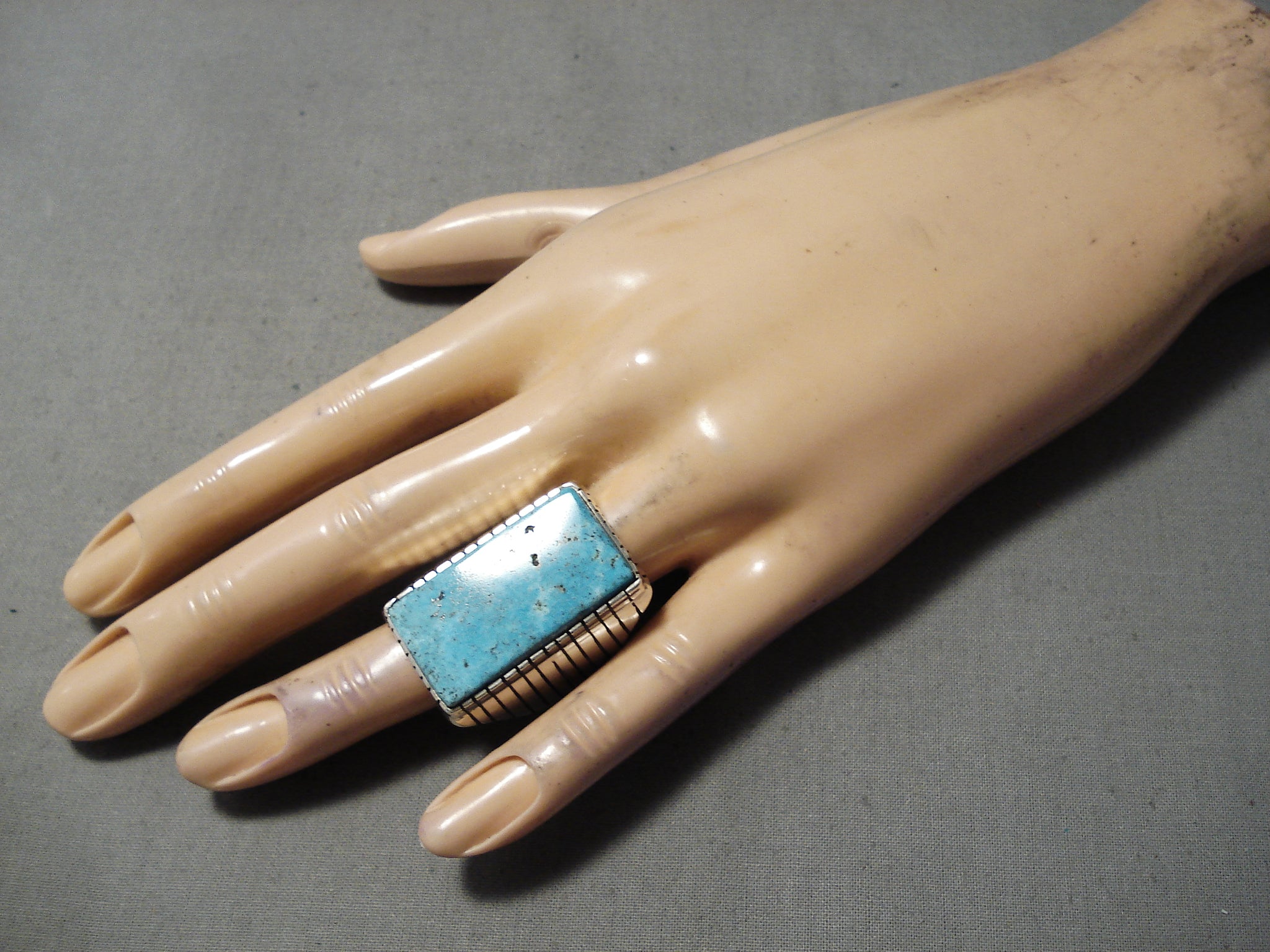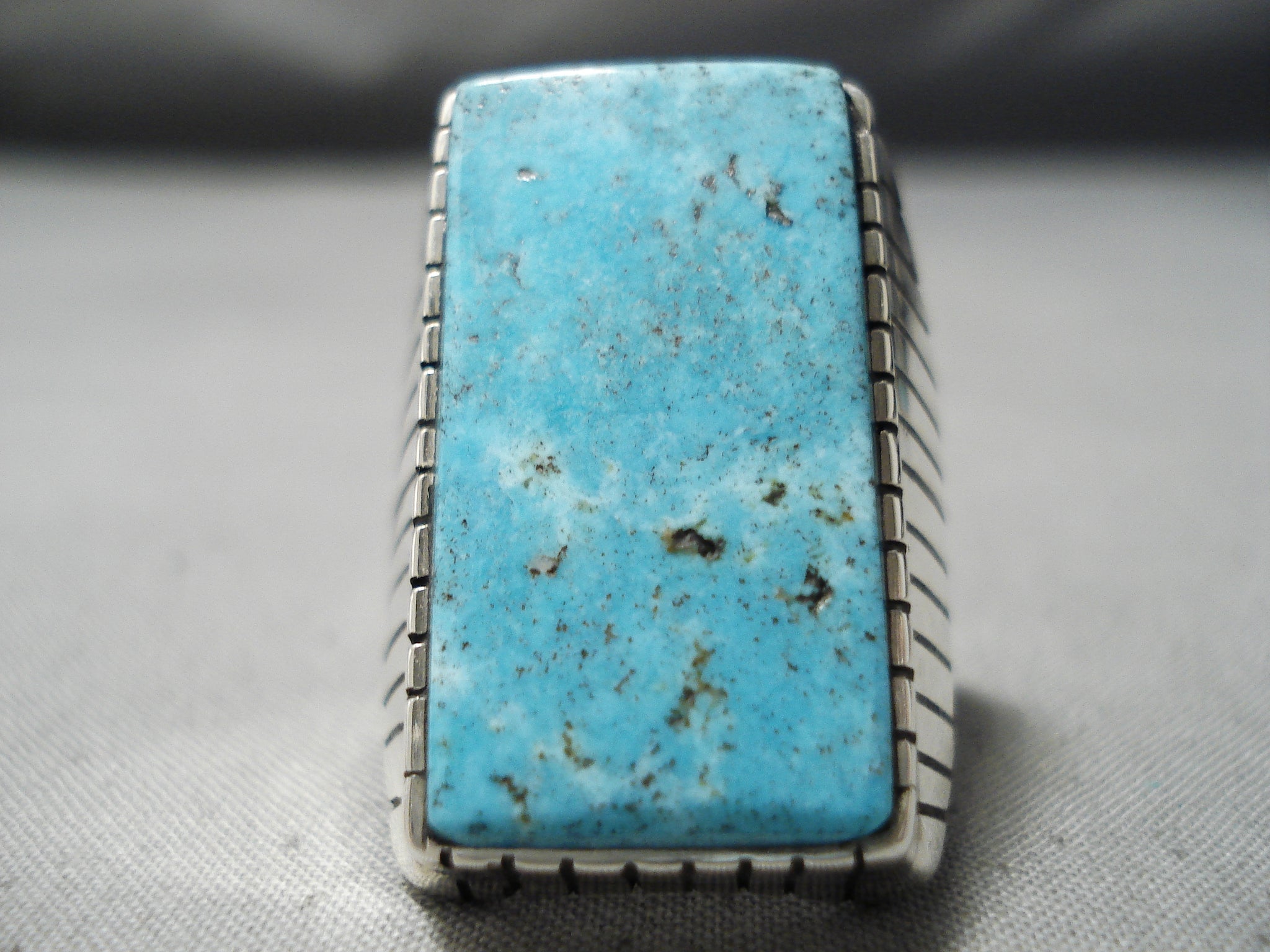This is a superlative vintage Navajo silver ring. Wow! What a cool ring design is this! It perfectly complements and shows off the incredible handpicked chosen turquoise stone! The impressive picket fence setting completely & beautifully frames the large rectangular shape Kingman turquoise stone, as the picket fence design continues down the wide sides of the band as they gently taper toward the back. The center stone measures around 1-1/8" x 5/8". The ring face measures around 1-3/16" x 1". The ring size is around 13. Sterling silver, marked. Sturdy 26 grams.