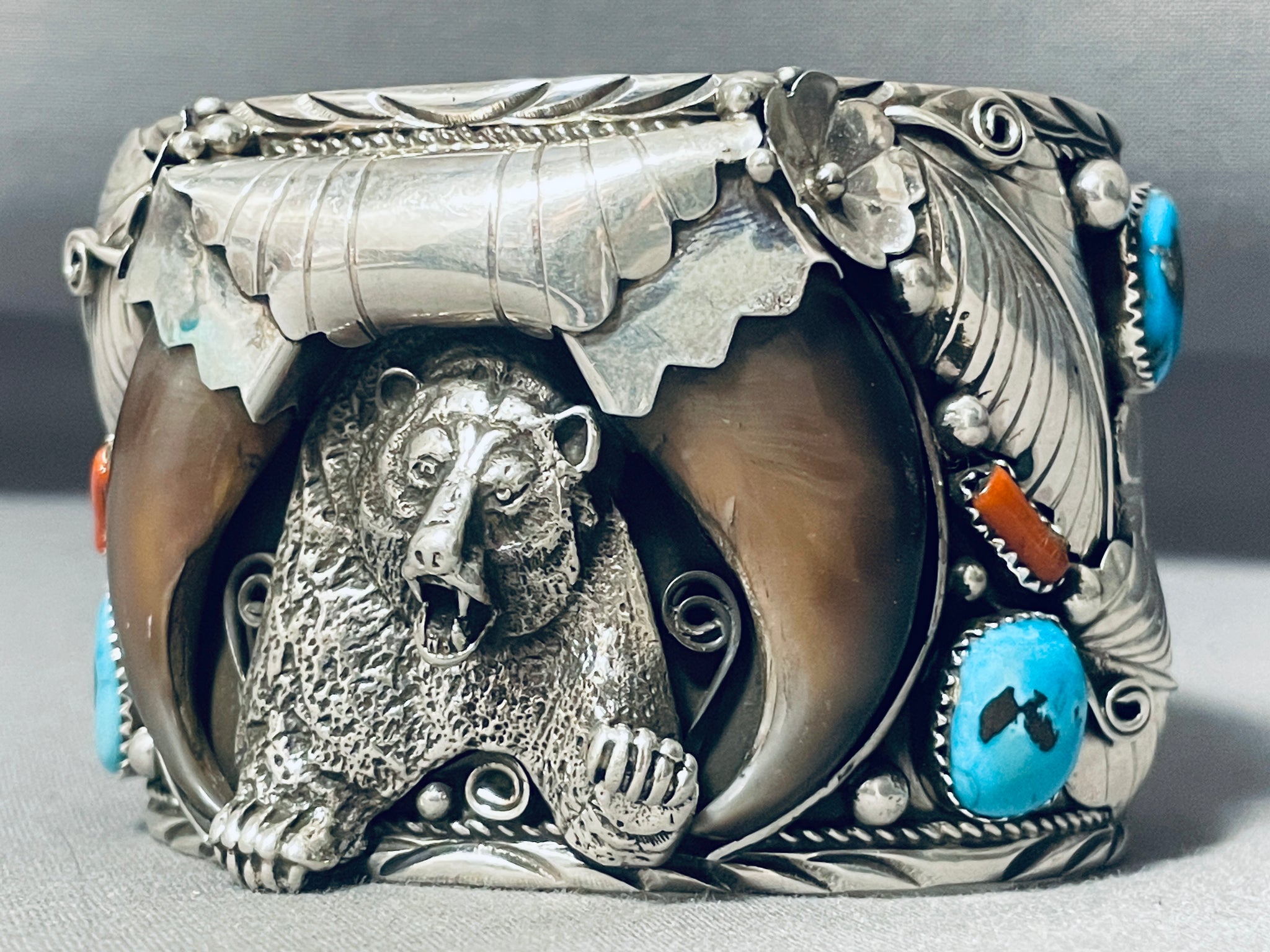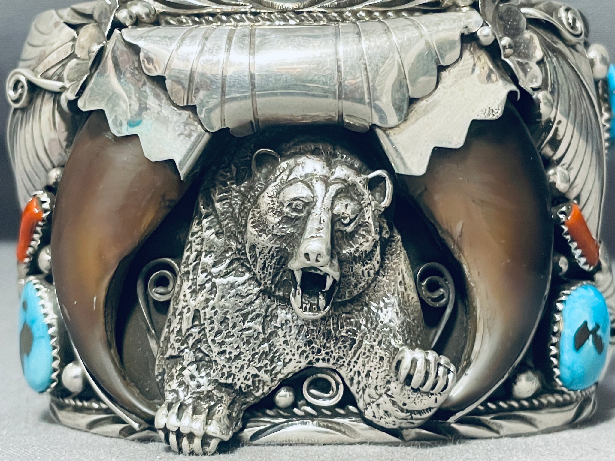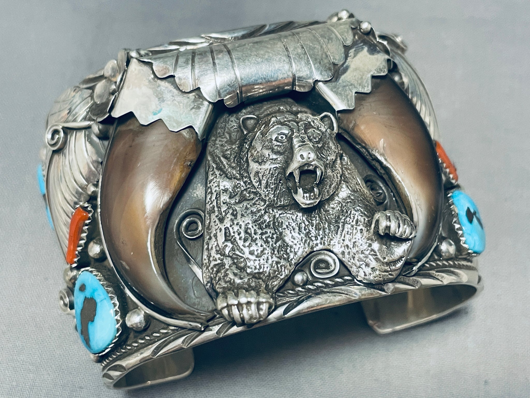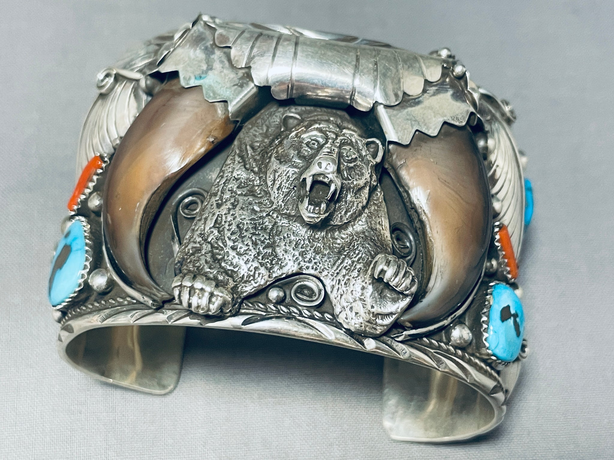 Big Mens Native American Navajo Turquoise Coral Sterling Silver Bear Bracelet