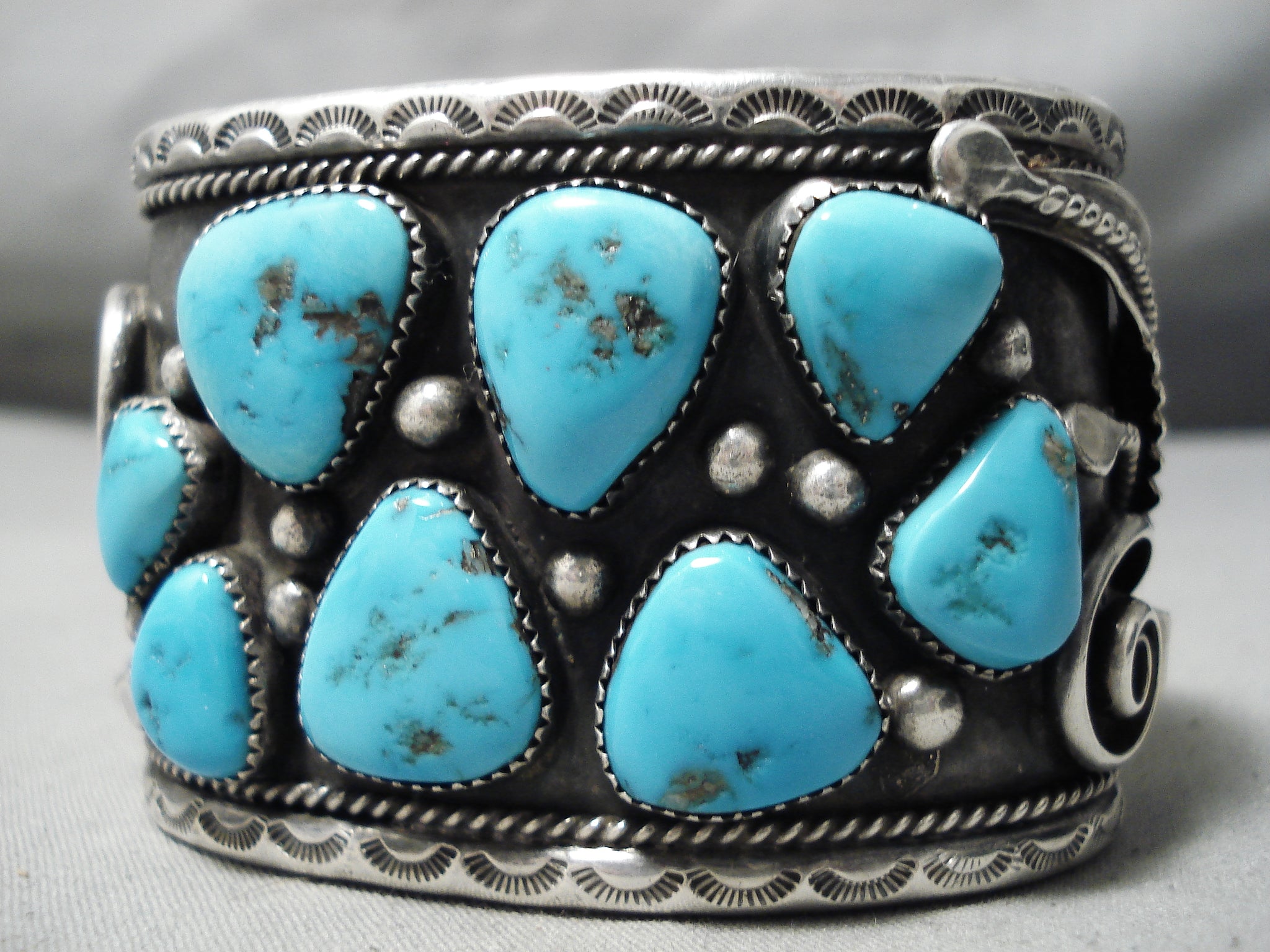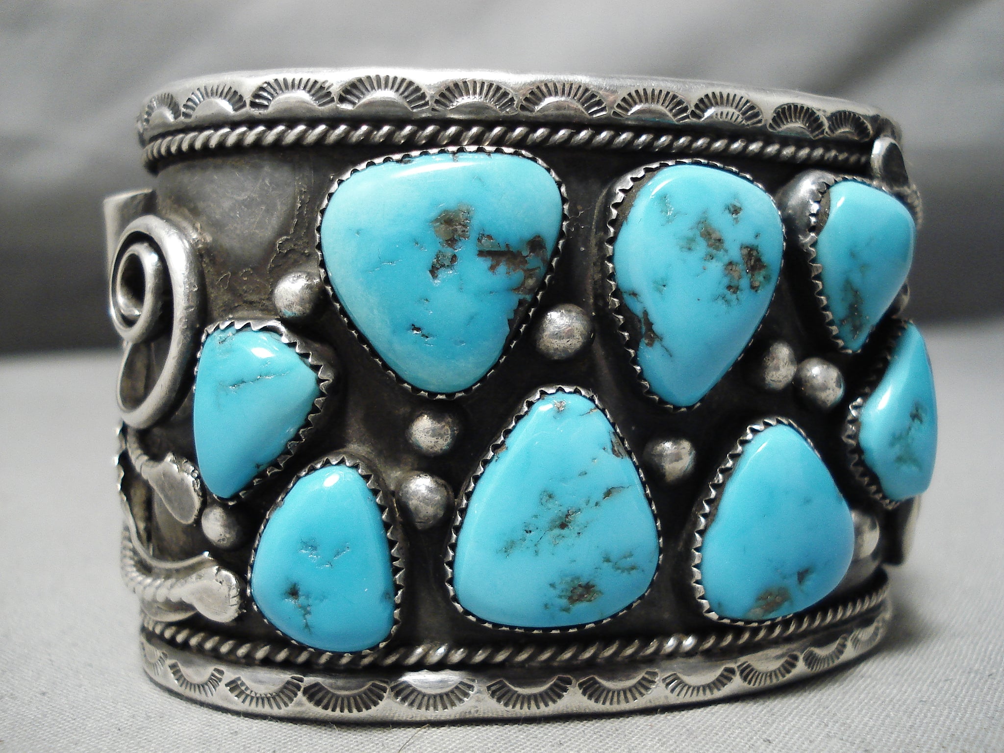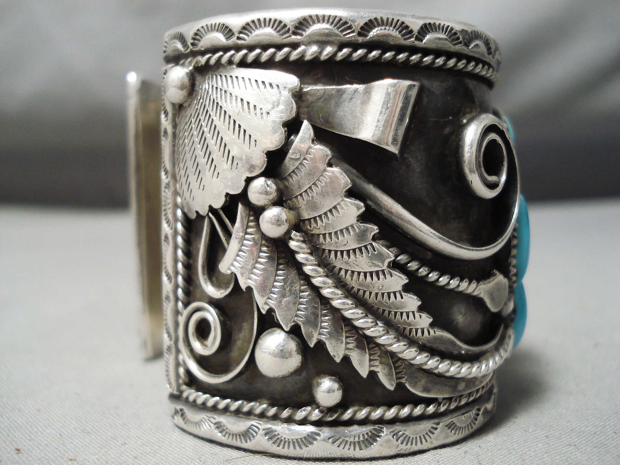 Big Old Men's Vintage Native American Navajo Turquoise Sterling Silver Leaf Bracelet
