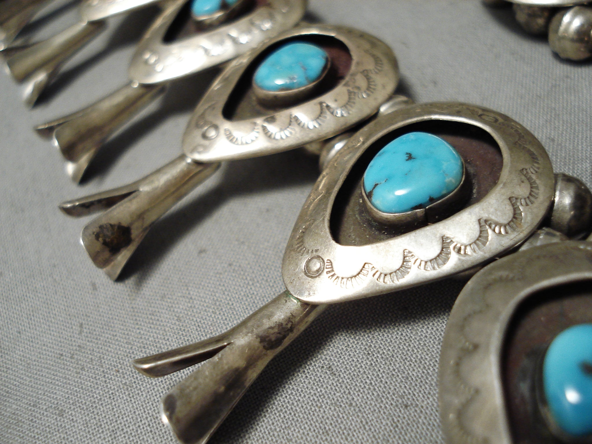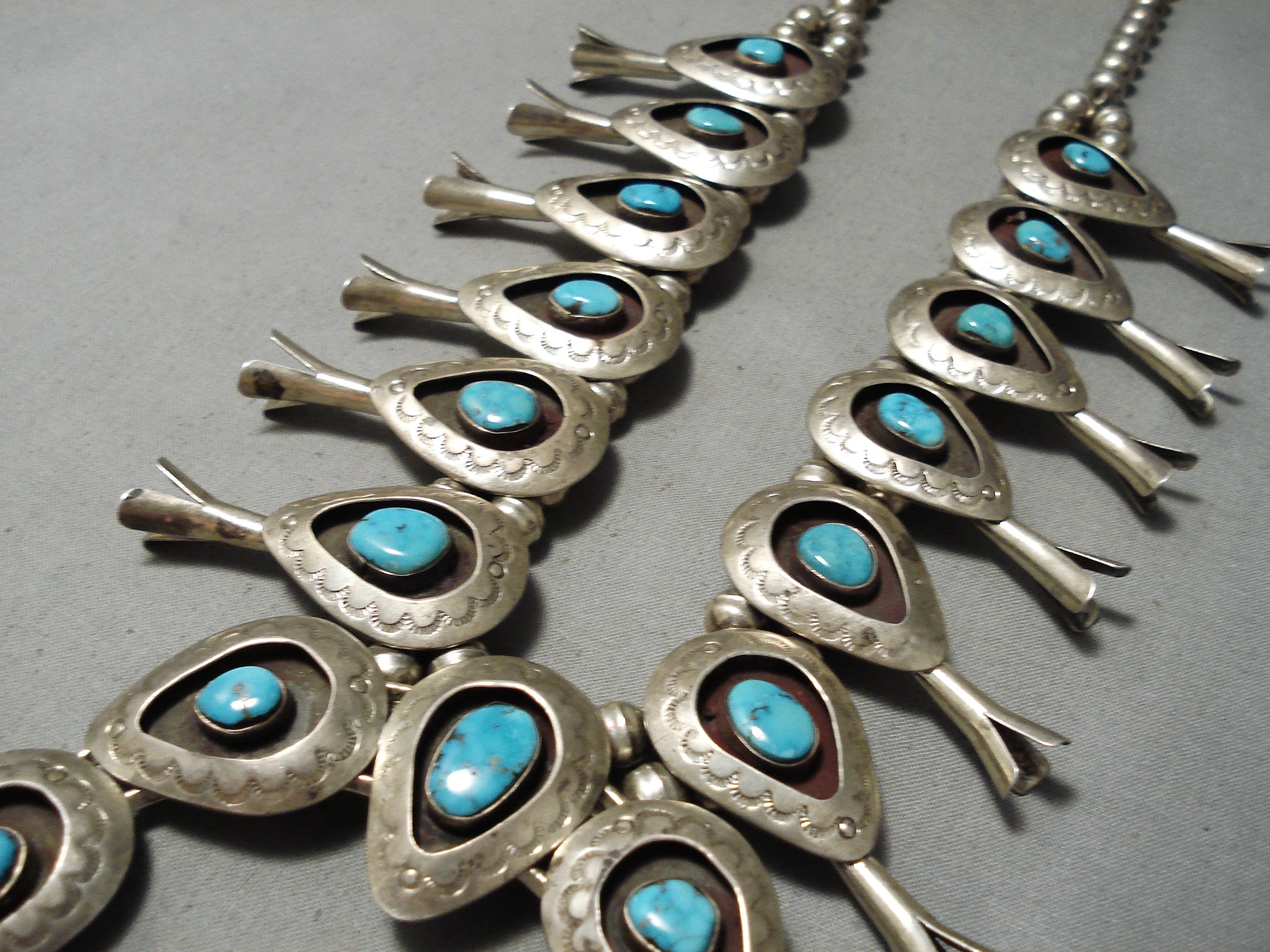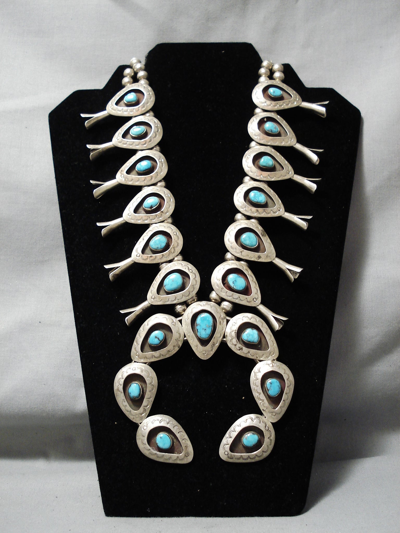 Big Vintage Native American Navajo Carico Lake Turquoise Sterling Silver Squash Blossom Necklace