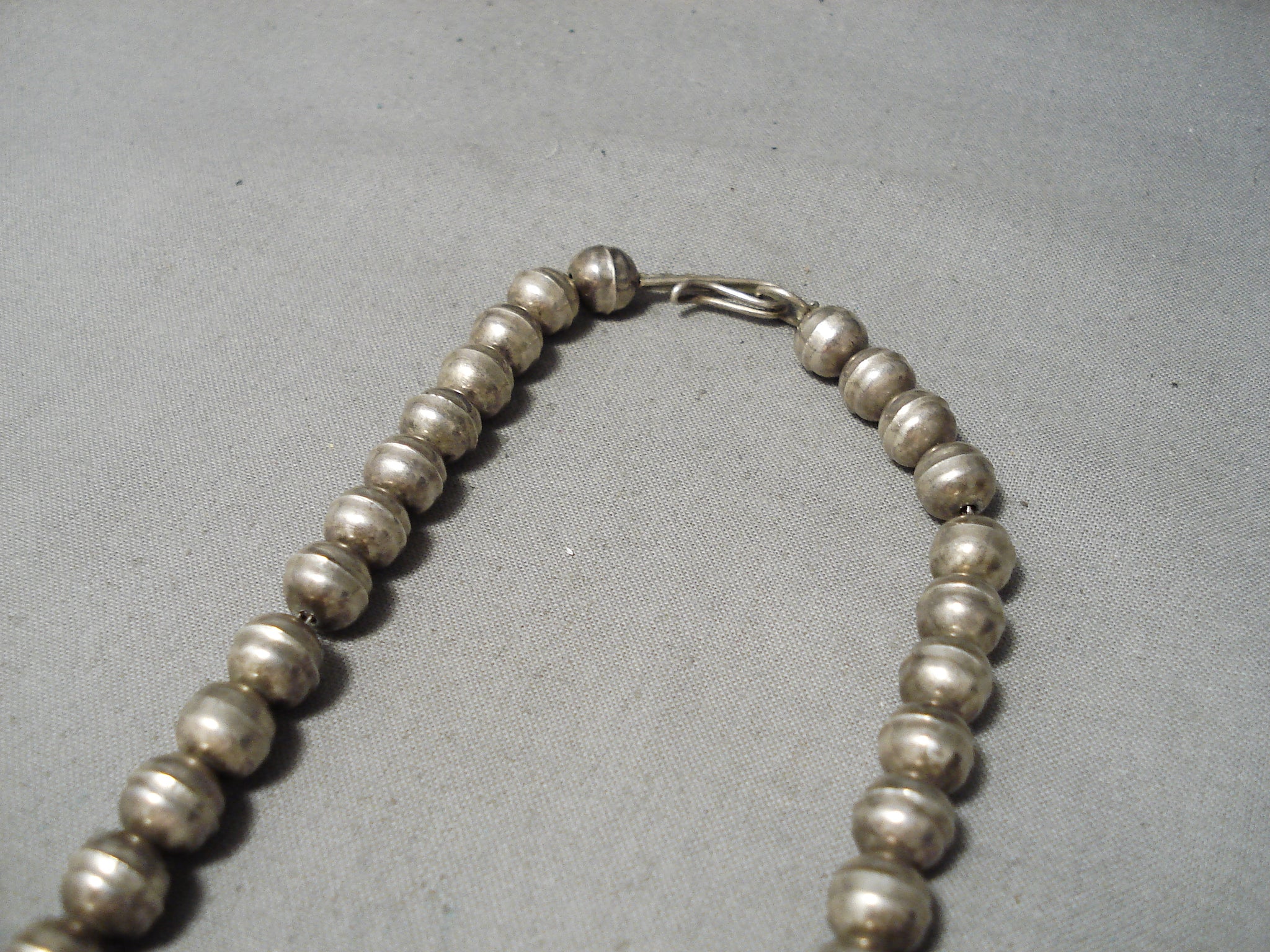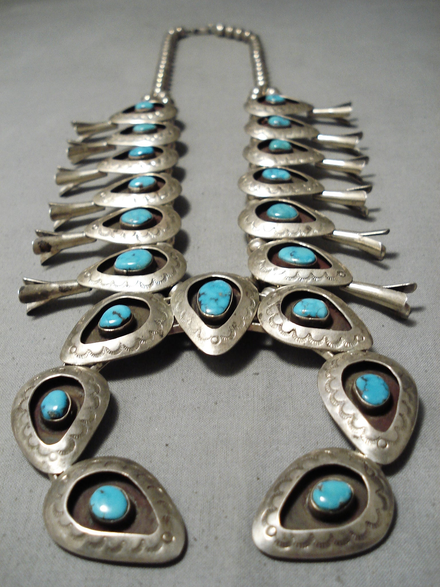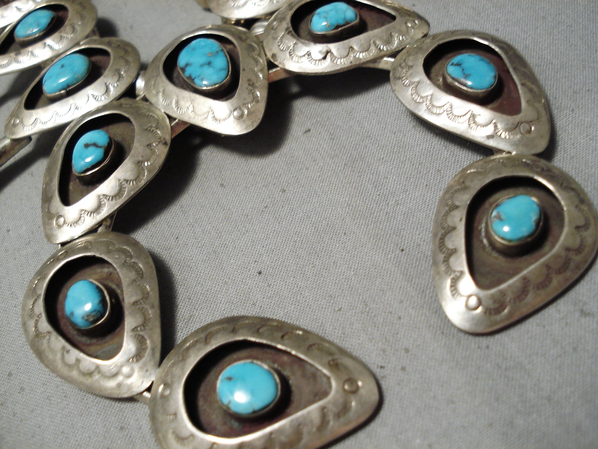 Big Vintage Native American Navajo Carico Lake Turquoise Sterling Silver Squash Blossom Necklace