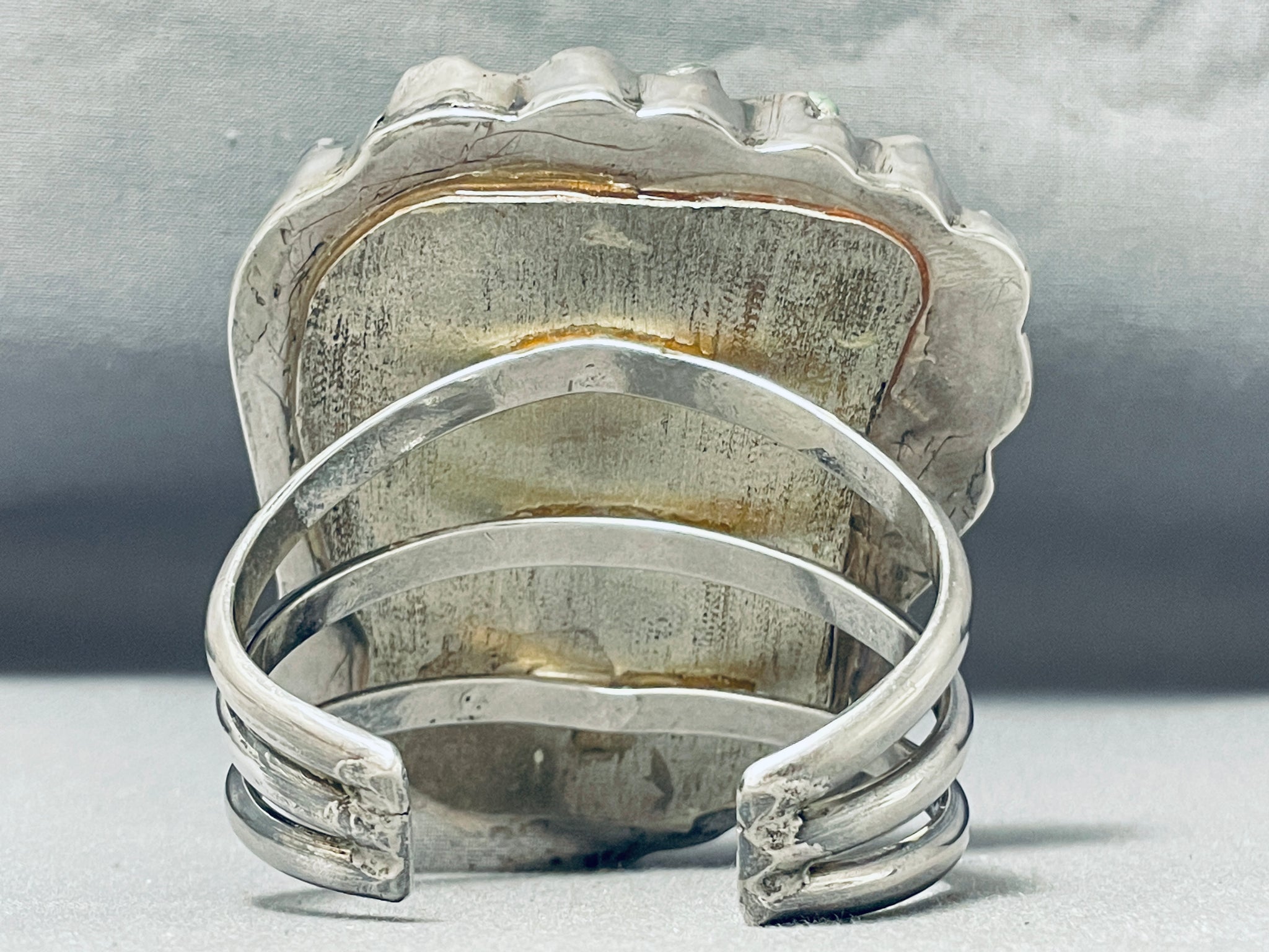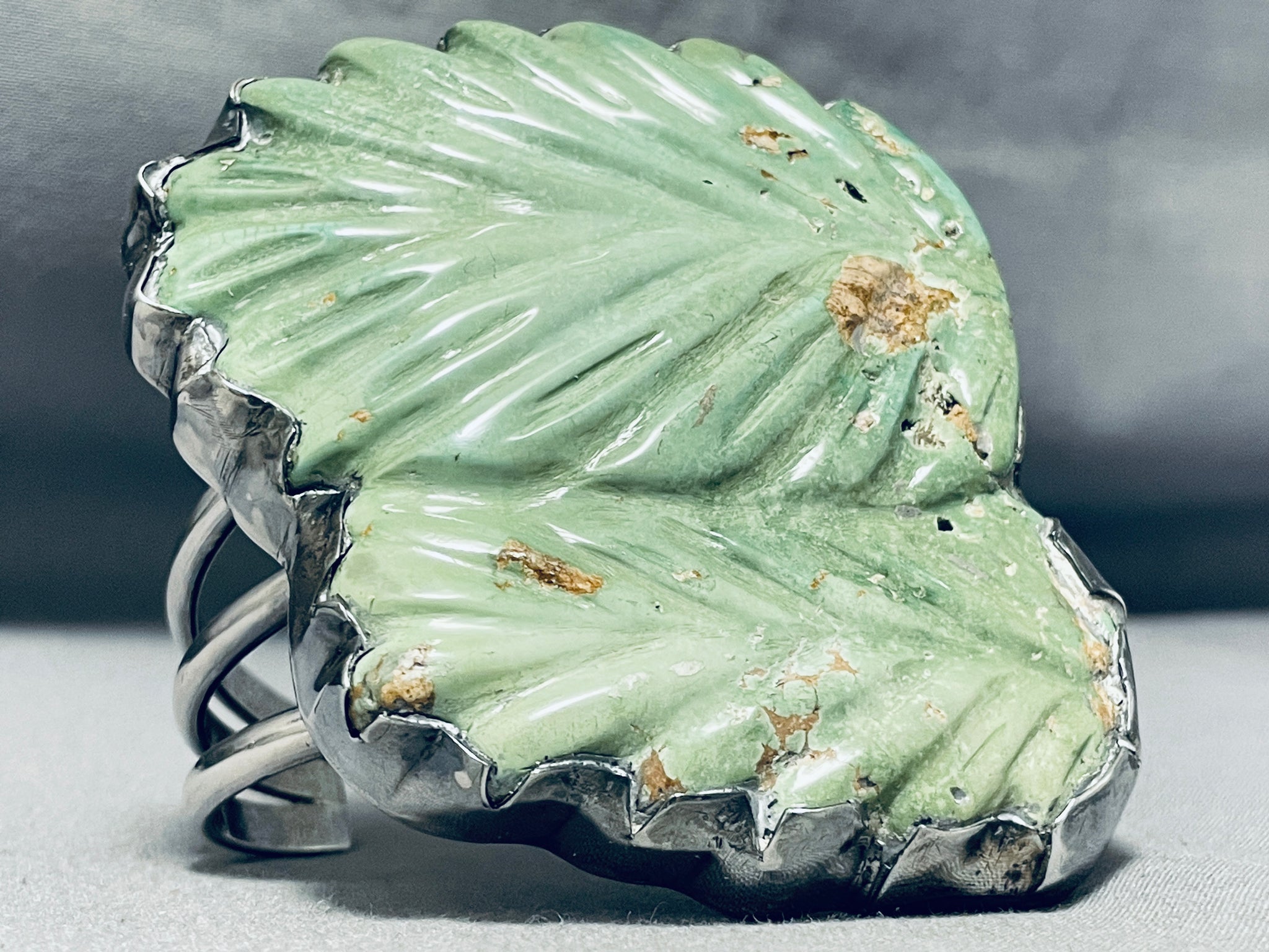 Biggest Hand Carved Green Turquoise Leaf Vintage Native American Navajo Sterling Silver Bracelet