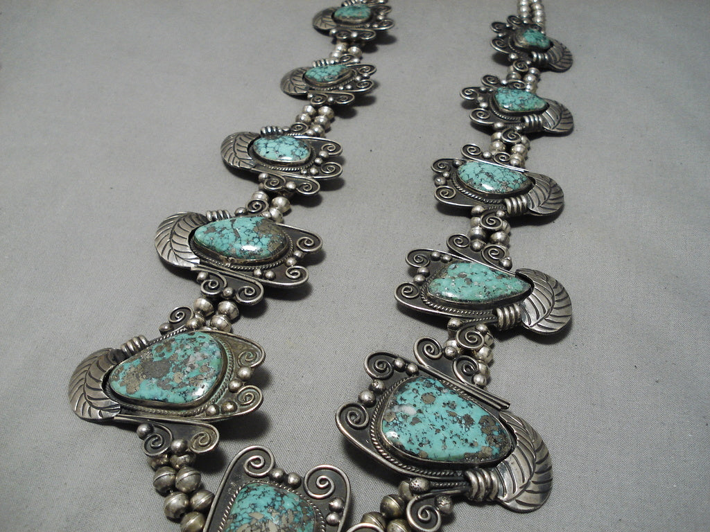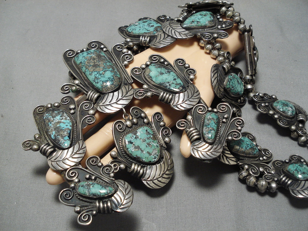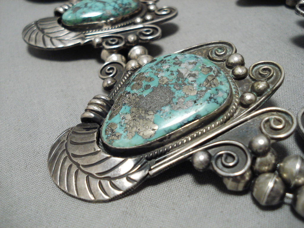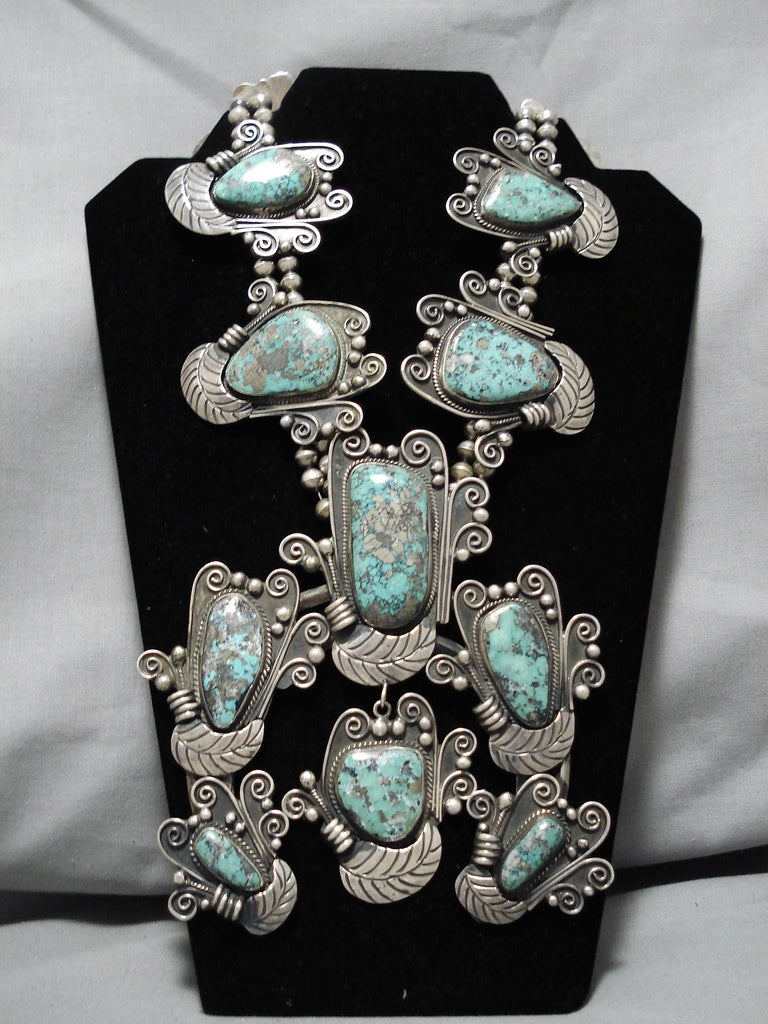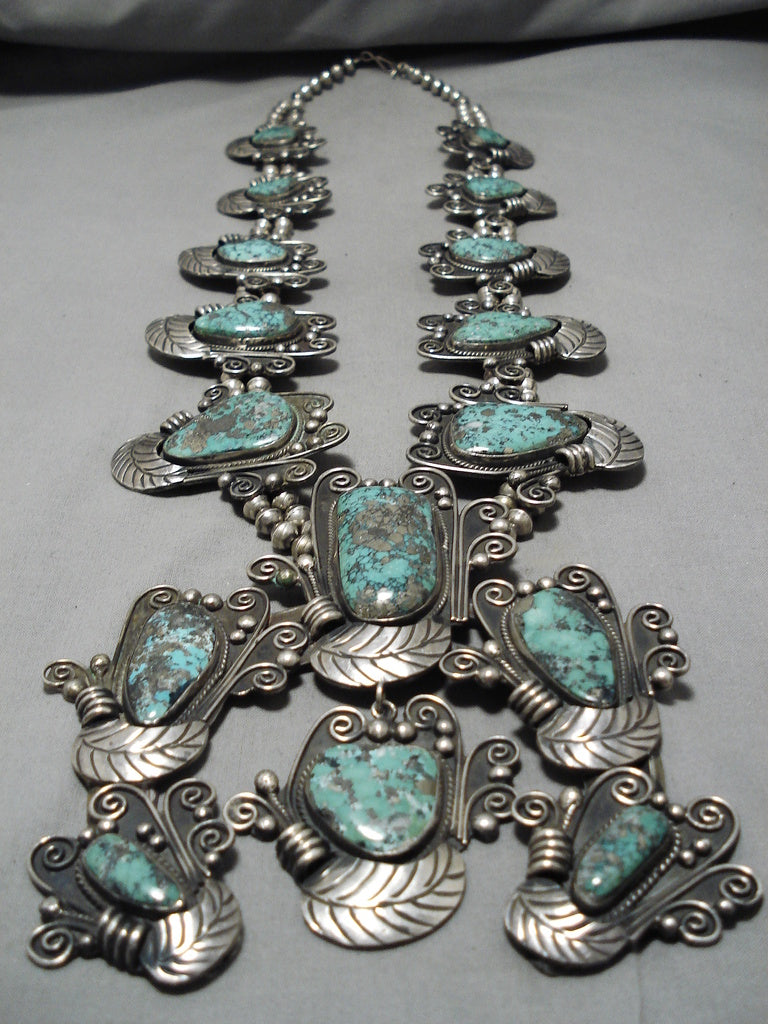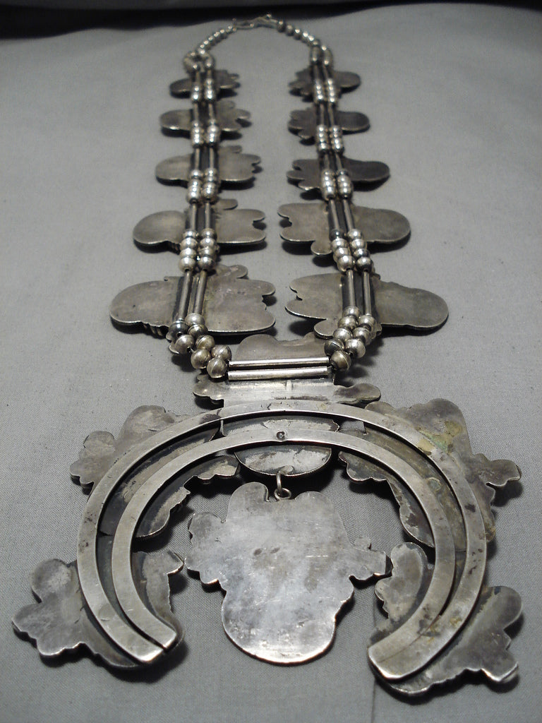 Biggest Vintage Native American Navajo Green Turquoise Sterling Silver Squash Blossom Necklace