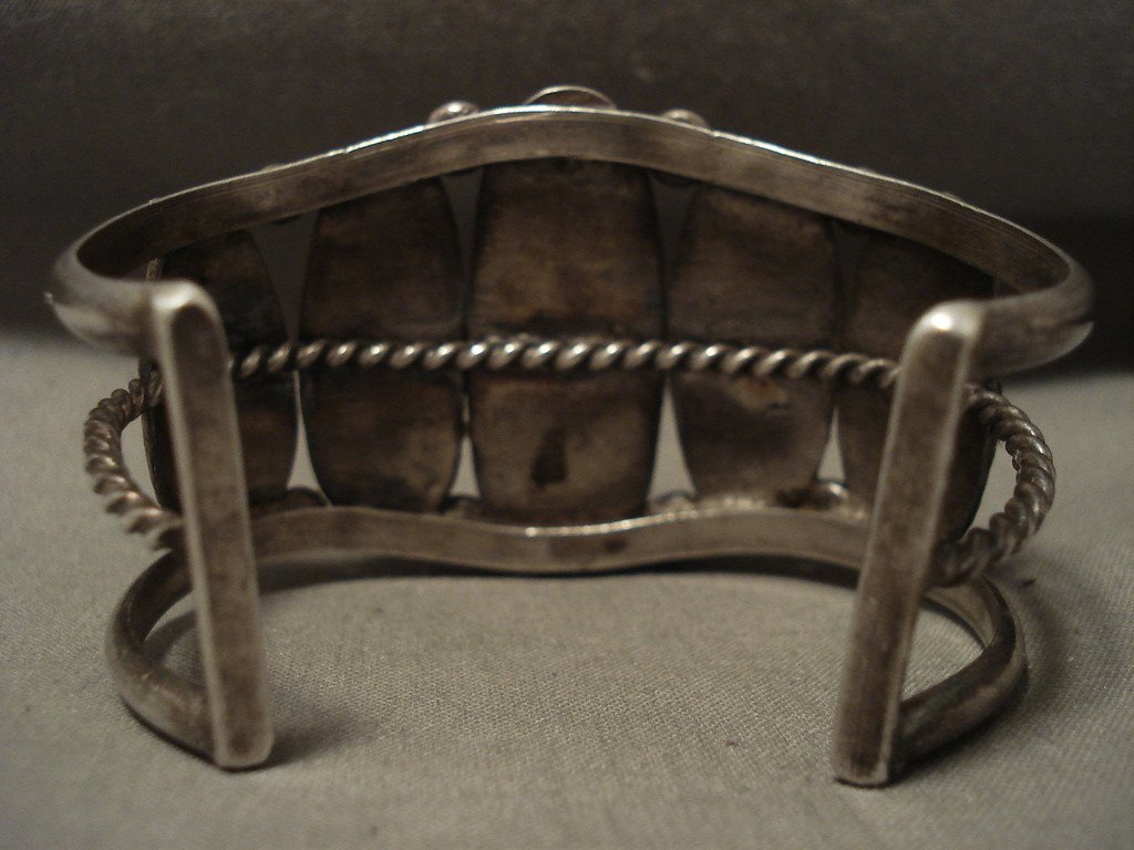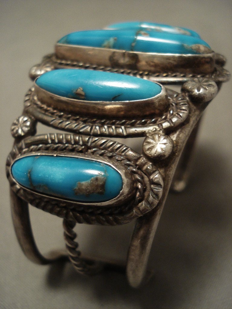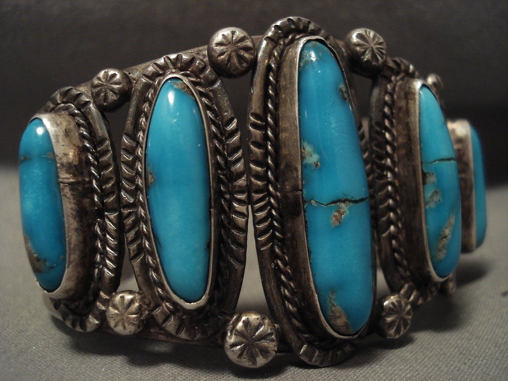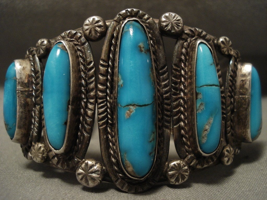 This is a breathtaking vintage Navajo Native American jewelry Native American jewelry museum quality silver bracelet. This piece contains five large Bisbee turquoise stones that beautifully graduate in size towards the center. This bracelet consists of absolutely incredible silver works that include ropes, segmented channels and shells. This piece contains a marvelous triple silver shank cuff with the center being hand twisted. This is a very old piece with phenomenal old natural patina. The center stone measures around 1-3/8" x 3/8". The width of the bracelet measures around 1-5/8". Sterling silver. Cir. 1930's-1950's. The inside end to end measures around 5-1/4" with an additional 1-1/4" gap. Sturdy 66 grams. LAYAWAYS- We are happy to work with you and are more flexible than anyone on the net. Simply send us an email for more information.