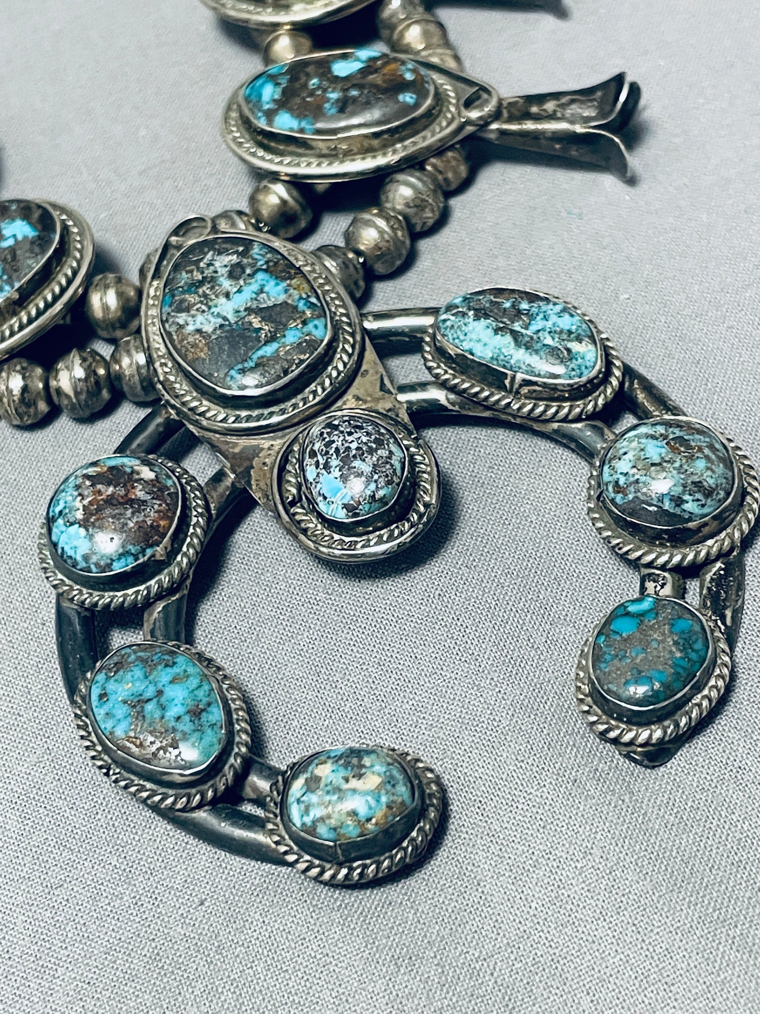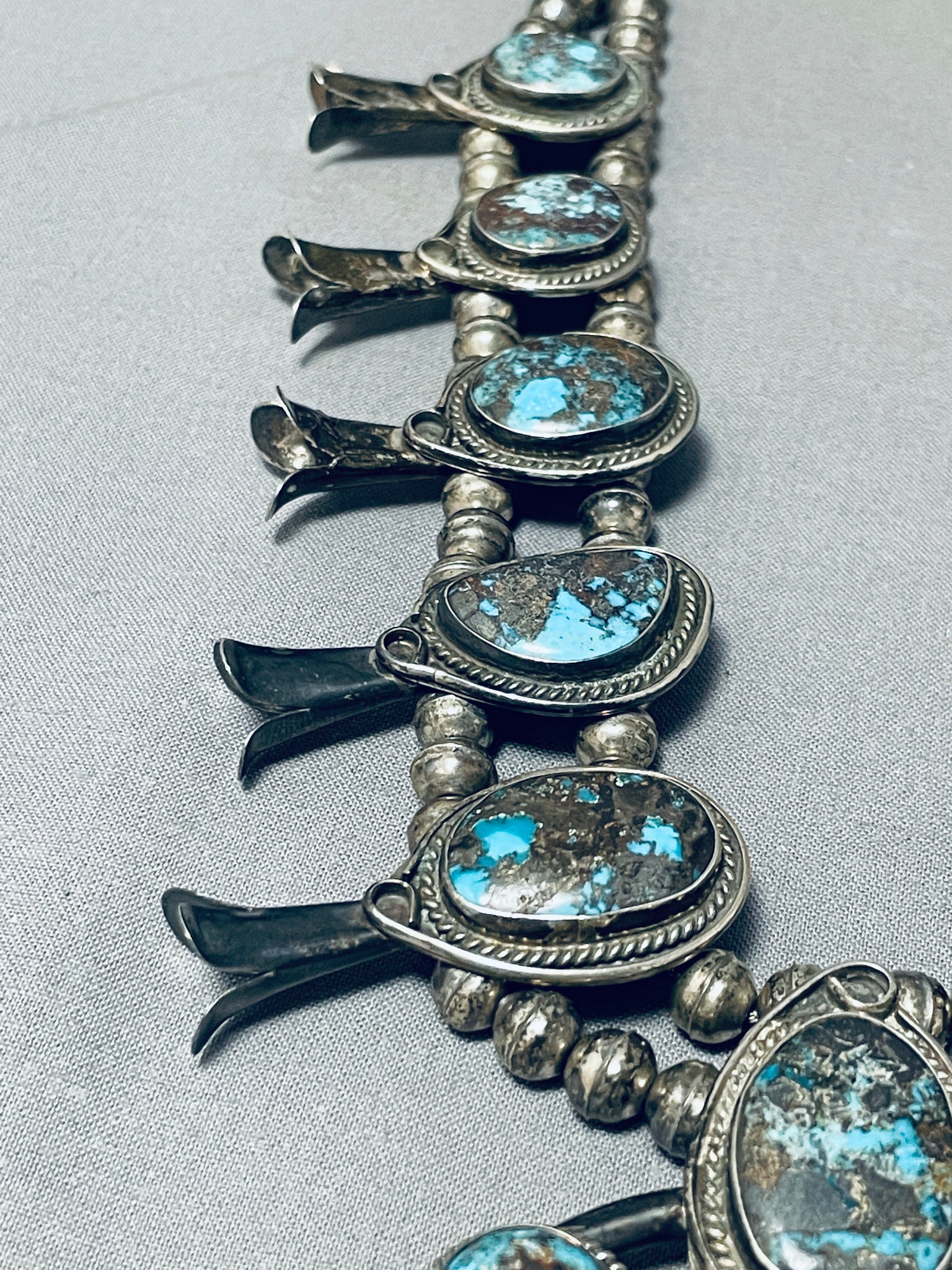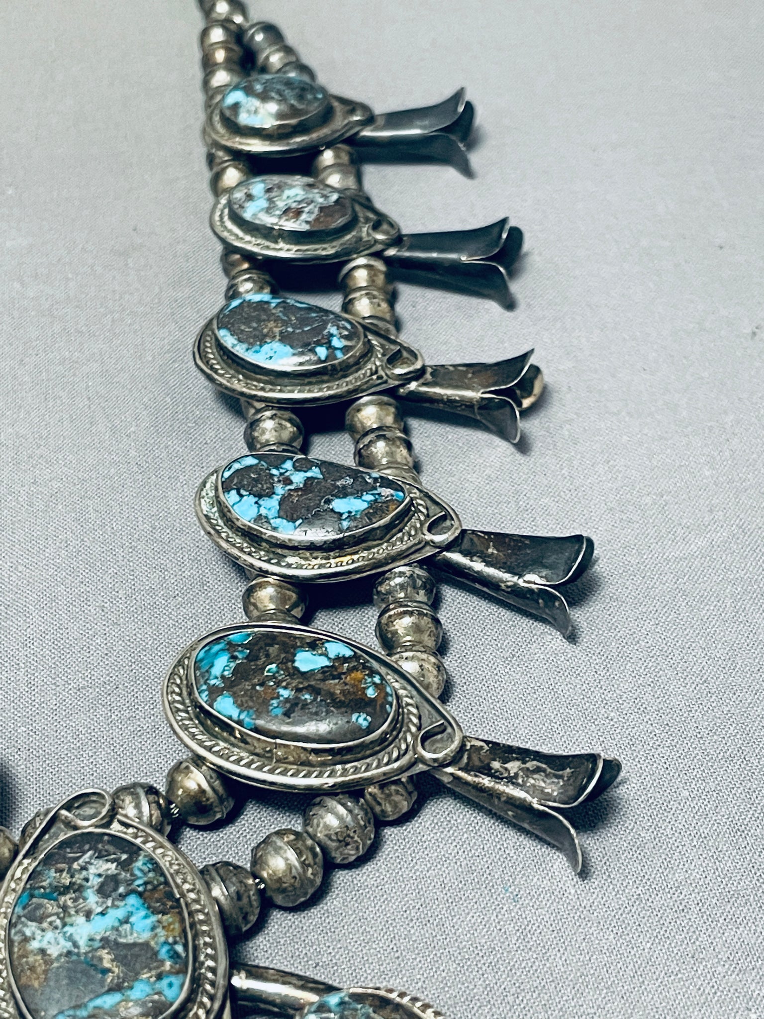 Bisbee Turquoise Vintage Native American Navajo Sterling Silver Squash Blossom Necklace