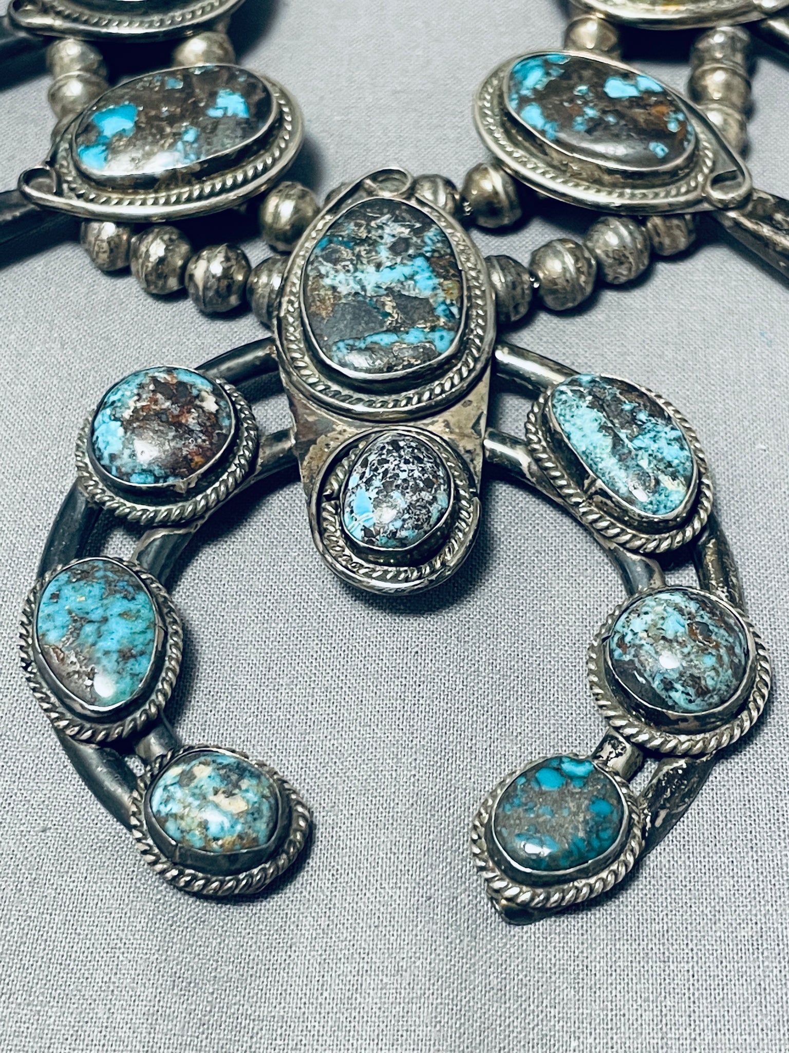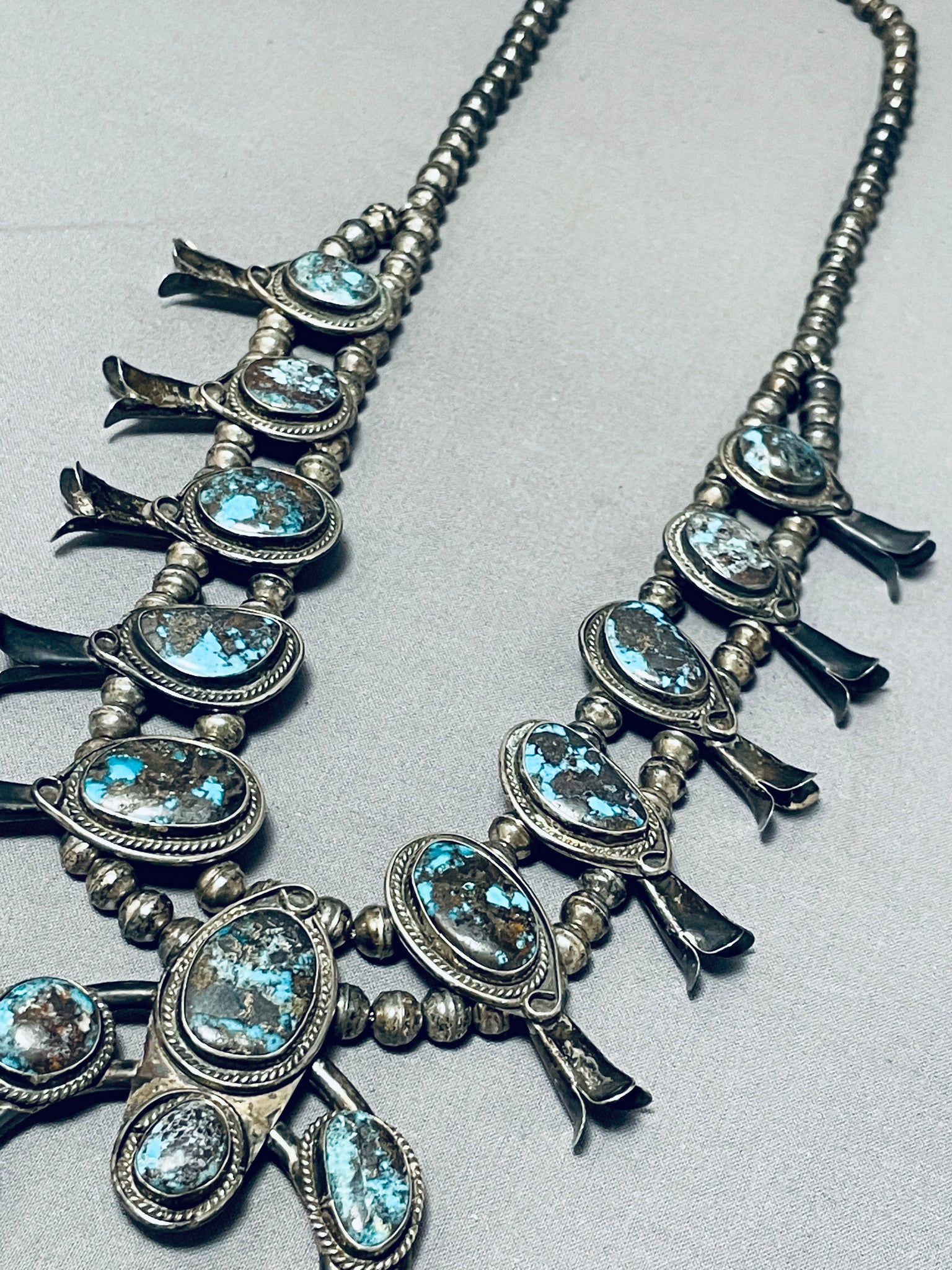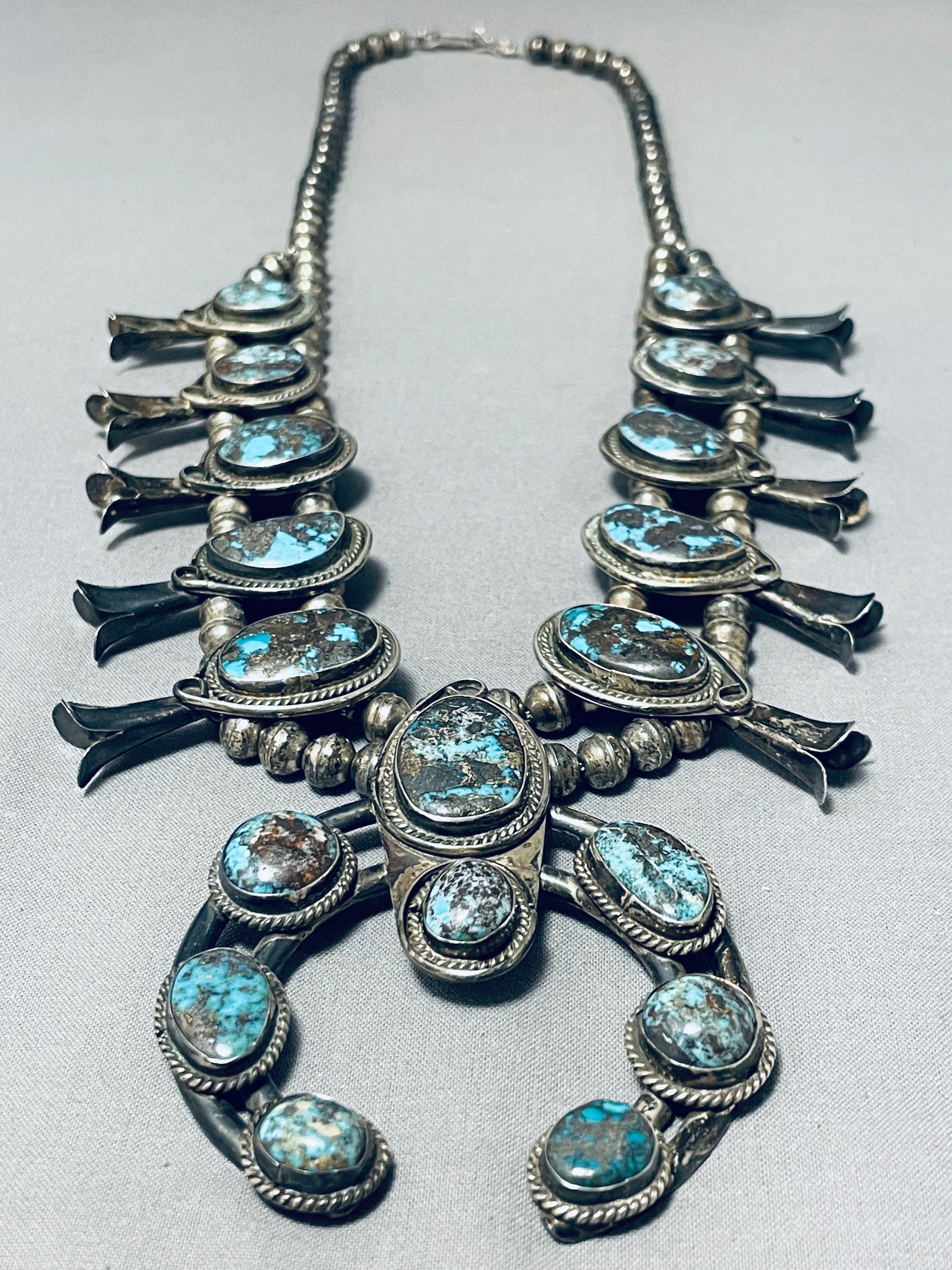 Bisbee Turquoise Vintage Native American Navajo Sterling Silver Squash Blossom Necklace