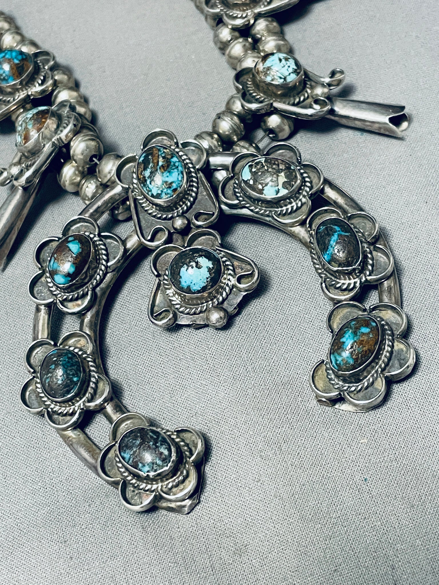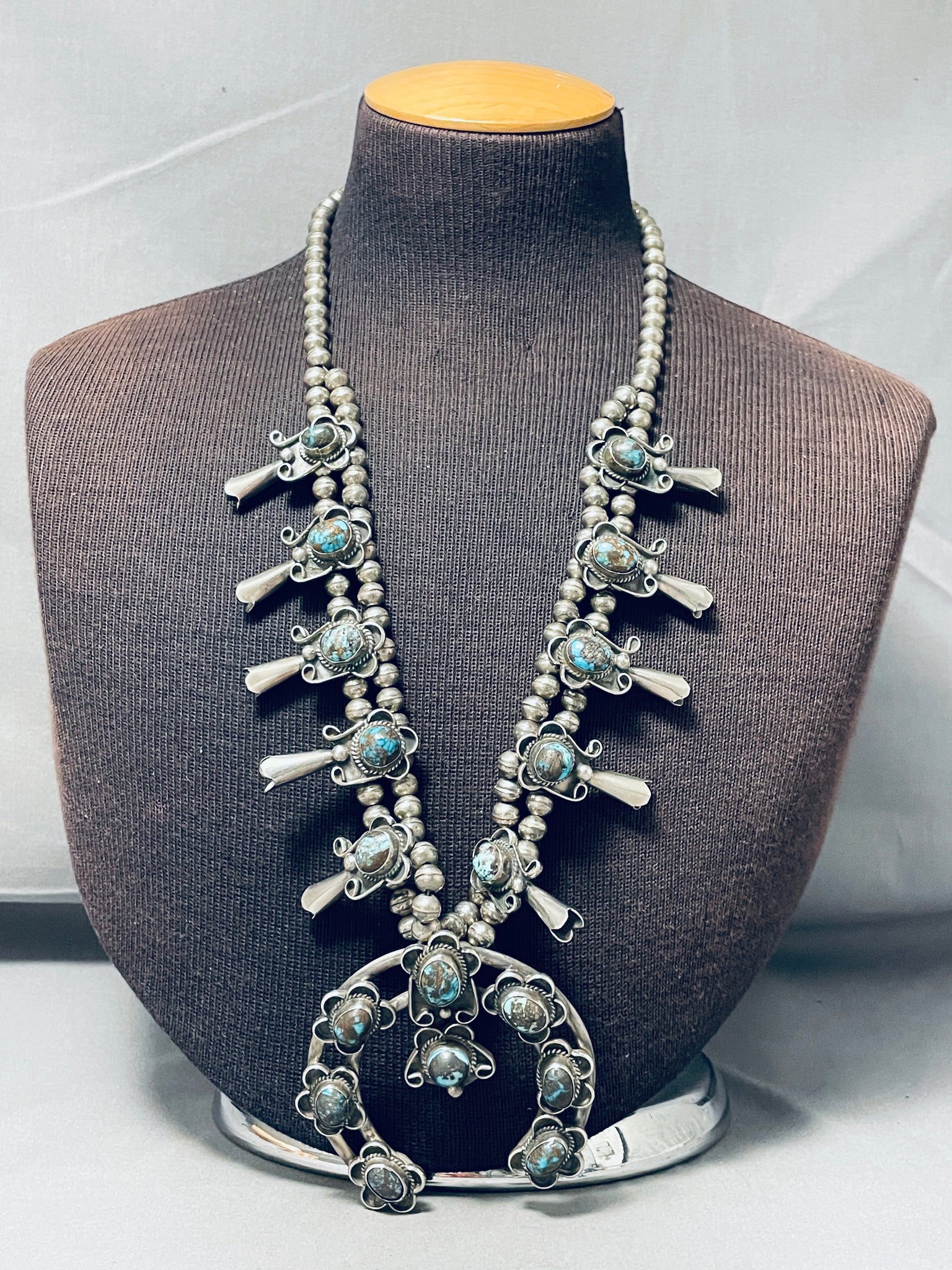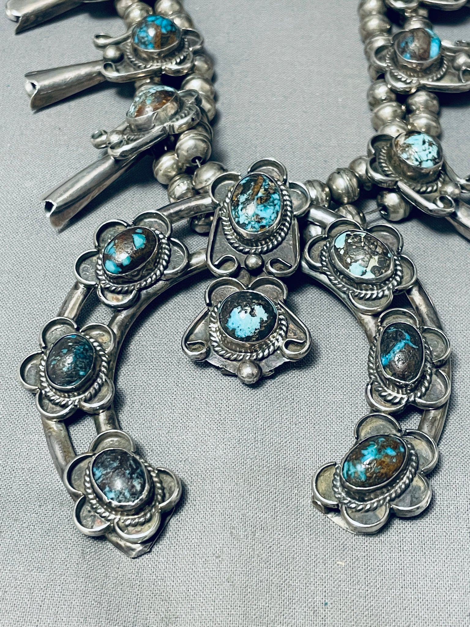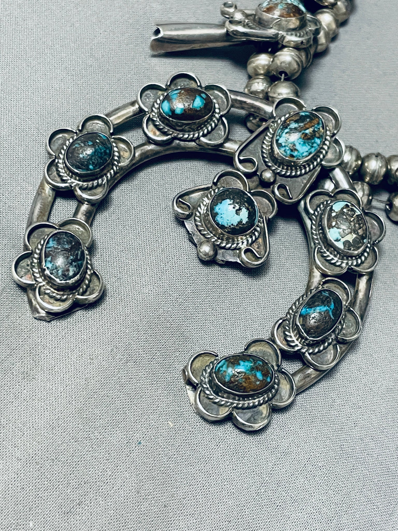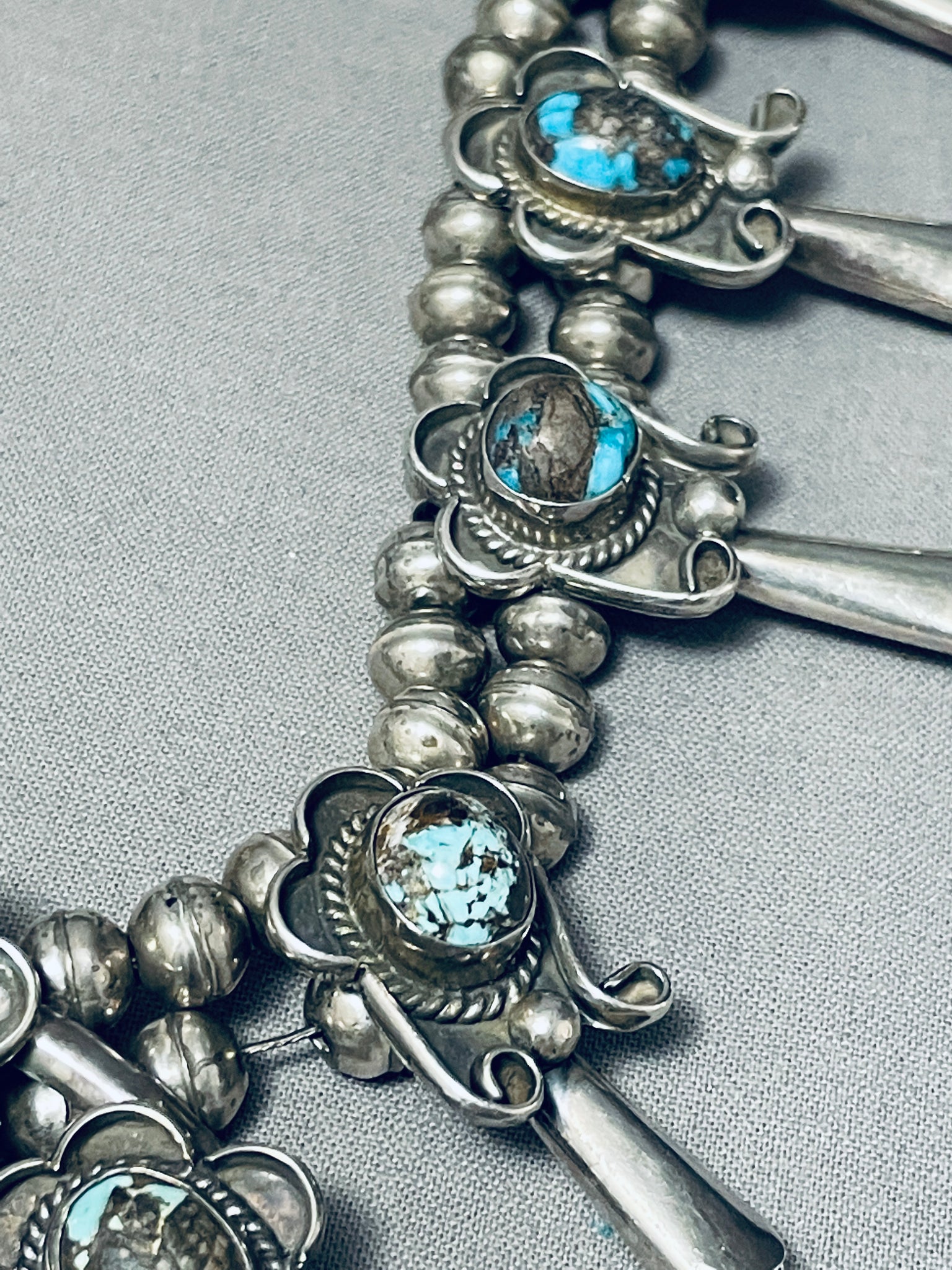 Bisbee Turquoise Vintage Native American Navajo Sterling Silver Squash Blossom Necklace