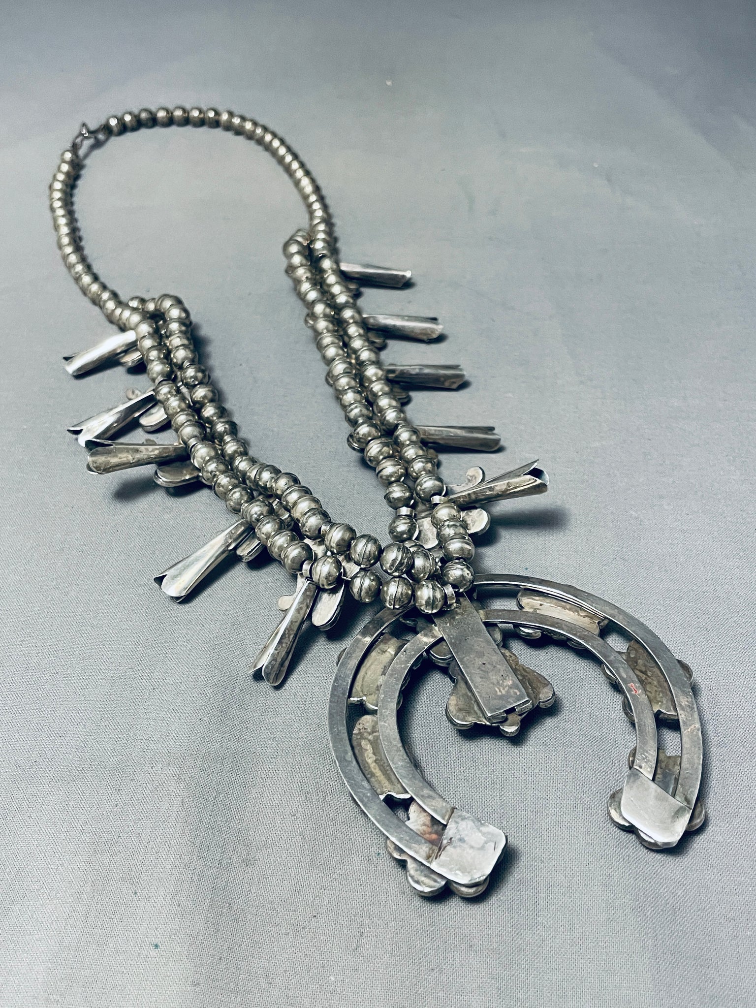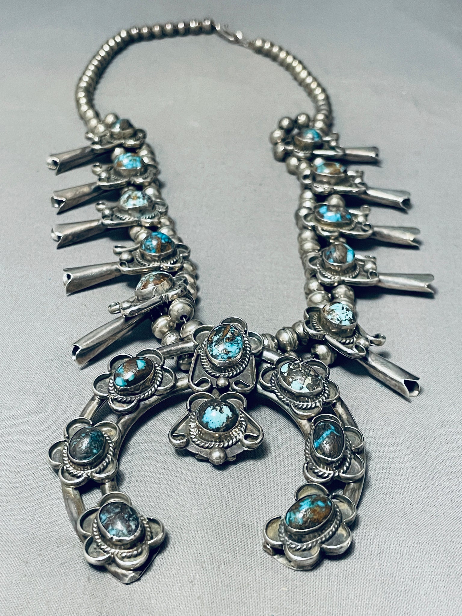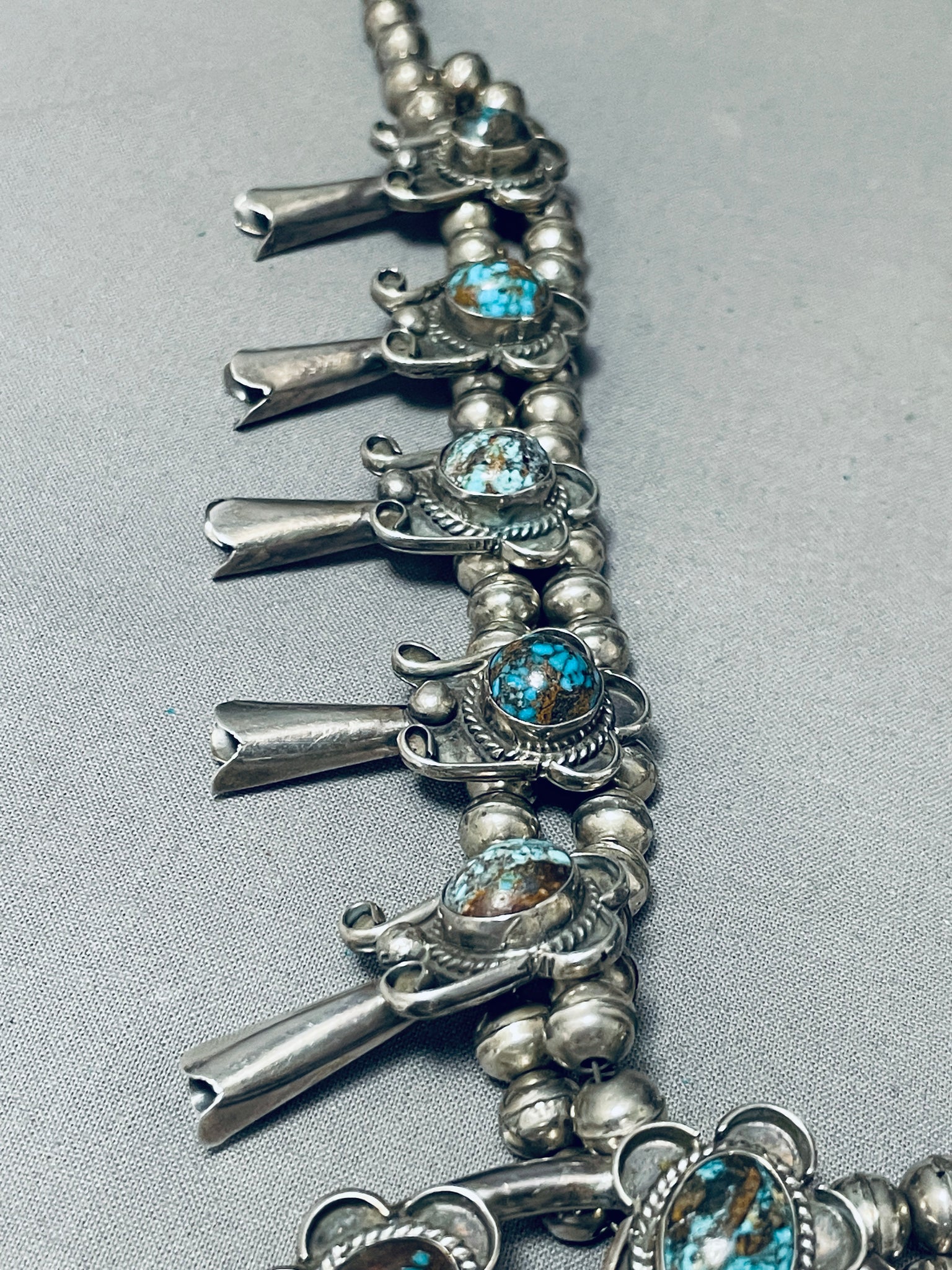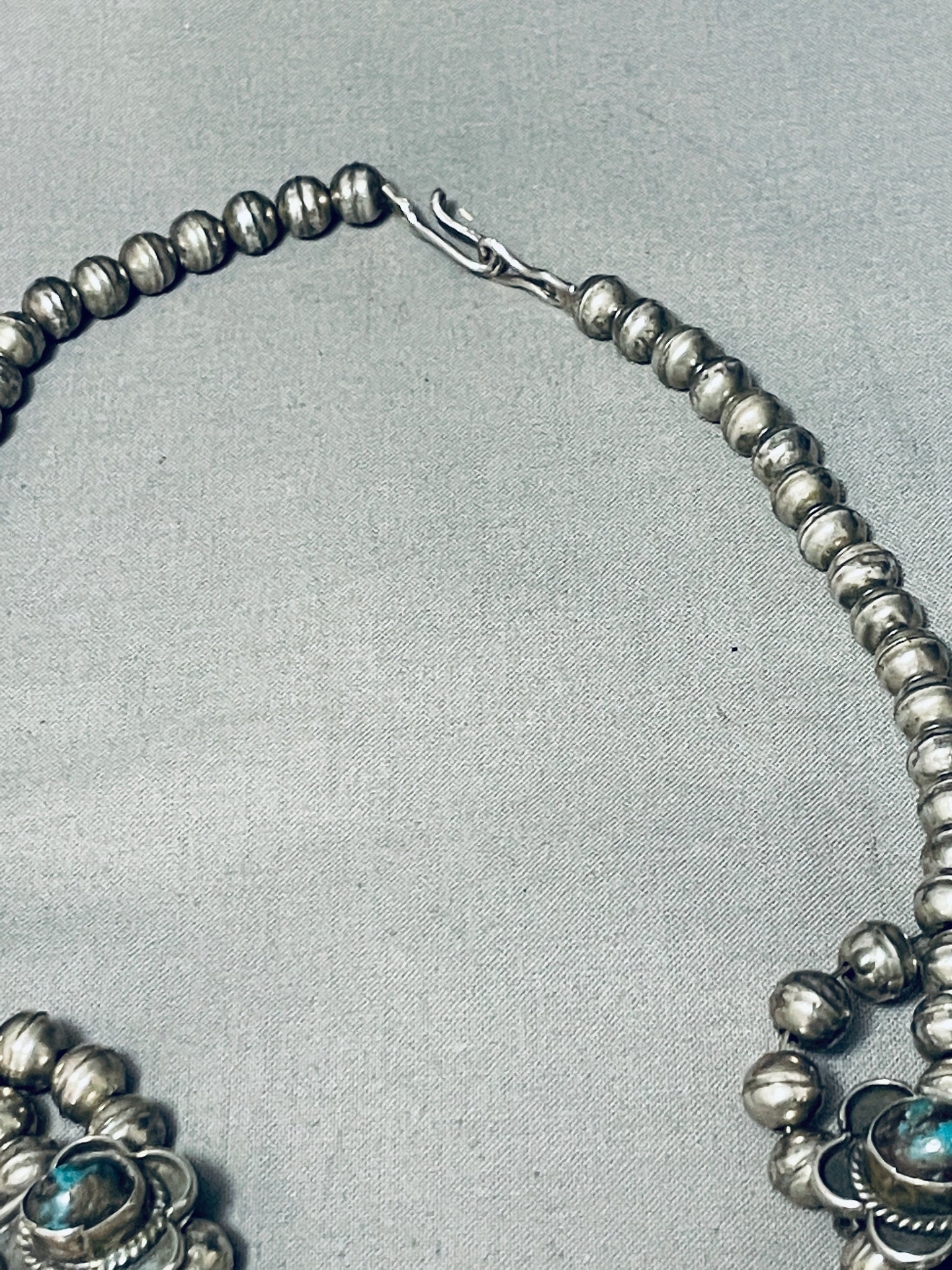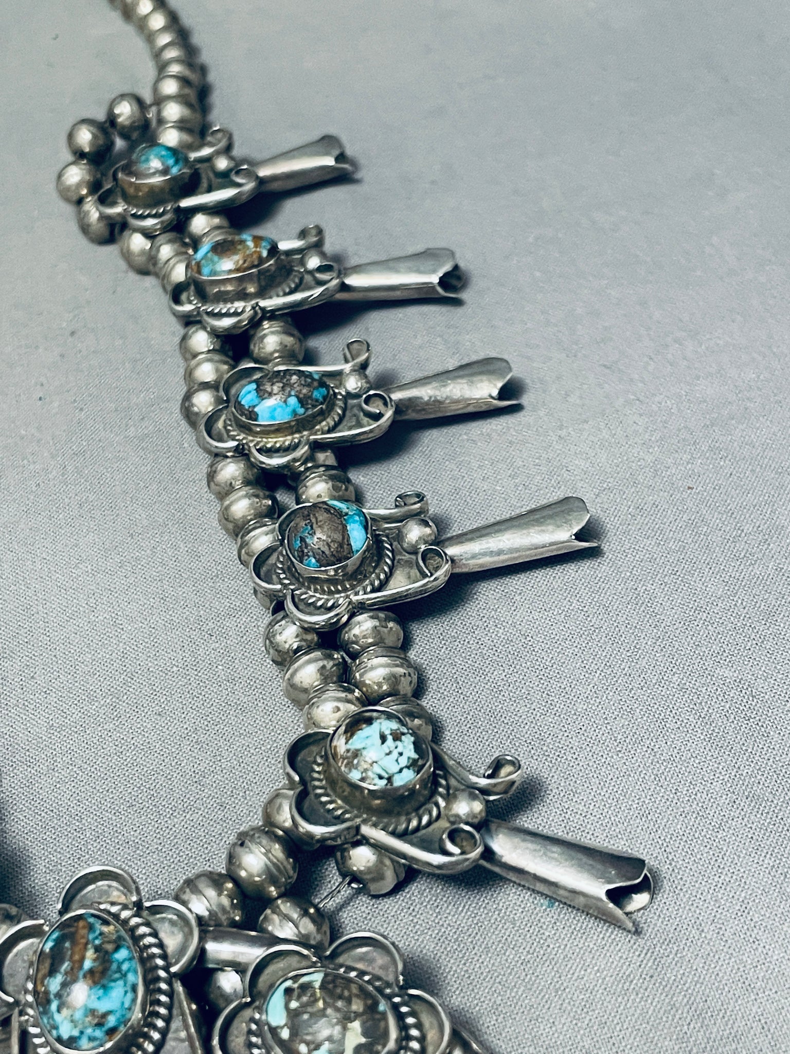 Bisbee Turquoise Vintage Native American Navajo Sterling Silver Squash Blossom Necklace