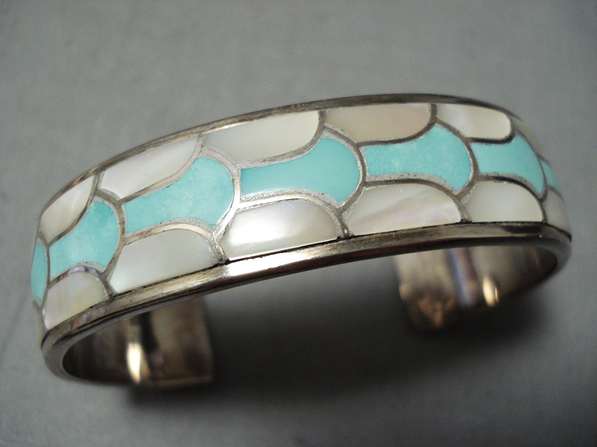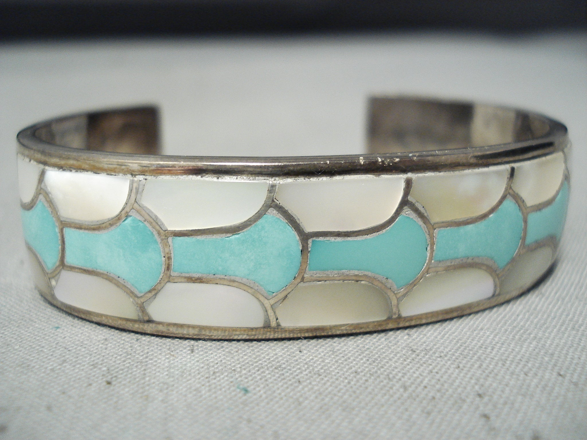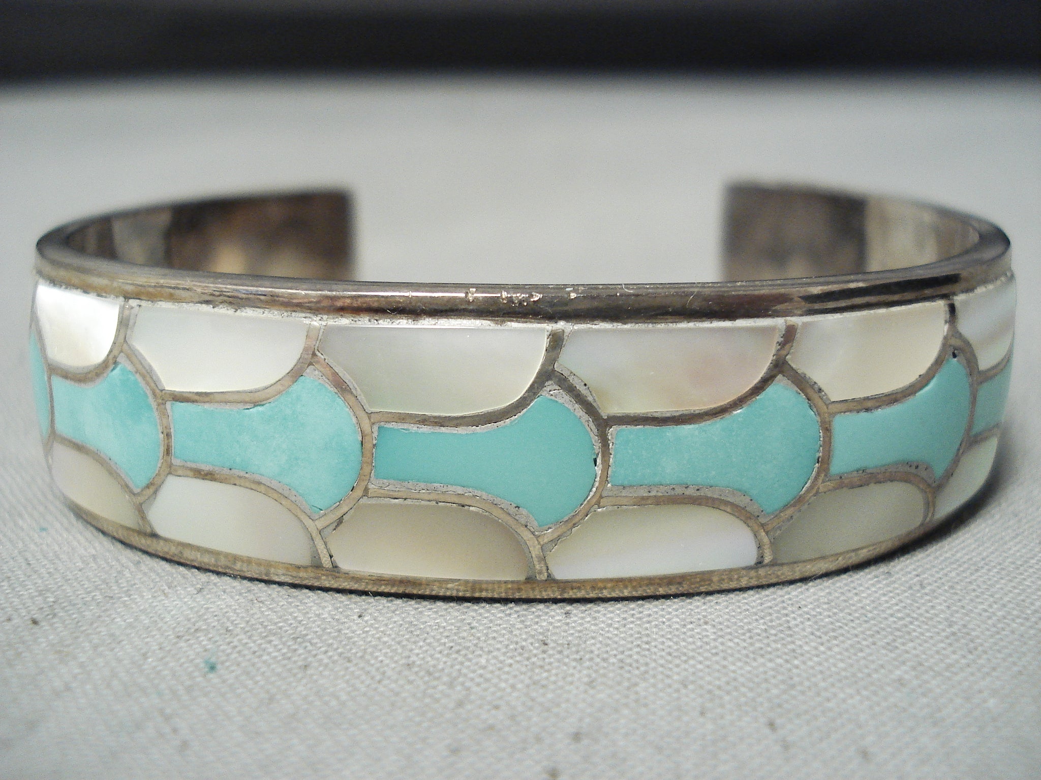 Bneautiful Vintage Native American Zuni Turquoise Pearl Sterling Silver Inlay Bracelet Old