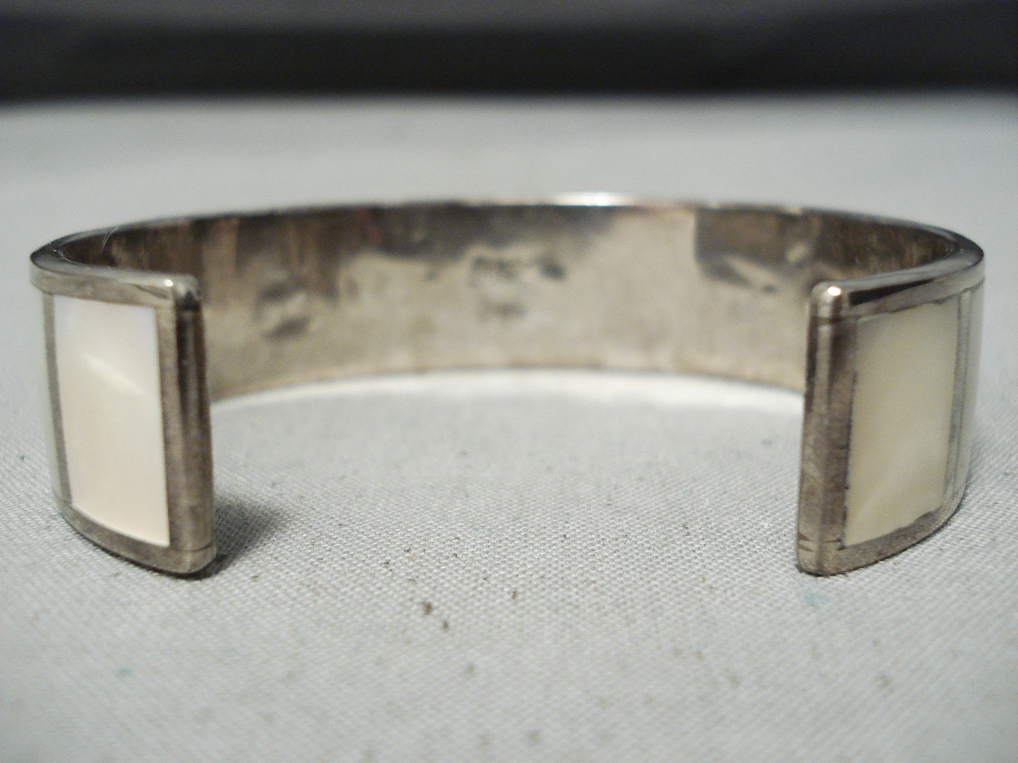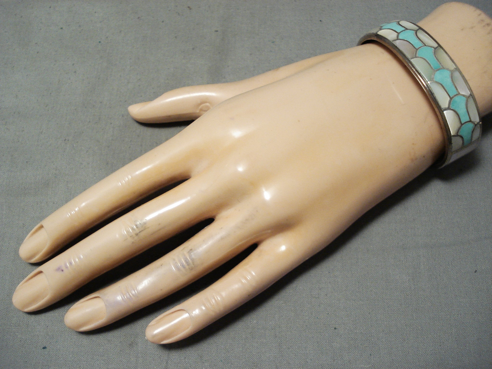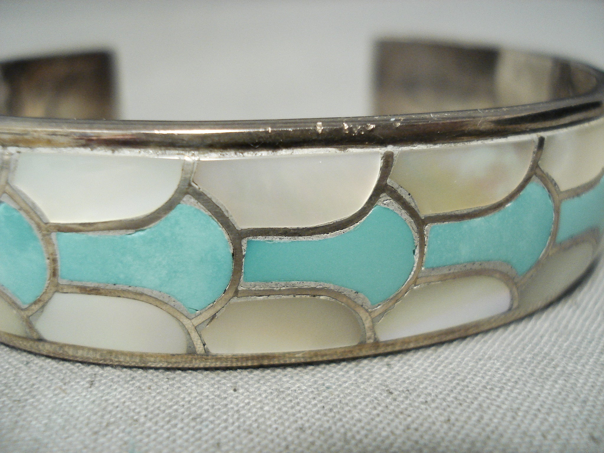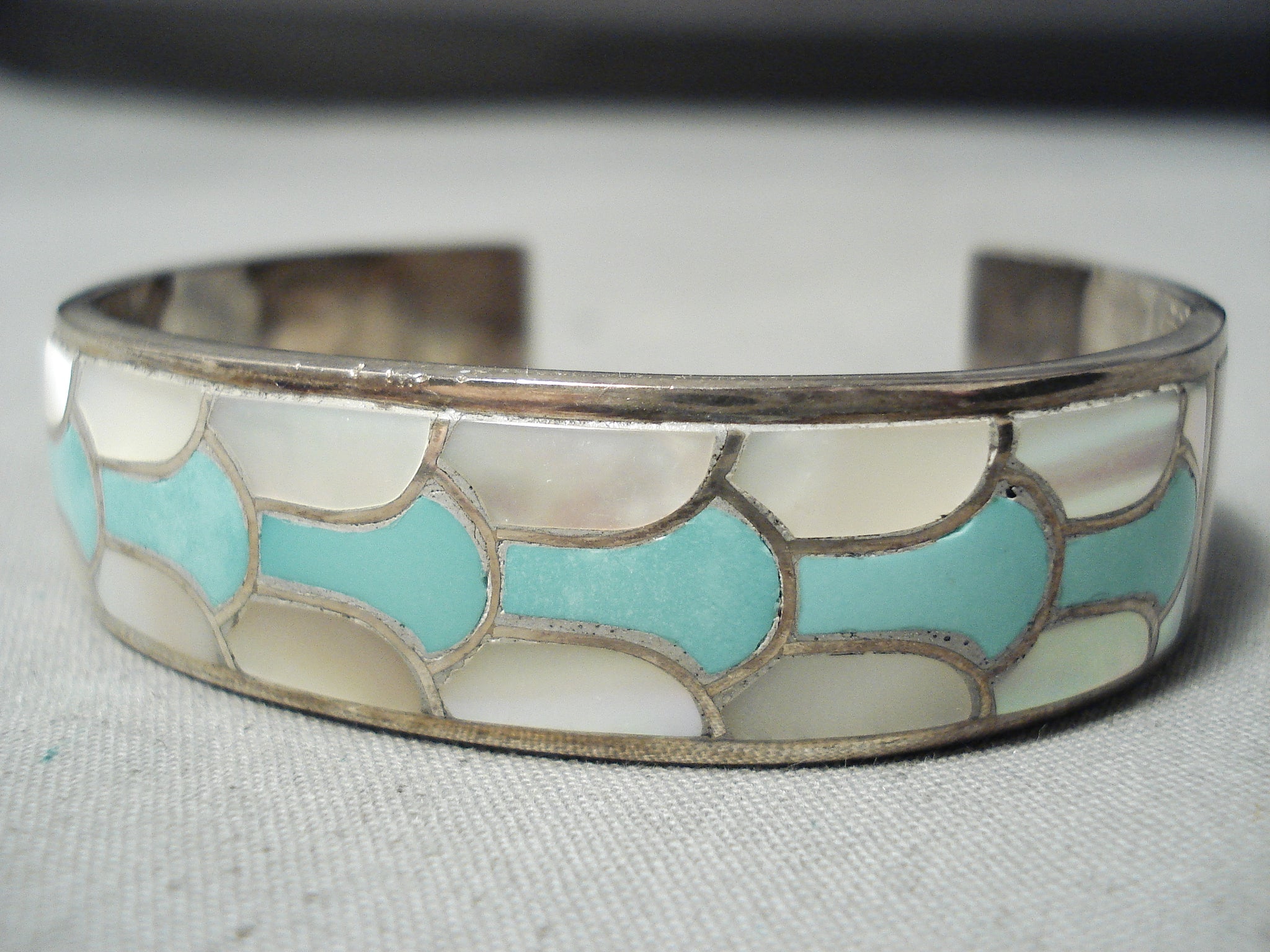 Bneautiful Vintage Native American Zuni Turquoise Pearl Sterling Silver Inlay Bracelet Old
