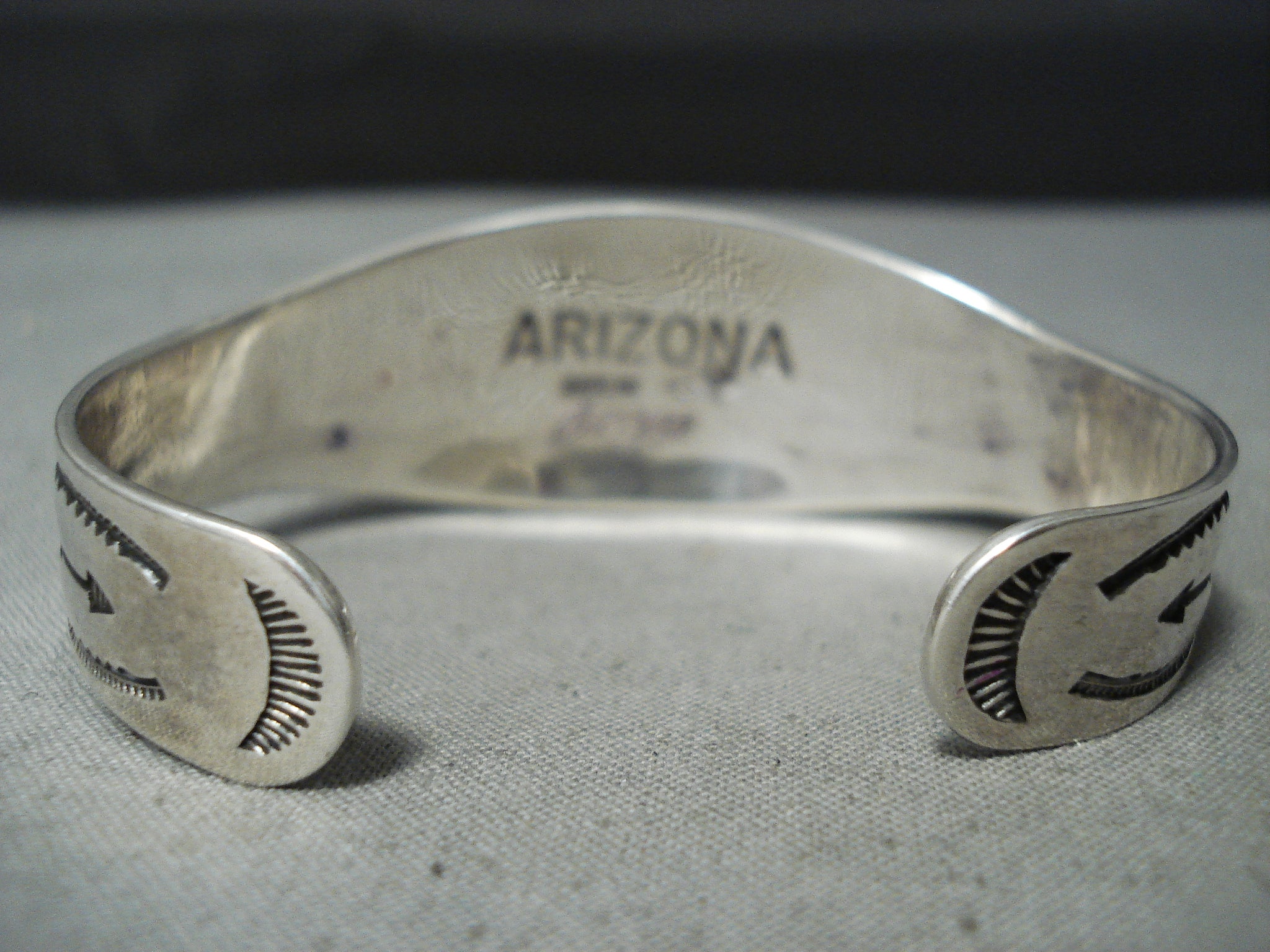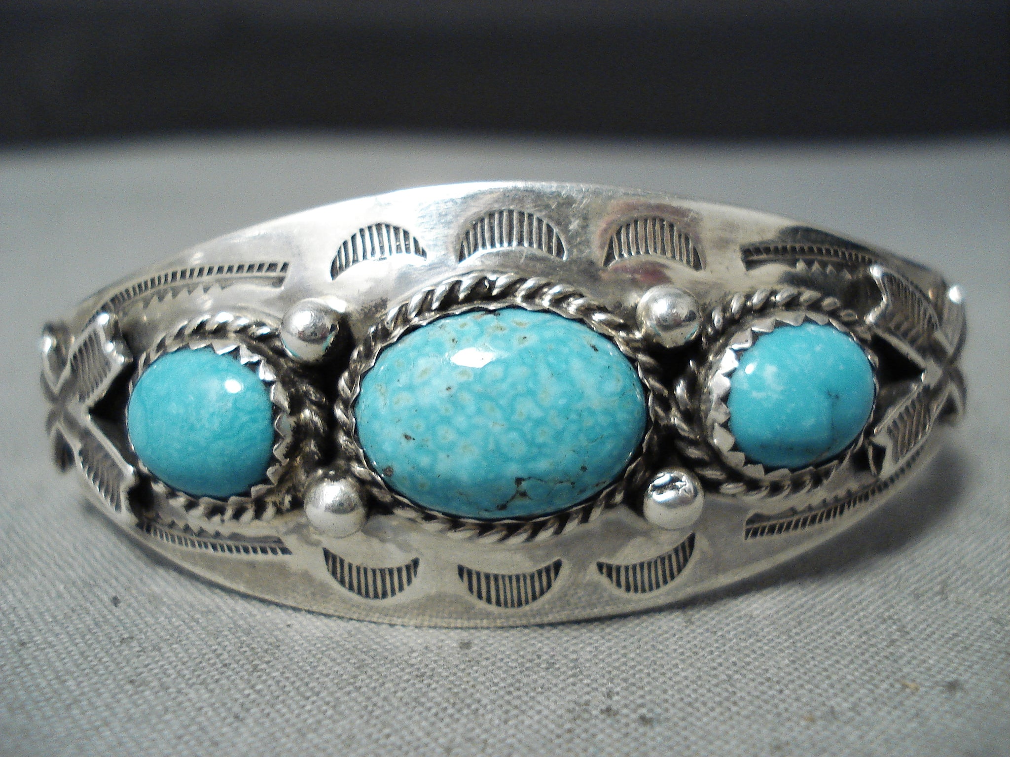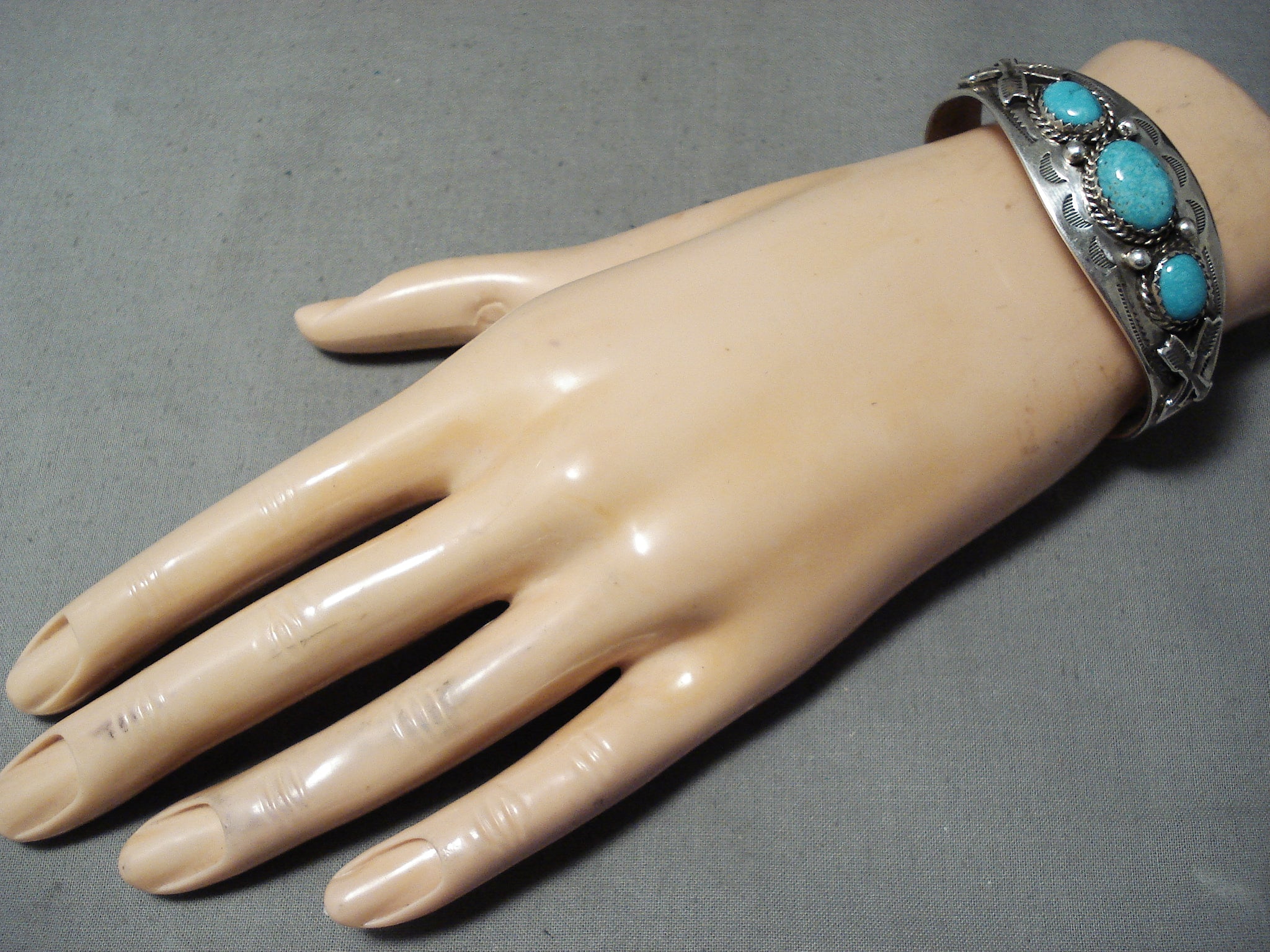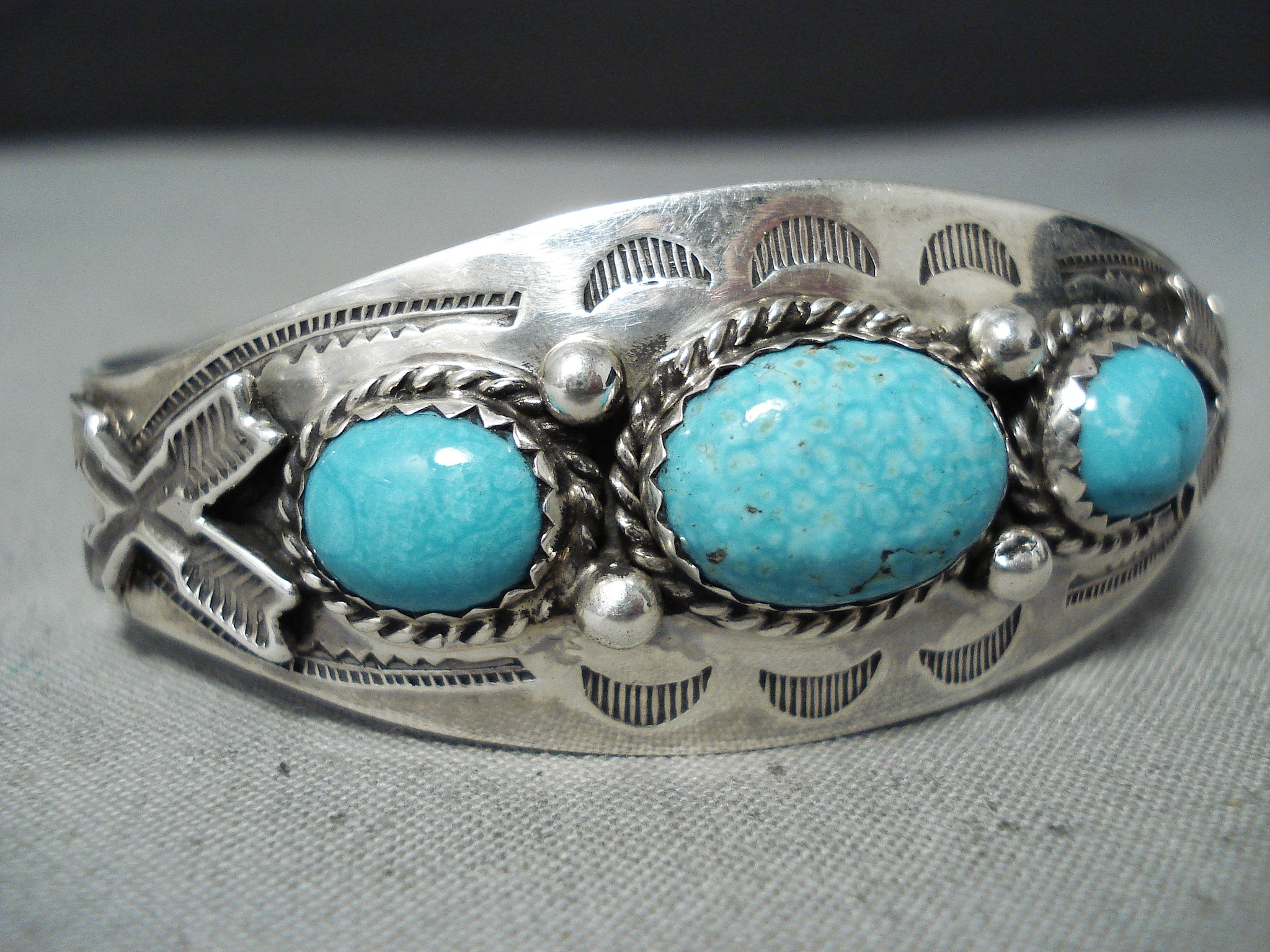 We are proud to offer this superlative Navajo silver bracelet. These 3 vivid oval Kingman turquoise stones are horizontally set across the face of the cuff – with the surrounding arrow motif! The center stone measures around 1/2" x 3/8". The width of the bracelet measures around 7/8". Signed by Navajo artist, Boyd. Sterling silver, marked. The inside end to end measures around 5-1/2" with an additional 1" gap. Sturdy 34 grams.