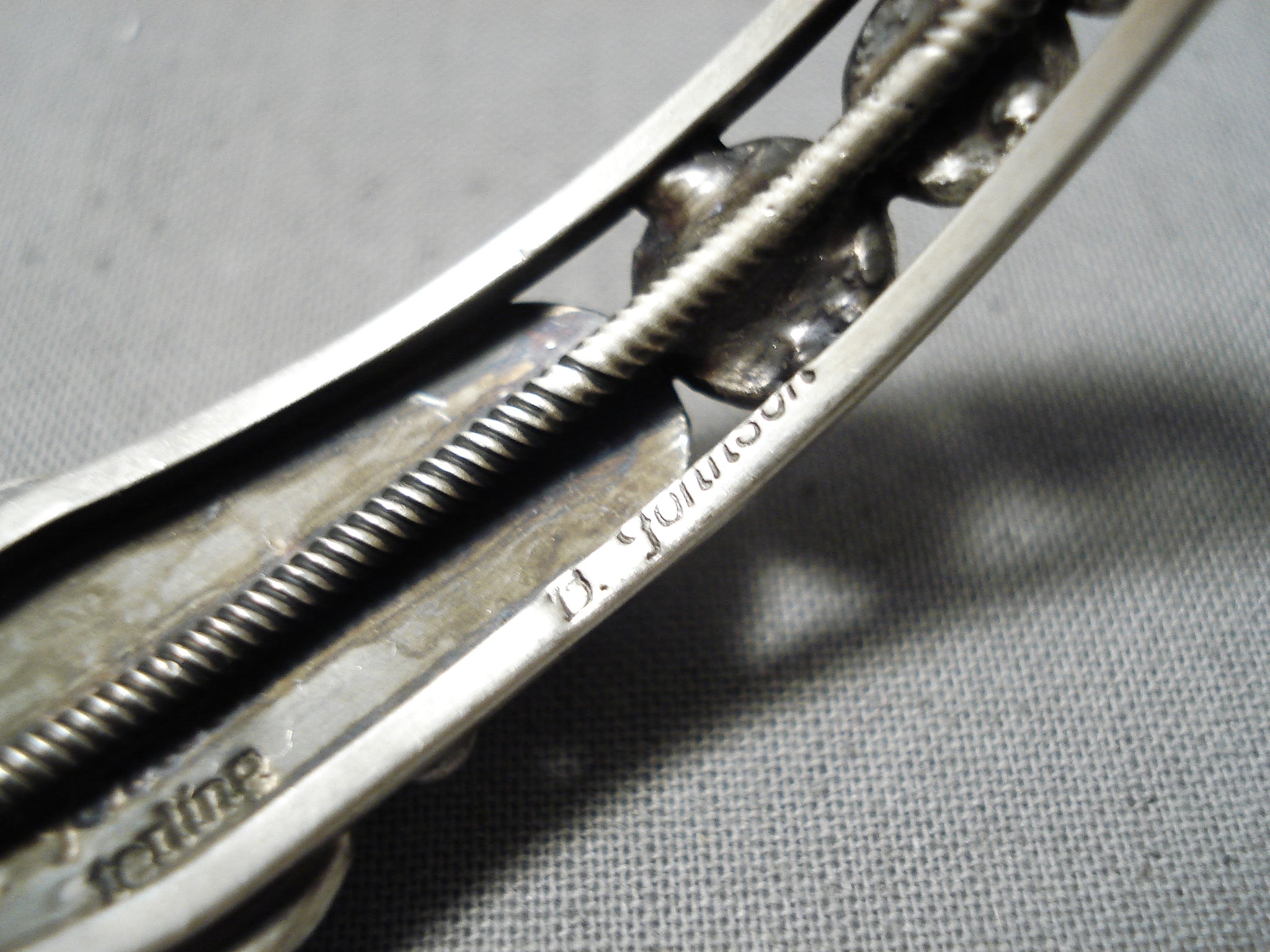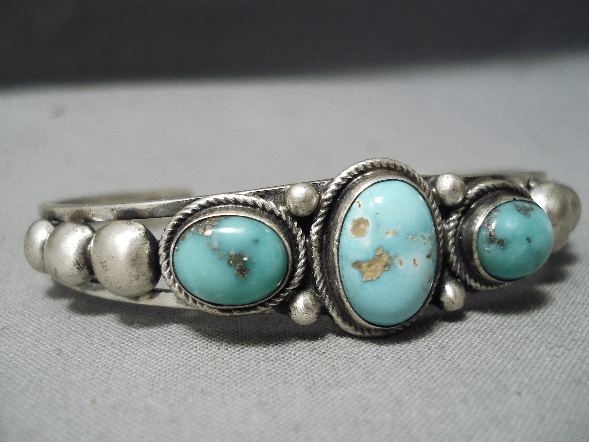 This is an exquisite vintage Navajo three stone silver bracelet. This amazing piece contains three dome shaped vivid Carico Lake turquoise stones. Surrounding the stones are amazing silver raindrops and ropes. Resting at the sides of the triple silver shank cuff are marvelous and large graduating silver raindrops. The center stone measures around 1/2" x 3/8". The width of the bracelet measures around 1/2". Signed by Navajo artist, B. Johnson . Sterling silver, marked. Cir. 1970's+. The inside end to end measures around 5-3/4" with an additional 1" gap. Sturdy 24 grams.